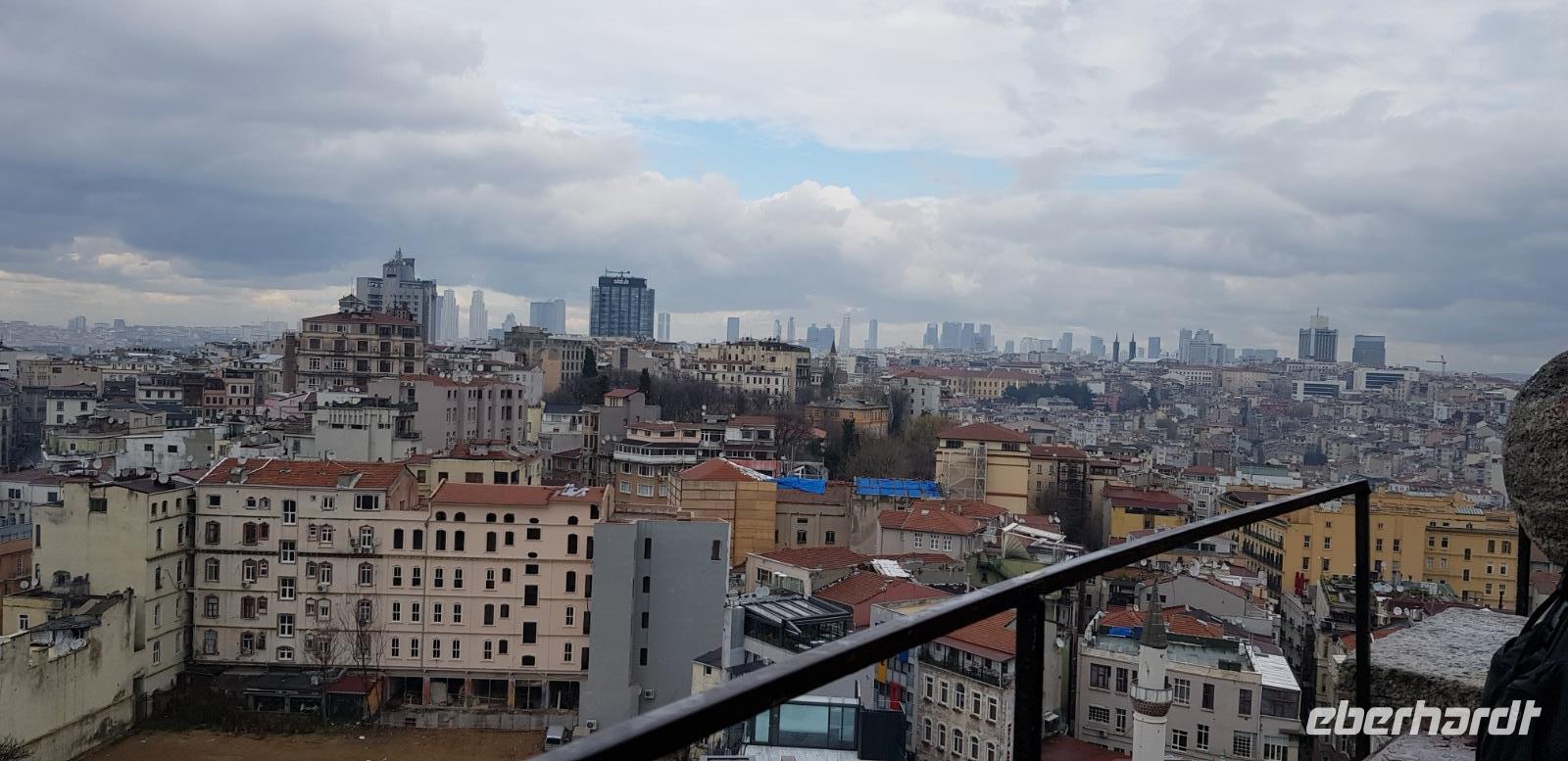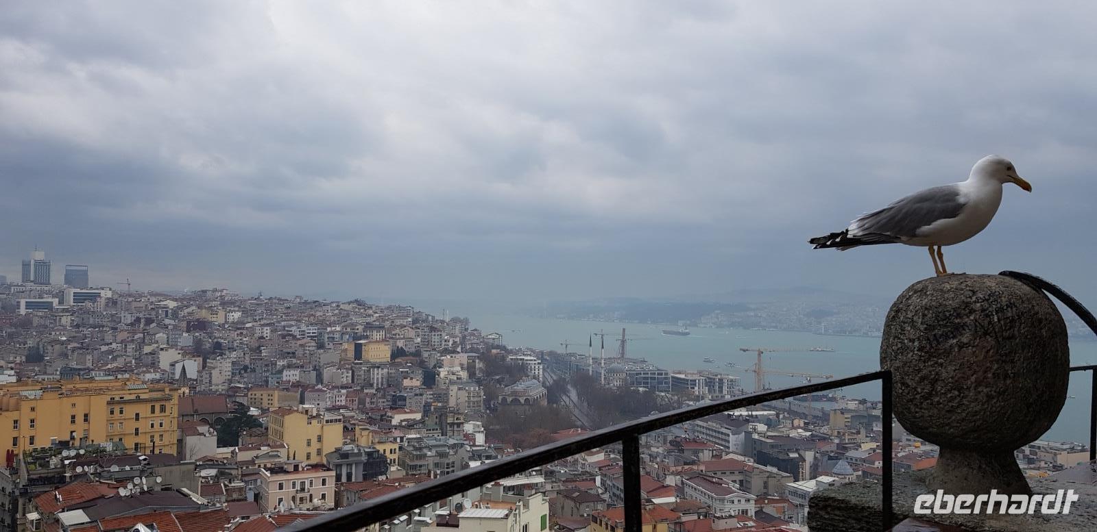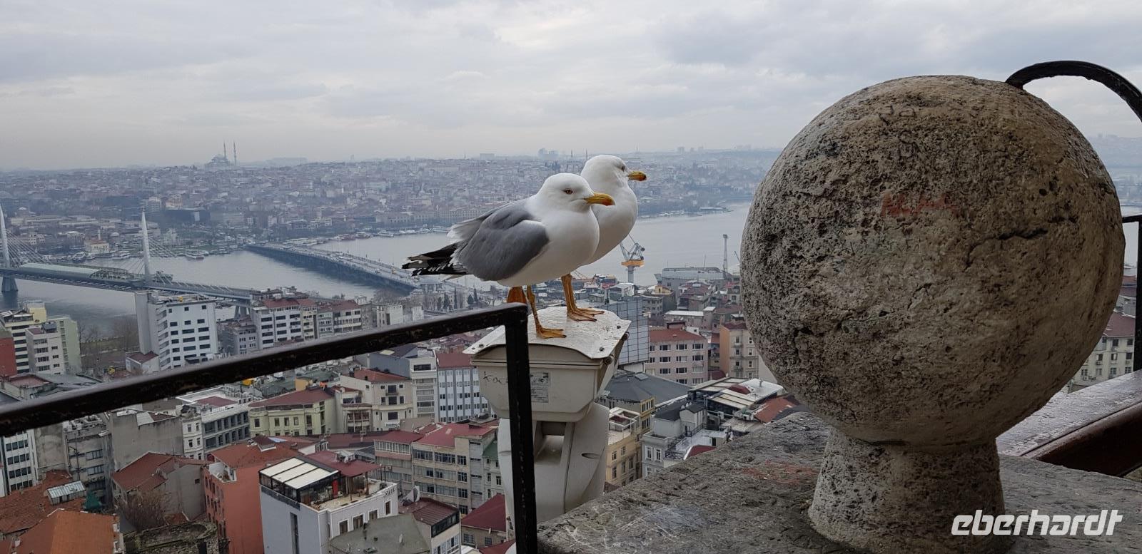 Heute ist auch in Istanbul Feiertag und da ist nicht alles geöffnet, deshalb haben wir unseren Besichtigungsplan etwas geändert. Nach dem gemütlichen Frühstück im Hotel starten wir 11.00 Uhr zu unseren Besichtigungen. Der Bus holt uns ab. Wir fahren über die Galata Brücke zum Galata Turm. Serdar hofft, dass jetzt dort noch nicht so viele Besucher sind, denn die Aussichtsgalerie ist sehr eng und klein und da gibt es dann lange Wartezeiten. Wir sind zum richtigen Zeitpunkt am Turm und können nach einer kurzen Wartezeit auf den Turm hinauf fahren. Von der Aussichtsgalerie aus bietet sich ein toller Blick auf die Stadt. So bekommen wir eine Vorstellung von der Größe der Stadt und der herrlichen Lage. Nachdem wir uns sattgesehen haben fahren wir wieder hinunter und weiter geht es ein Stück zu Fuß durch die engen Gassen des Stadtviertels Karaköy.