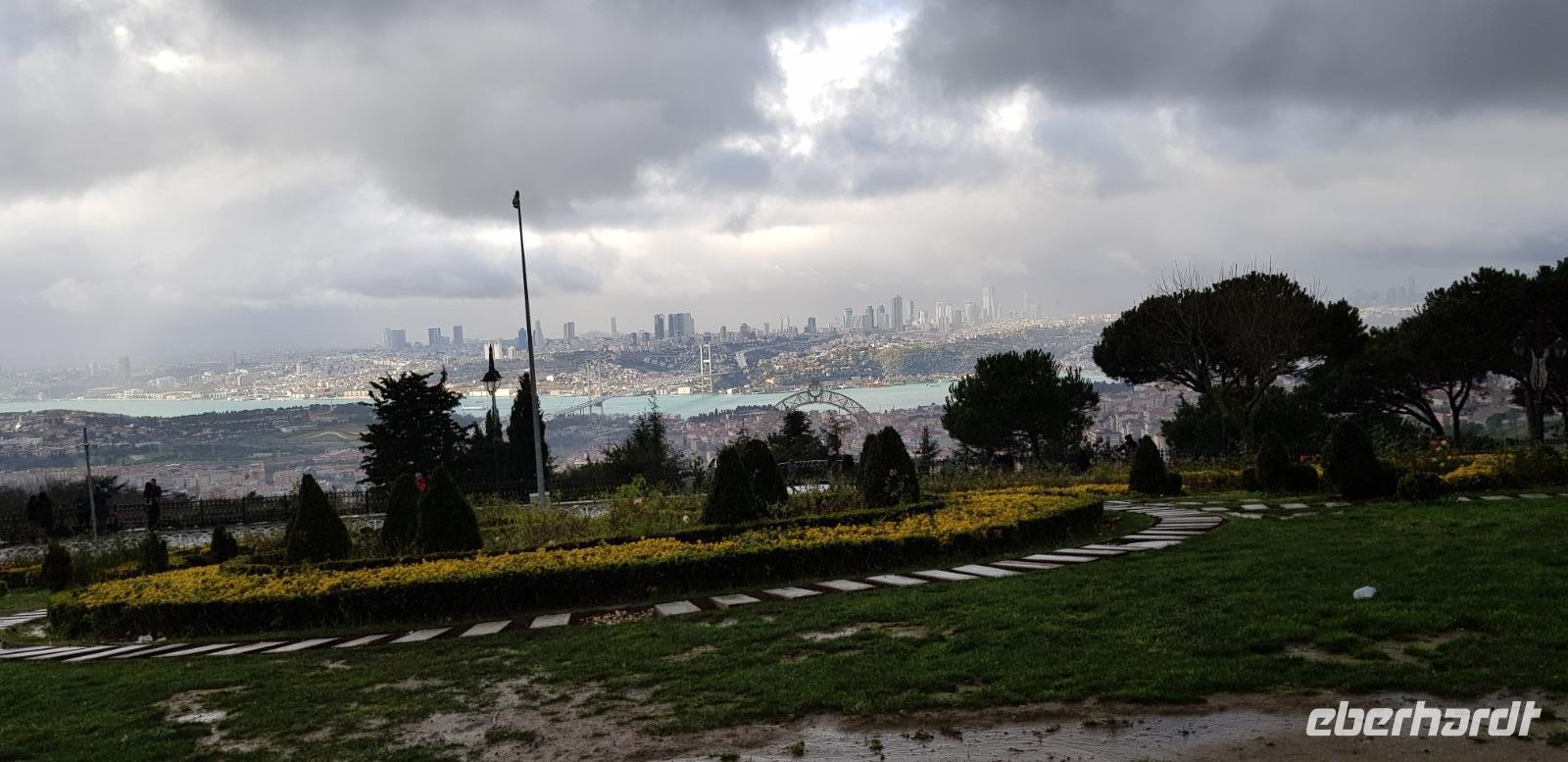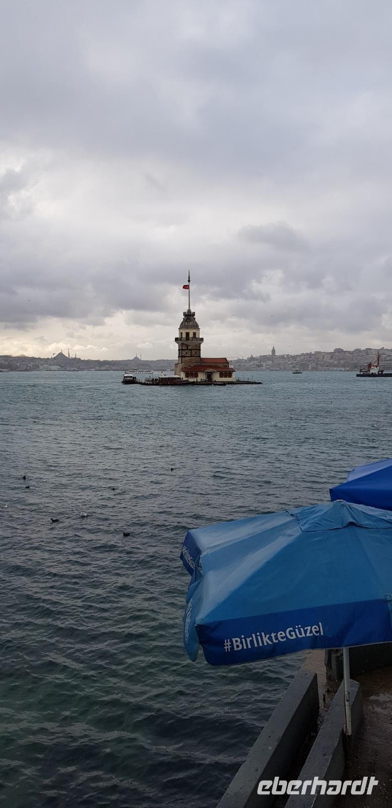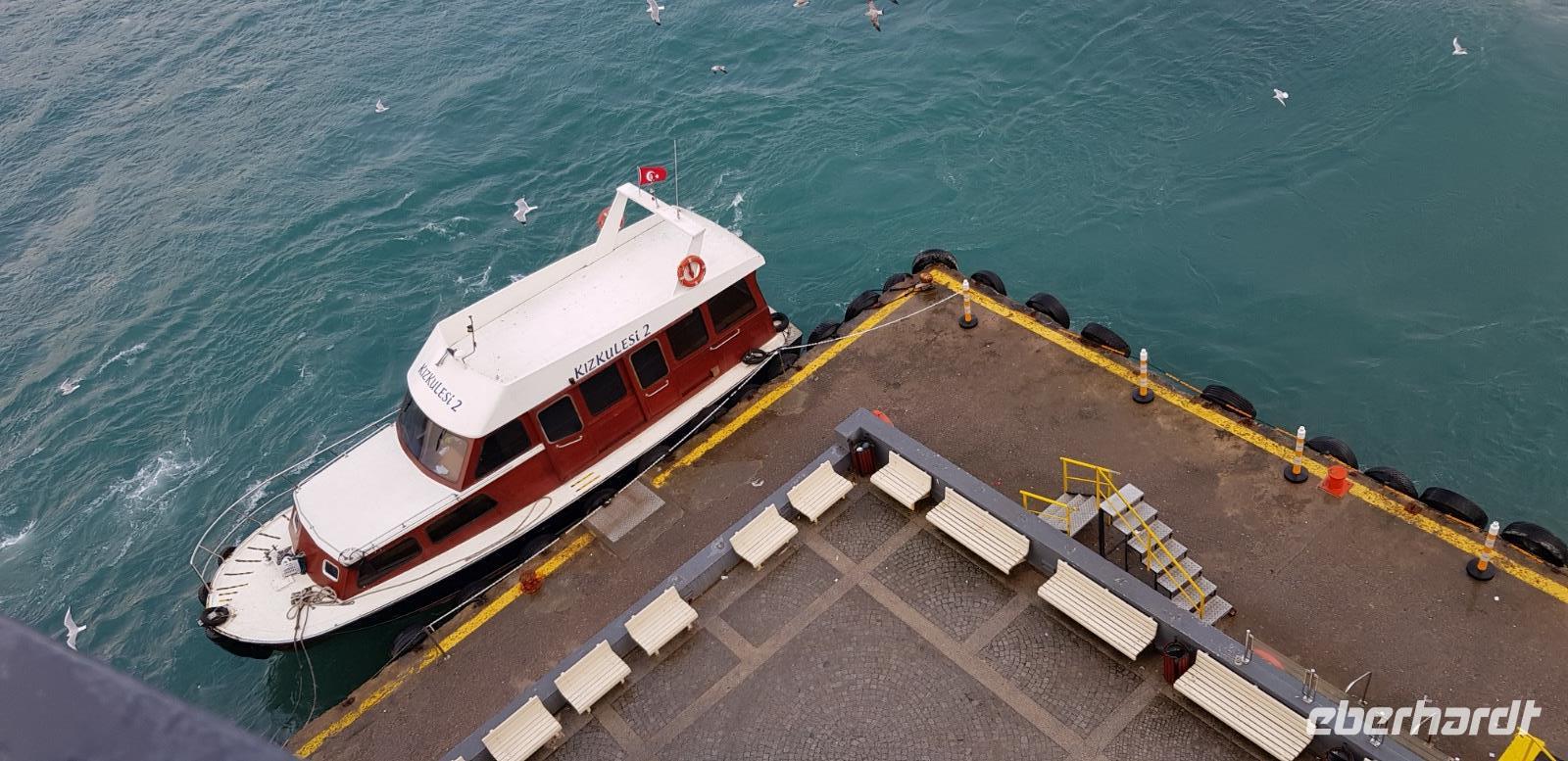 An der Station Kazucesme steigen wir in die Metro und fahren unter dem Bosporus von der europäischen Seite auf die asiatische Seite Istanbuls. An der Station Üsküdar steigen wir aus und fahren mit der Rolltreppe wieder nach oben. Jetzt sind wir im asiatischen Teil, im Stadtviertel Üsküdar angekommen. Hier machen wir eine kleine Mittagspause. Üsküdar befindet sich unmittelbar an der Einfahrt in den Bosporus und hatte deshalb schon immer eine besondere strategische Bedeutung. Dann geht es weiter auf den Camlica Hügel, die höchste Erhebung Istanbuls. Von hier aus haben wir einen fantastischen Blick über den Bosporus und fast die ganze Stadt. Leider schauert es heute immer wieder, so dass der Aufenthalt auf dem Camlica Hügel etwas ungemütlich ist. Vom Camlica Hügel aus fahren wir hinunter ans Ufer des Bosporus, an die Stelle, wo die Boote zur Überfahrt zum Mädchenturm (Kiz Kulesi) ablegen. Der Mädchenturm wurde im 18.Jh. auf einer kleinen Insel im Einfahrtsbereich des Bosporus errichtet. Wir fahren mit dem Boot hinüber. Die Überfahrt dauert nur wenige Minuten. Im Inneren des Turms kann man nach oben auf die Plattform steigen und die Rundumsicht genießen - heute ist es leider recht stürmisch, so dass wir nicht lange auf der Plattform verweilen. Da ist es schon gemütlicher, im Restaurant einen Kaffee zu trinken. Dann geht es wieder mit dem Boot zum Festland auf der asiatischen Seite Üsküdar.