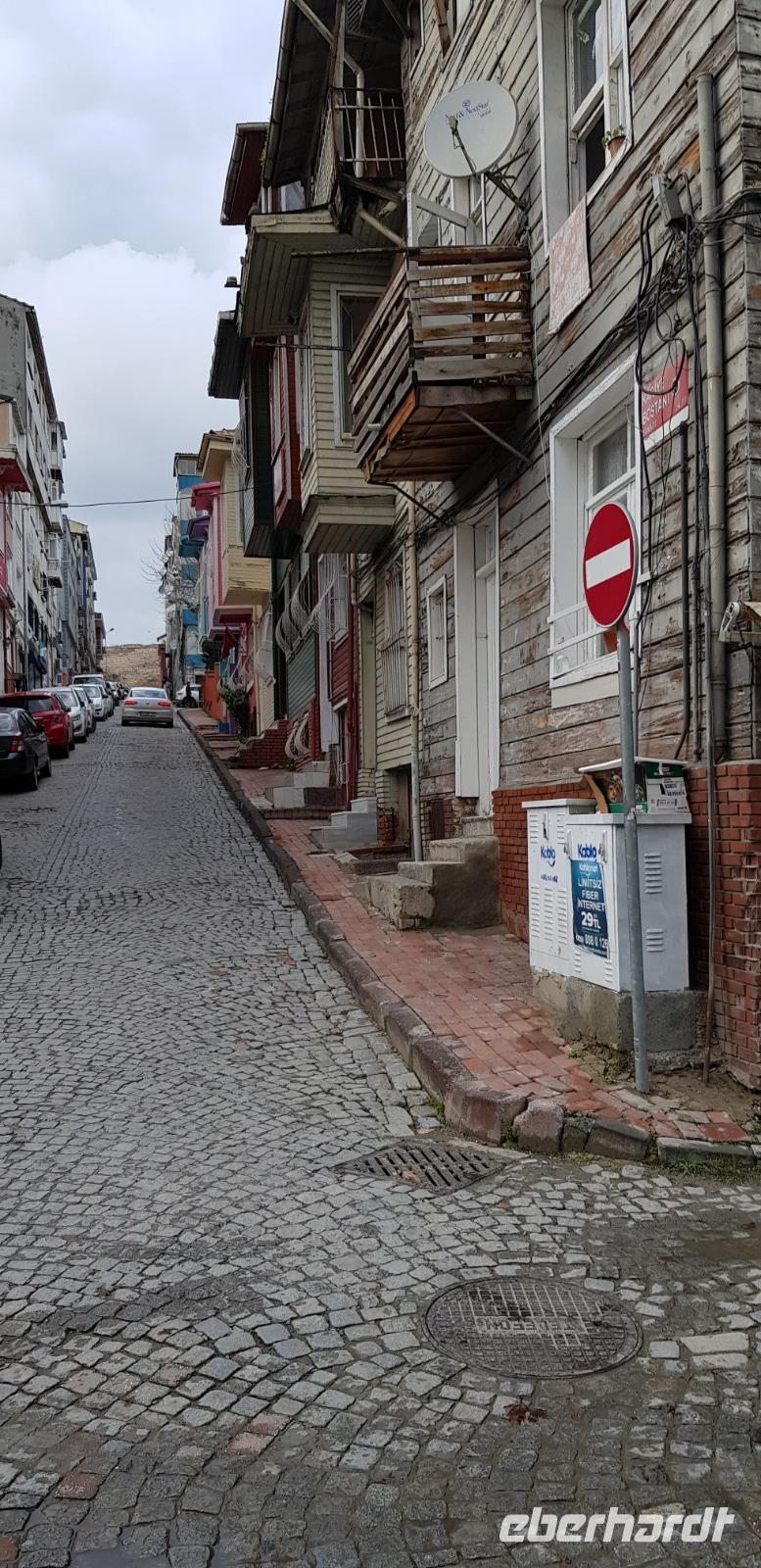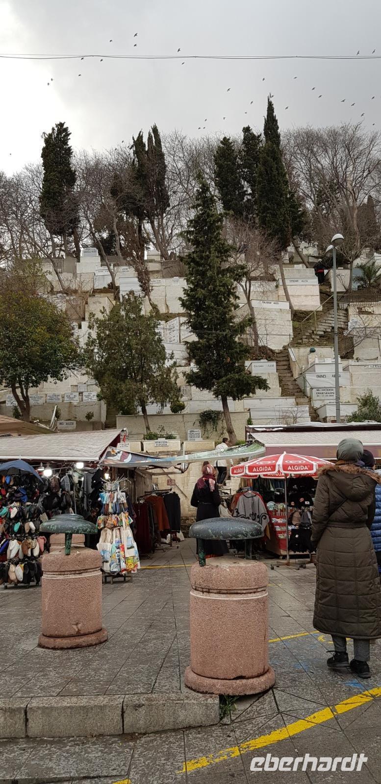 Jetzt fahren wir auf einer sehr belebten Einkaufsstraße durch die Altstadt zur Chora Kirche, die heute ein Museum ist. In ihr können wir die schönsten byzantinischen Kirchenmosaike bewundern. Sie sind sehr gut erhalten. Rund um die Chora Kirche befinden sich zahlreiche osmanische Holzhäuser, die schon restauriert wurden-auch ein interessantes Stadtviertel. Dann geht es weiter mit dem Bus durch enge Gassen. Unser Fahrer muss sein ganzes Können einsetzen und lenkt den Bus ganz sicher. Schließlich erreichen wir Eyüp, das "heilige Viertel" Istanbuls. Hier befindet sich die Eyüp Moschee, ein wichtiger Wallfahrtsort, den Gläubige aus dem ganzen Land besuchen. Wir schauen auch in die Moschee "für Einheimische" hinein. Unmittelbar neben der Moschee befindet sich ein großer Friedhof, der sich über den ganzen Hang hinauf erstreckt.