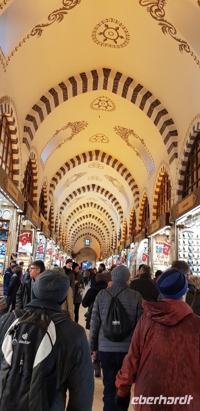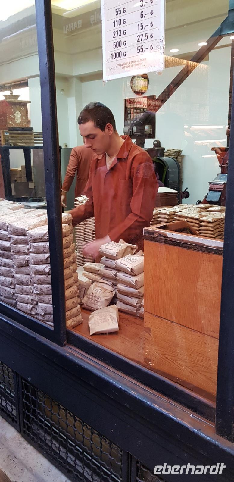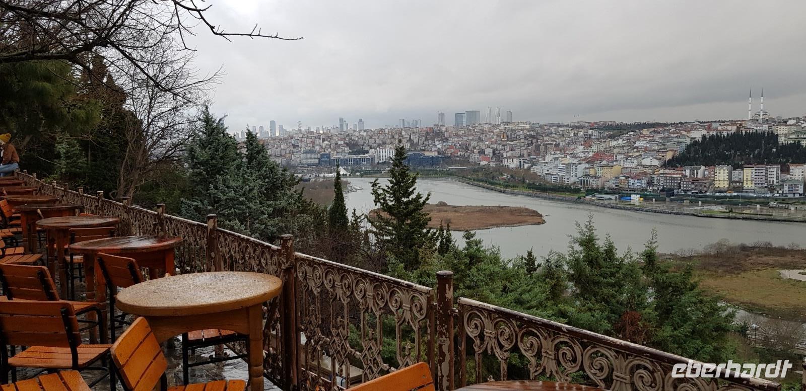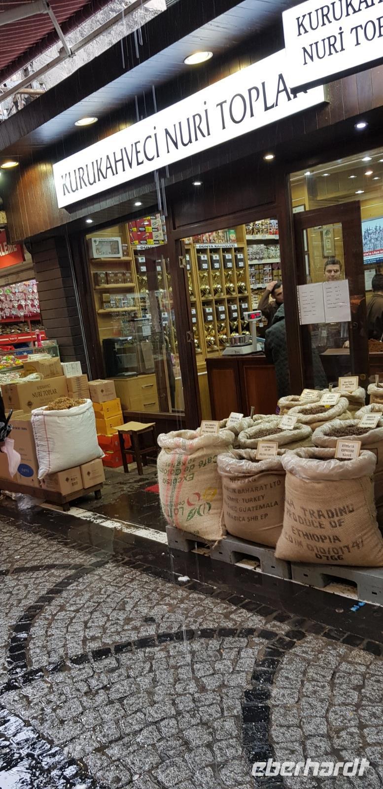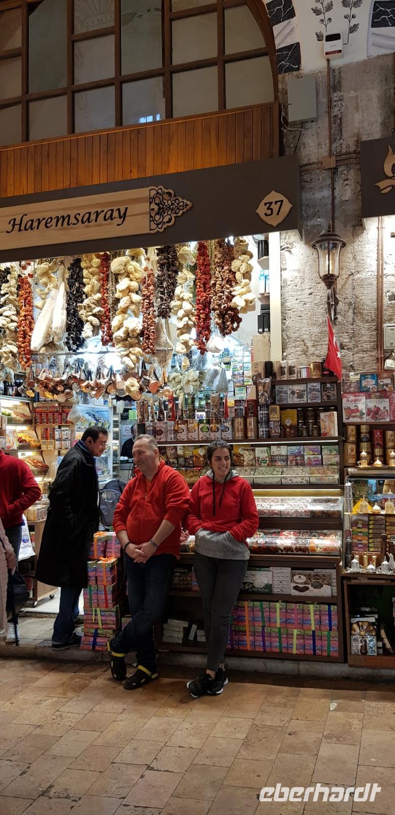 Nach dem Frühstück starten wir heute wieder um 9.00 Uhr zur Fortsetzung unserer Stadtbesichtigung. Unser Fahrer holt uns mit dem Bus ab. Zuerst fahren wir noch einmal nach Eyüp, diesmal hinauf auf den Hügel. Vom Aussichtspunkt haben wir einen tollen Blick auf das Goldene Horn. Und hier oben befindet sich das berühmte türkische Kaffeehaus "Pierre Loti". Wir kehren ein und sitzen bei einem Kaffee, einige trinken ihn auch türkisch, oder Tee ein Weilchen zusammen. Leider fängt es wieder an zu regnen. Wir begeben uns zur Seilbahn und fahren hinunter. Unten treffen wir unseren Bus und weiter geht es zum ägyptischen Markt, auch als Gewürzmarkt bekannt. Die Gewürze sind die Spezialität dieses Marktes. Serdar führt uns über den Markt, damit wir einen Überblick bekommen. Anschließend kann jeder noch eine Runde gehen und sich von den angebotenen Waren und ihren Düften verführen lassen und etwas für sich und seine Lieben daheim mitnehmen.