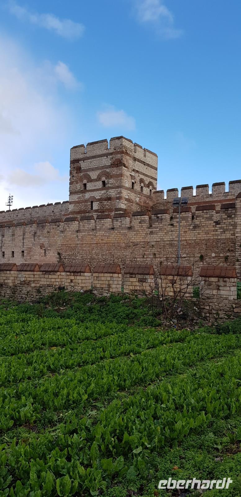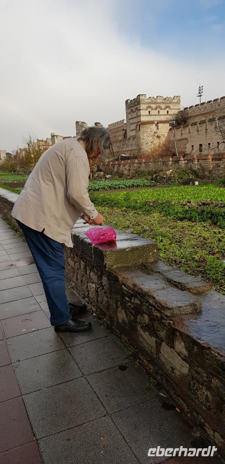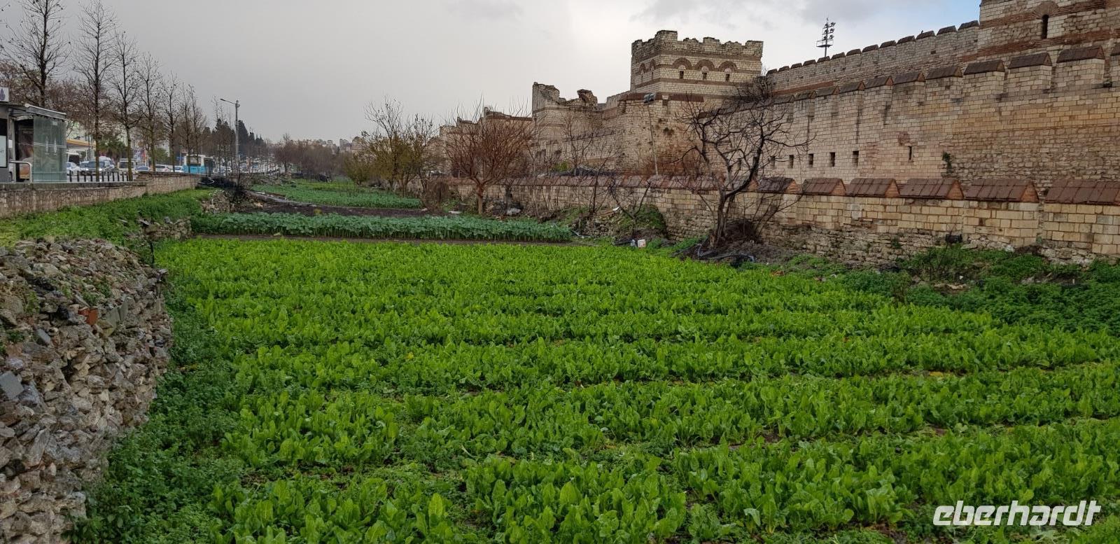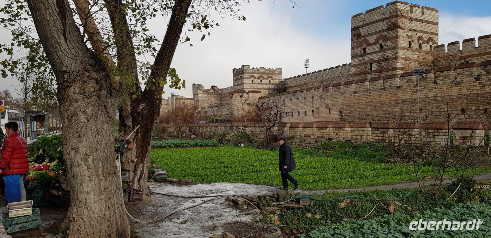 Nach dem Besuch des ägyptischen Marktes setzen wir unsere Stadtbesichtigung mit dem Bus fort. Auf unserer Fahrt zur Marmaray U-Bahn legen wir noch einen Stopp an der Stadtmauer ein. Serdar kennt da eine besondere Stelle. Die Stadtmauer ist hier schon restauriert und auf dem Streifen vor der Mauer ist besonders fruchtbarer Boden. Da baut ein Bauer schon seit Jahren verschiedenes Gemüse an und verkauft dieses auch gleich an Ort und Stelle. Dort stoppen wir. Dann geht es weiter zur Marmaray U-Bahn.