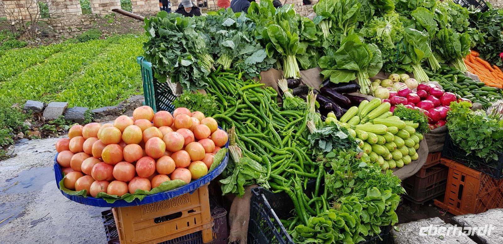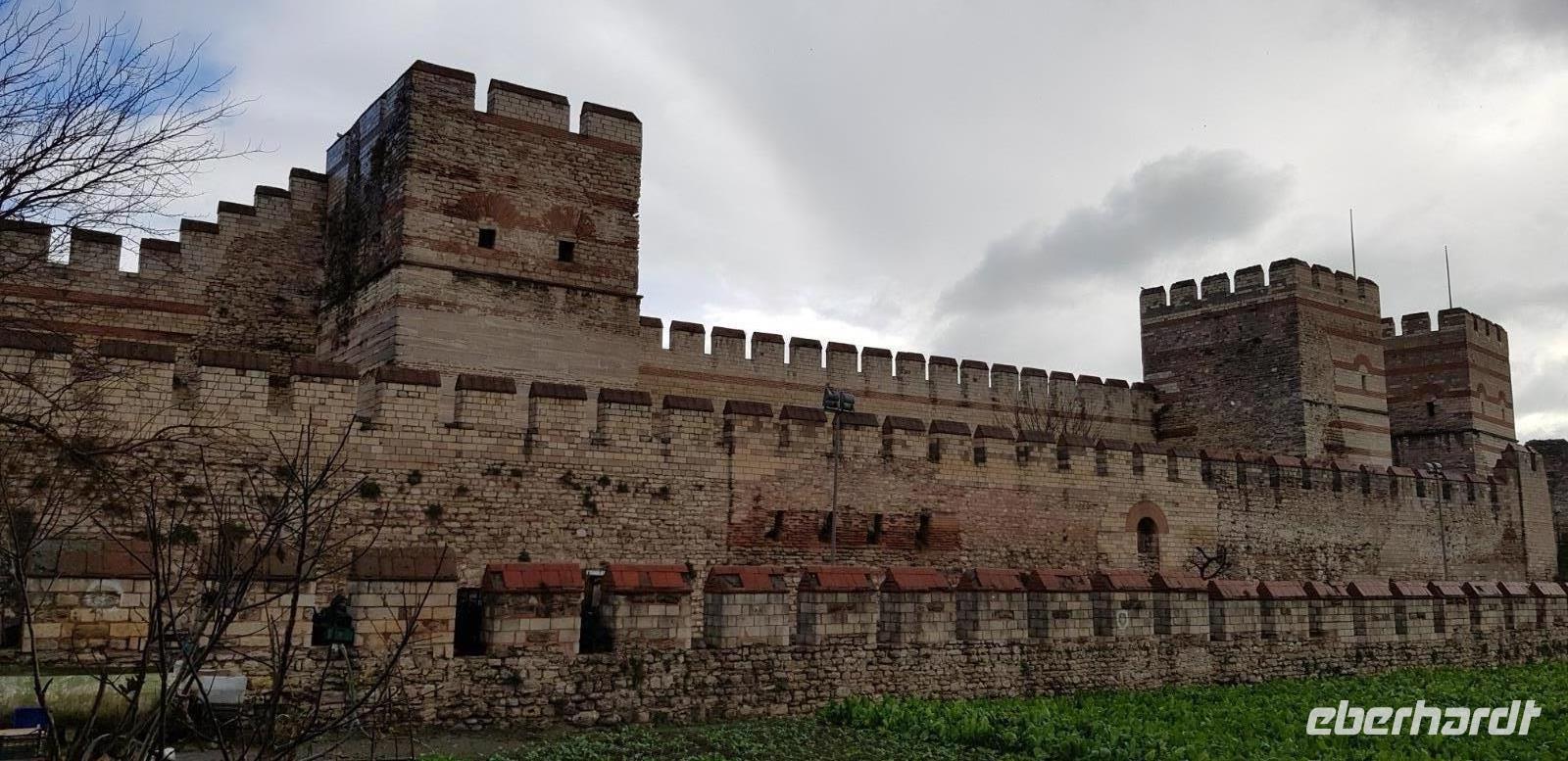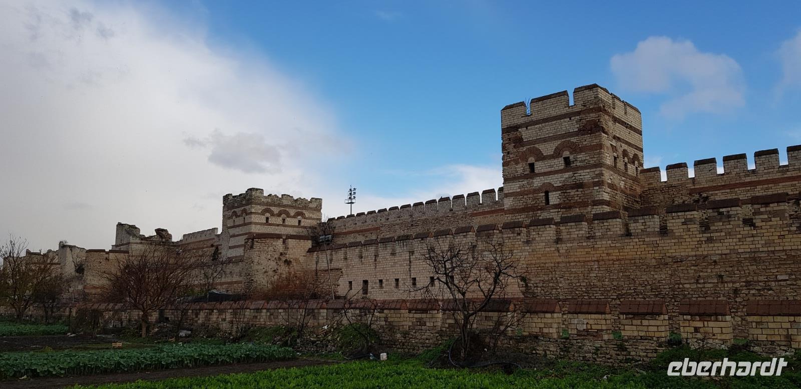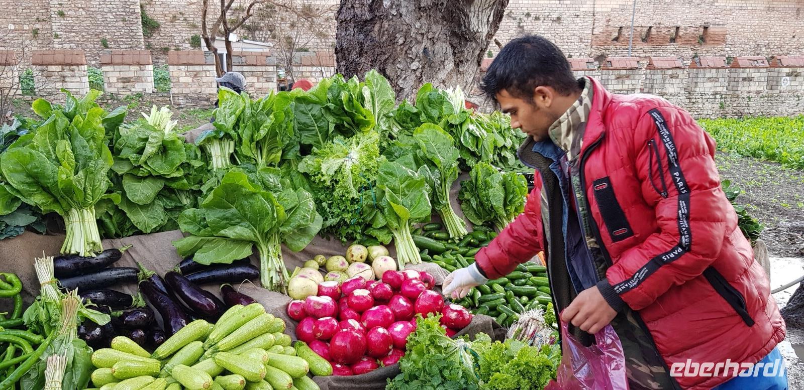 Nach dem Besuch des ägyptischen Marktes setzen wir unsere Stadtbesichtigung mit dem Bus fort. Auf unserer Fahrt zur Marmaray U-Bahn legen wir noch einen Stopp an der Stadtmauer ein. Serdar kennt da eine besondere Stelle. Die Stadtmauer ist hier schon restauriert und auf dem Streifen vor der Mauer ist besonders fruchtbarer Boden. Da baut ein Bauer schon seit Jahren verschiedenes Gemüse an und verkauft dieses auch gleich an Ort und Stelle. Dort stoppen wir. Dann geht es weiter zur Marmaray U-Bahn.