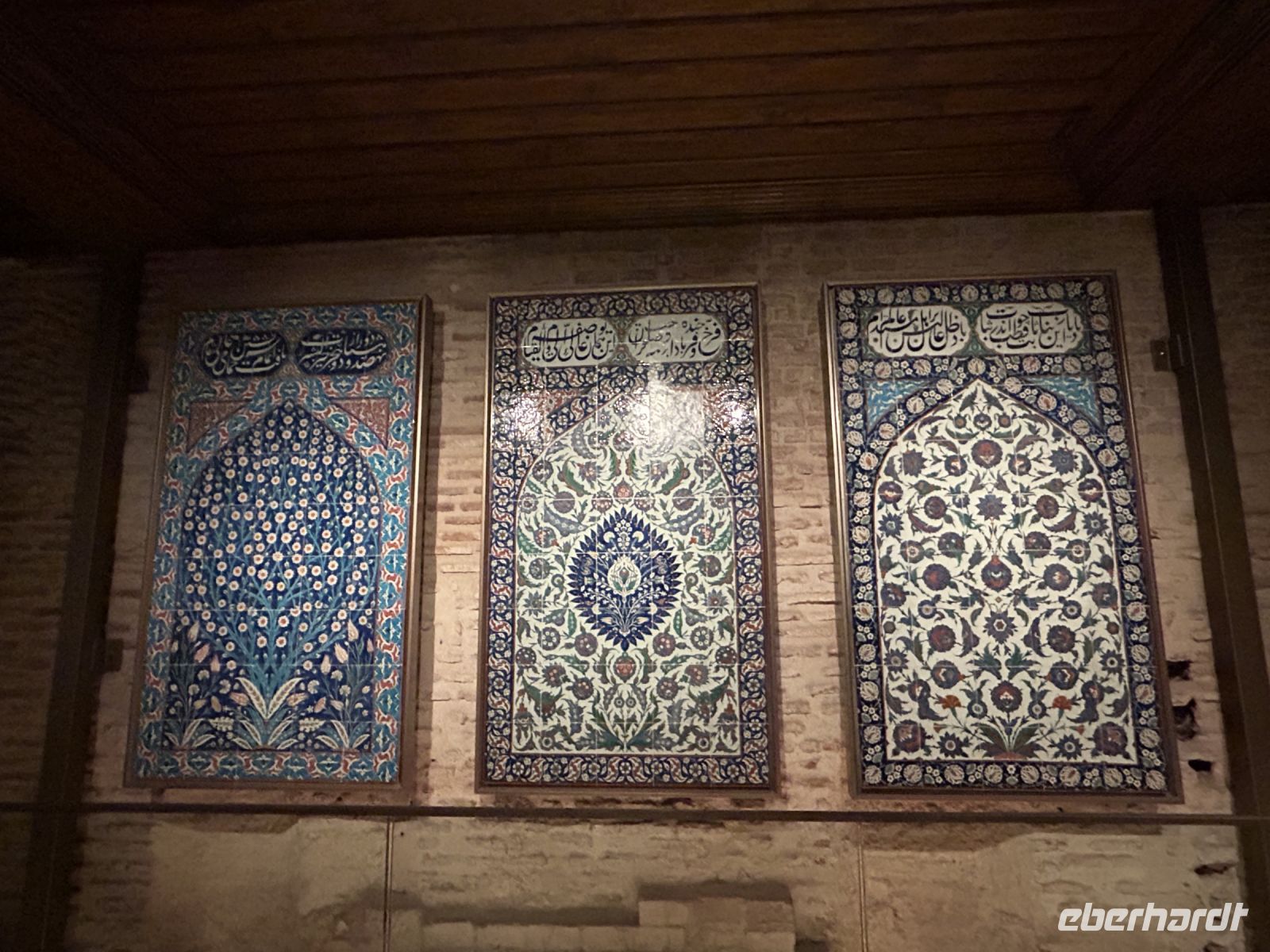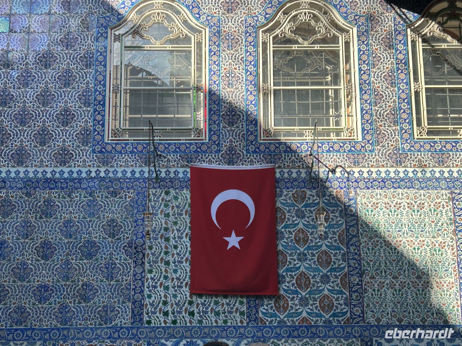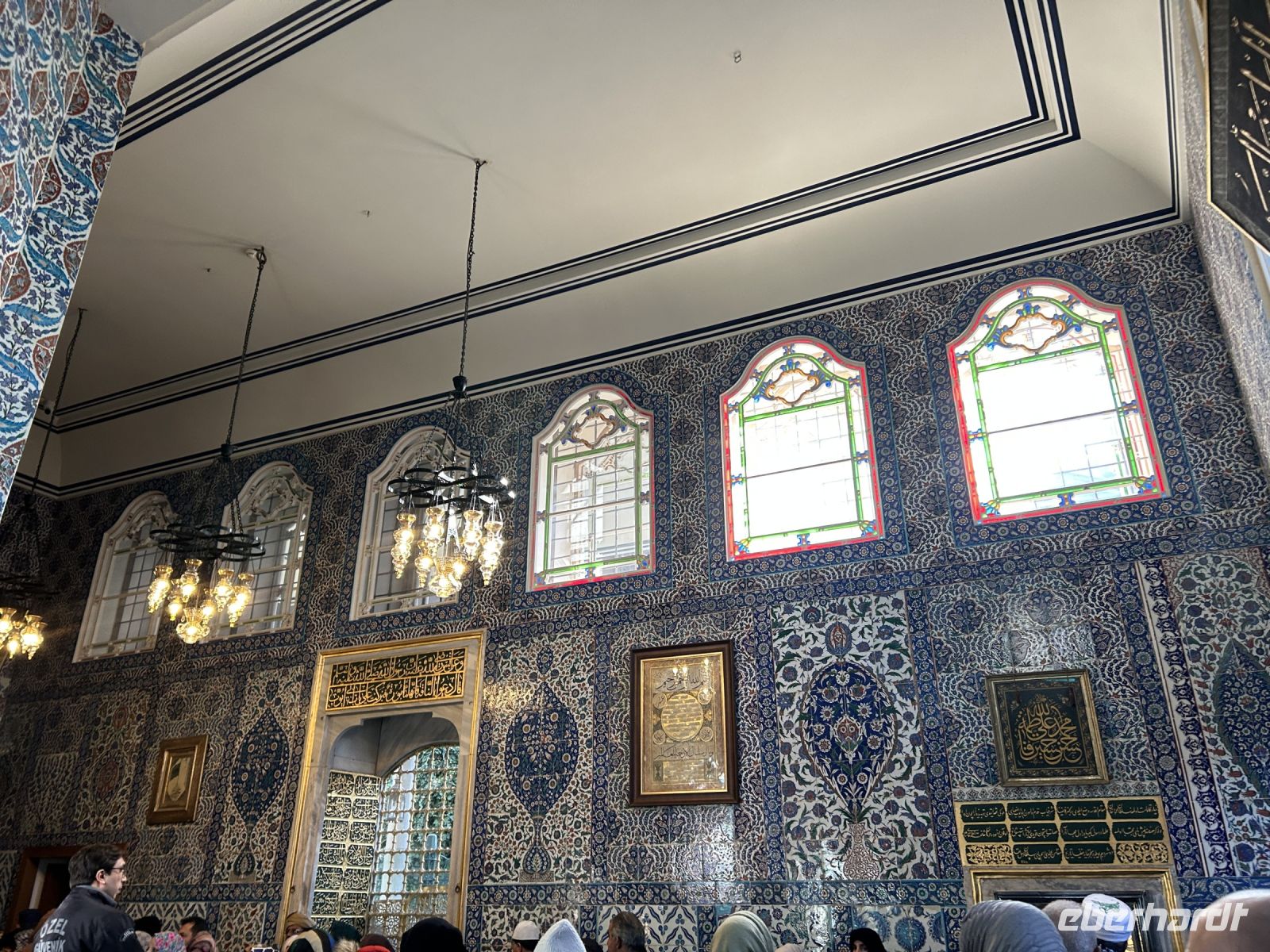 Vom Hippodrom sind es nur wenige Schritte bis zur Sultan Ahmet Moschee, die wegen der blauen Kacheln im Inneren auch Blaue Moschee genannt wird. In der Moschee selbst sind Frauen angehalten Ihre Köpfe mit Tüchern oder Schals zu bedecken und auch die Schuhe müssen wir alle ausziehen. Gut, dass unserer Reiseleiter uns den Tipp gegeben hat einen Beutel mitzunehmen, um die Schuhe darin zu verstauen. Alternativ hätten wir diese sonst im Schuhregal neben 100 anderen parken müssen. Hüseyin erklärt uns im inneren alles Wissenswerte und dann dürfen wir uns selbst umschauen und Fotos machen.
