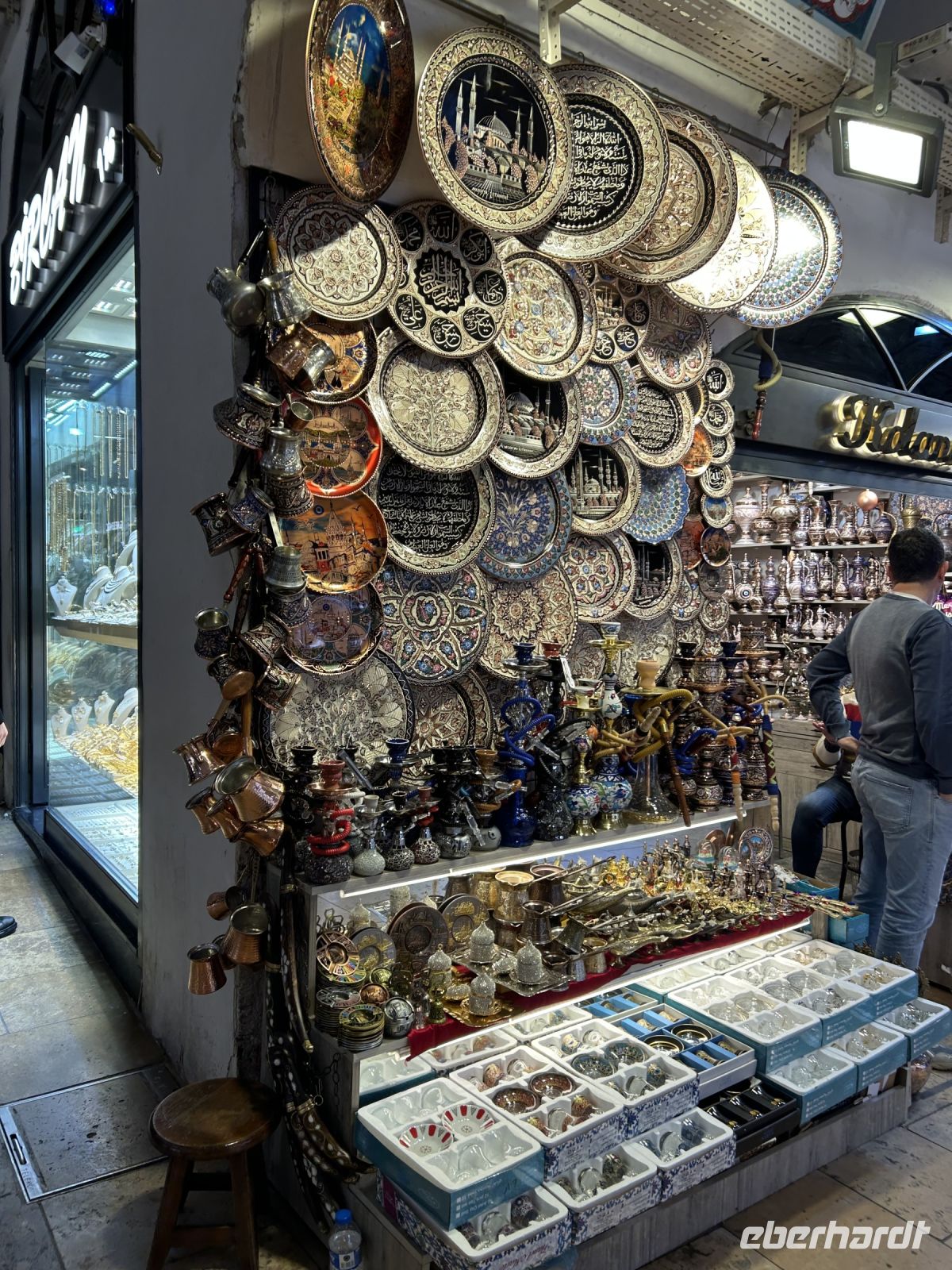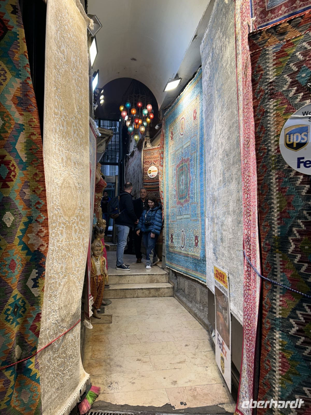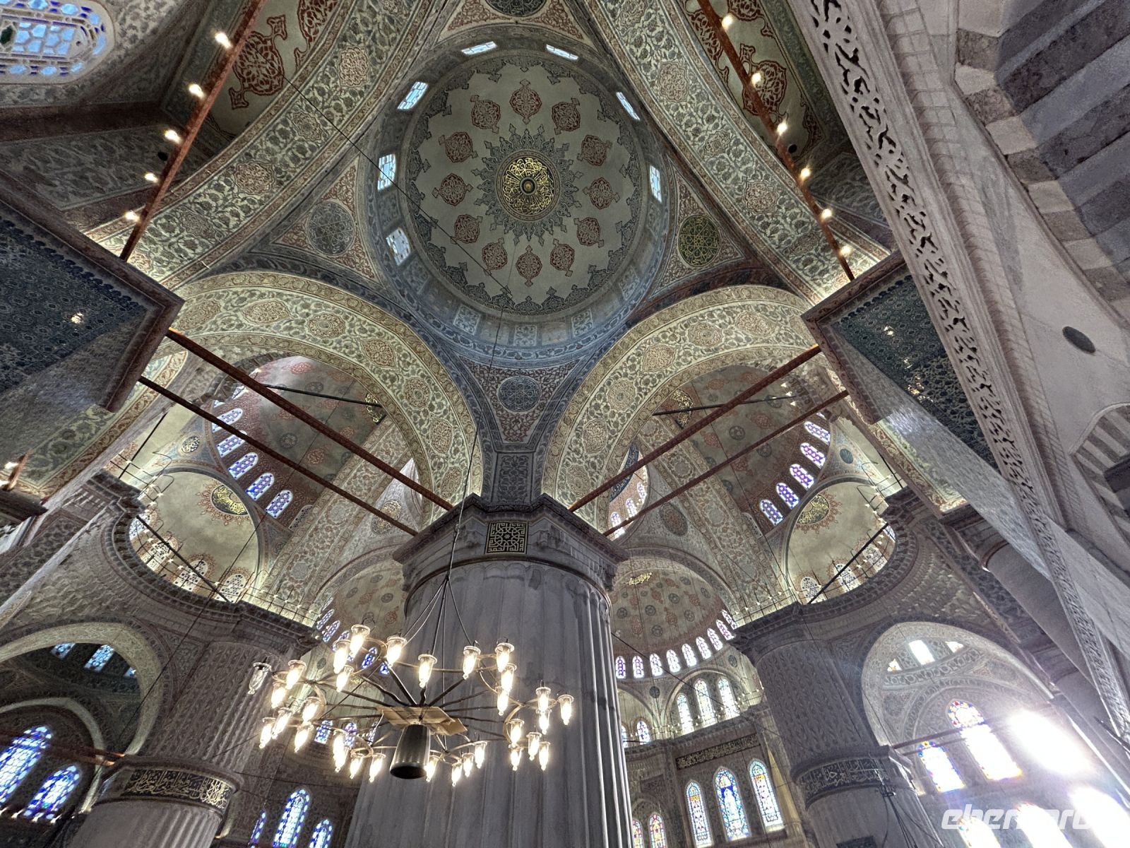 Vom Hippodrom sind es nur wenige Schritte bis zur Sultan Ahmet Moschee, die wegen der blauen Kacheln im Inneren auch Blaue Moschee genannt wird. In der Moschee selbst sind Frauen angehalten Ihre Köpfe mit Tüchern oder Schals zu bedecken und auch die Schuhe müssen wir alle ausziehen. Gut, dass unserer Reiseleiter uns den Tipp gegeben hat einen Beutel mitzunehmen, um die Schuhe darin zu verstauen. Alternativ hätten wir diese sonst im Schuhregal neben 100 anderen parken müssen. Hüseyin erklärt uns im inneren alles Wissenswerte und dann dürfen wir uns selbst umschauen und Fotos machen.