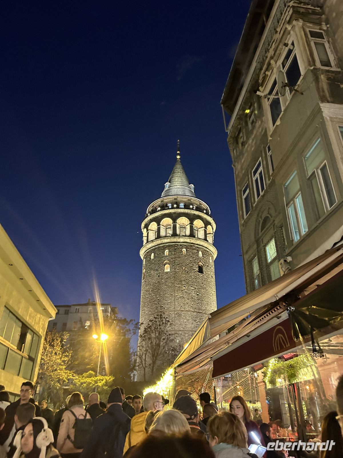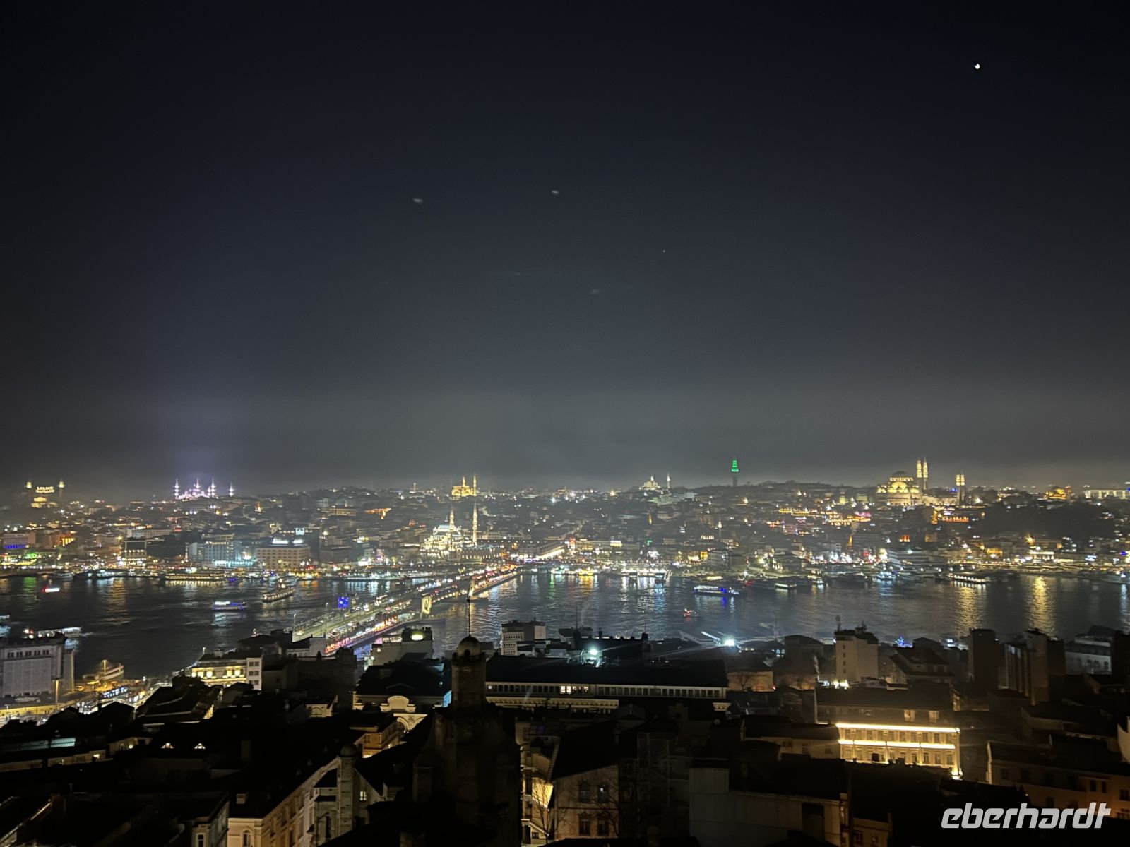An der nächsten Attraktion reihen wir uns in die lange Schlange ein und warten geduldig, bis wir endlich den Aufstieg auf den Galataturm wagen dürfen. Mit zwei Aufzügen kann man bis in das siebte Stockwerk fahren. Über eine hölzerne Wendeltreppe gelangt man von dort aus in die beiden letzten Etagen, wo sich der Zugang zur Aussichtsterrasse befindet. Da es schon spät am Abend ist, ist der Ausblick auf das noch weihnachtlich beleuchtete Istanbul besonders schön. Zu Abend aßen wir in einem gemütlichen Lokal unweit der letzten Attraktion des Tages. Unserer Busfahrer Oktay holt uns von hier ab und fährt und gekonnt durch die engen Straßen Istanbuls zurück in unsere Unterkunft.