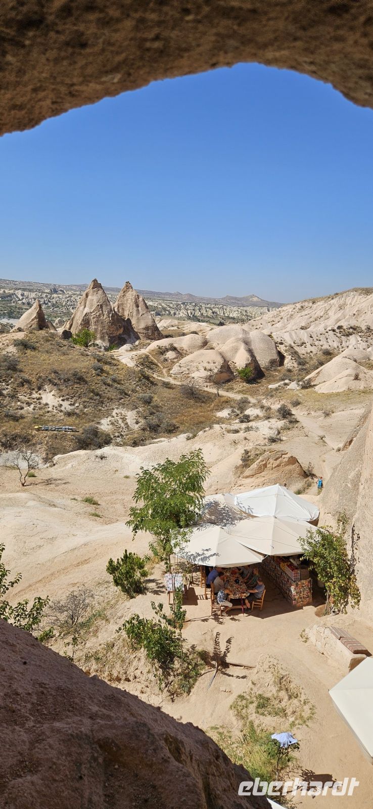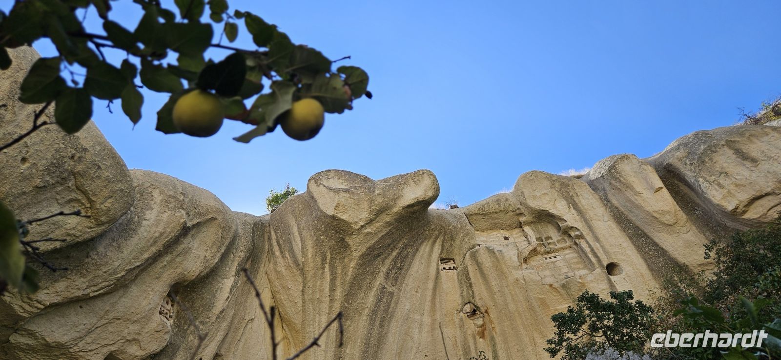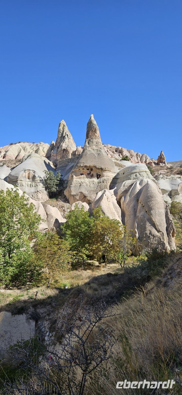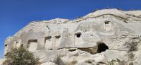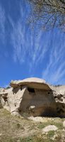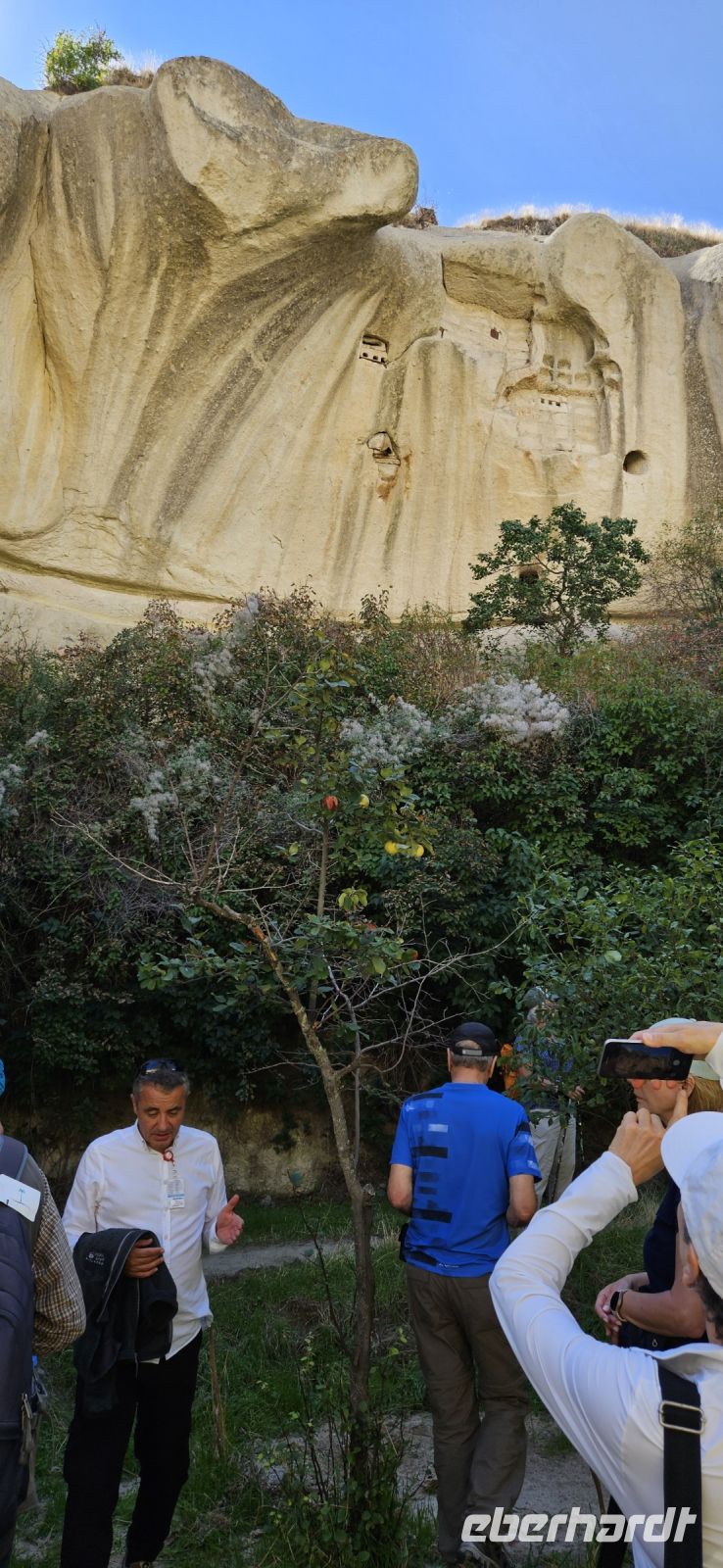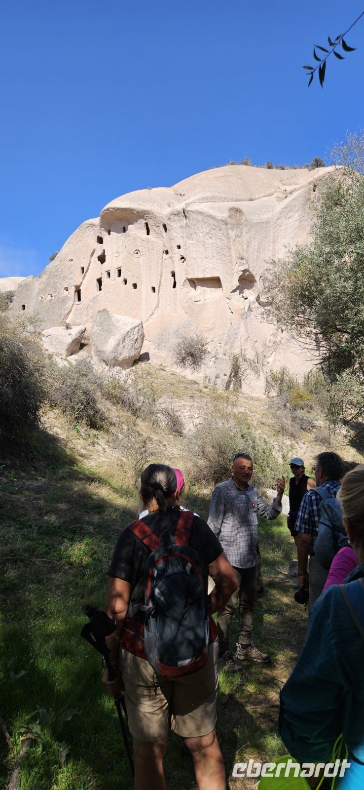 Unser erstes Ziel war Uchisar und dort stiegen wir hinauf auf die Festung und hatten eine wunderbare Aussicht auf die Täler Kappadokiens, die wir in den nächsten Tagen erwandern wollten. Der Festungsfelsen ist durchlöchert wie ein Schweizer Käse und ist unterirdisch verbunden mit den Häusern der Stadt. Bei Gefahr zogen sich die Bürger in die Festung zurück und waren so vor Feinden geschützt. Dieses Prinzip gab es in vielen Orten Kappadokiens. Nach der Besichtigung fuhren wir ein kurzes Stück bergab und begannen dann mit unserer ersten Wanderung durch das Taubental. Wir sahen unterwegs viele Ölweide Bäume und Apfelquitten, die man in Kappadokien, wenn sie ganz geld und reif sind, wie einen Apfel essen kann. Özkan erklärte uns das Prinzip der Taubenschläge, denn der Taubenmist wurde als Dünger gebraucht. Auf der Wanderung durch das Taubental sahen wir die ersten wunderbaren Felsformationen. Die Tour endete am Rande von Ürgüp und dort wartete schon unser Bus und wir fuhren zum Mittagessen zu einer Bauernfamilie. Dort gab es Fettschwanzschafe, Kühe, Geflügel und die Frauen waren mit der Zubereitung unseres Mittagessens beschäftigt. Es schmeckte hervorragend und beim Nachtisch und Tee machten wir unsere Vorstellungsrunde. Am Nachmittag wanderten wir durch das Liebestal und am Ende kehrten wir dort in einem Cafe ein, wo es neben Kaffee und Tee auch frisch gepresste Säfte gab.
