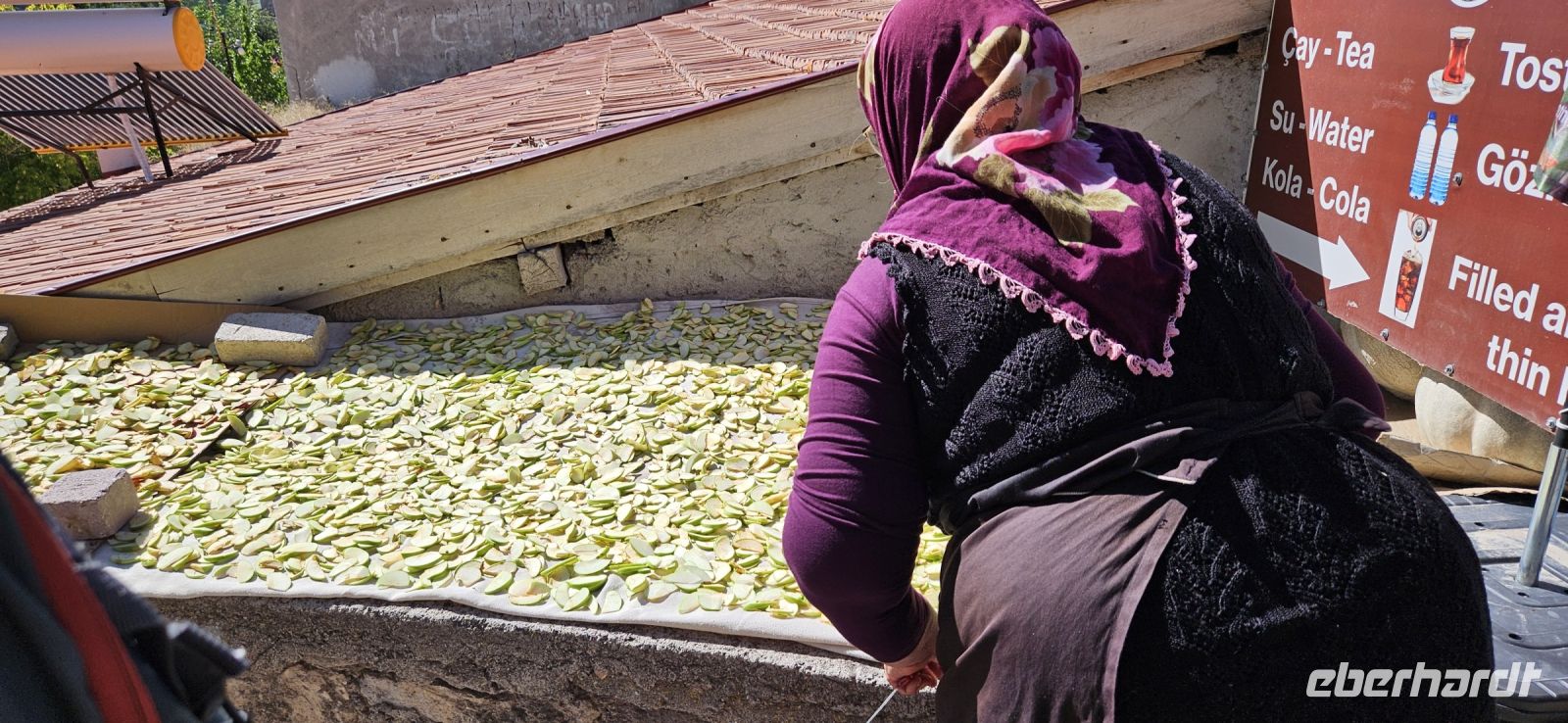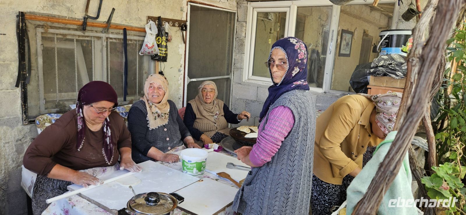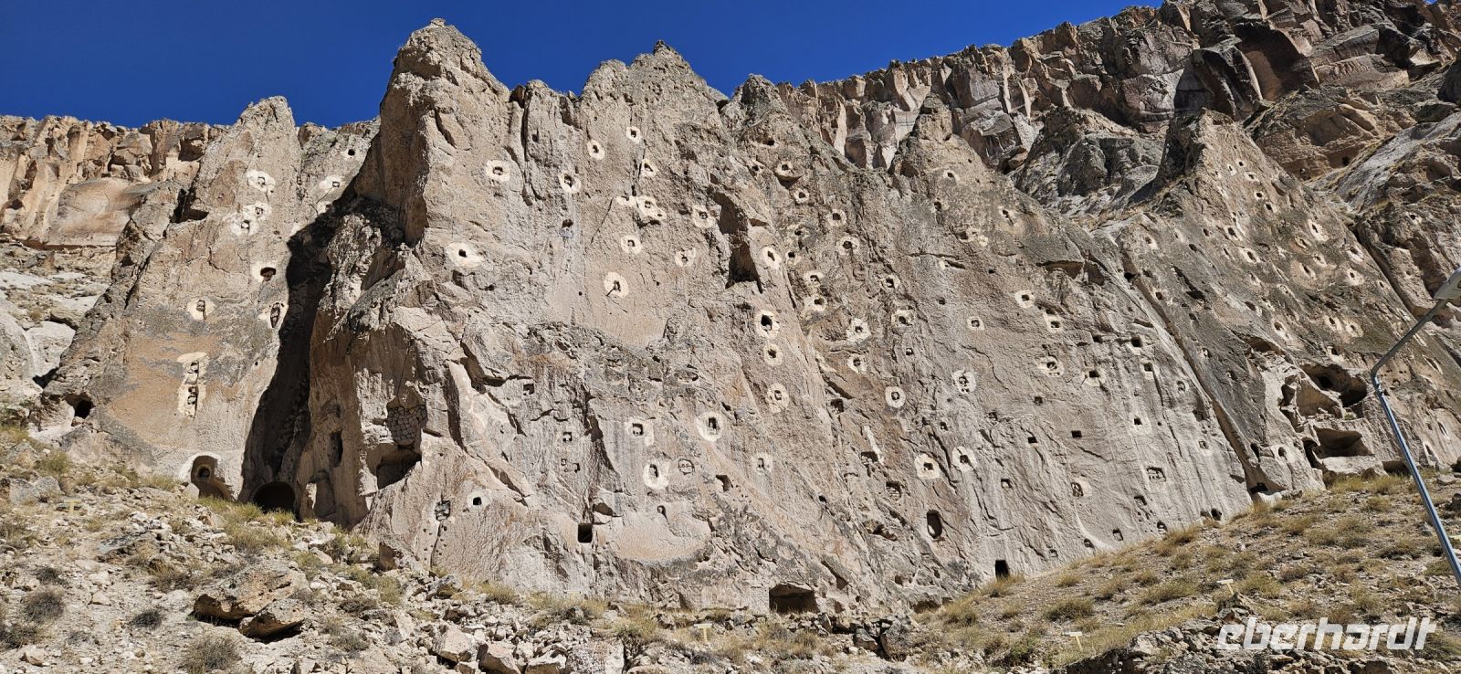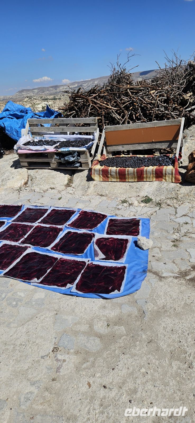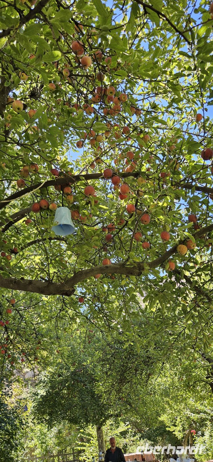 Unser erstes Ziel war Uchisar und dort stiegen wir hinauf auf die Festung und hatten eine wunderbare Aussicht auf die Täler Kappadokiens, die wir in den nächsten Tagen erwandern wollten. Der Festungsfelsen ist durchlöchert wie ein Schweizer Käse und ist unterirdisch verbunden mit den Häusern der Stadt. Bei Gefahr zogen sich die Bürger in die Festung zurück und waren so vor Feinden geschützt. Dieses Prinzip gab es in vielen Orten Kappadokiens. Nach der Besichtigung fuhren wir ein kurzes Stück bergab und begannen dann mit unserer ersten Wanderung durch das Taubental. Wir sahen unterwegs viele Ölweide Bäume und Apfelquitten, die man in Kappadokien, wenn sie ganz geld und reif sind, wie einen Apfel essen kann. Özkan erklärte uns das Prinzip der Taubenschläge, denn der Taubenmist wurde als Dünger gebraucht. Auf der Wanderung durch das Taubental sahen wir die ersten wunderbaren Felsformationen. Die Tour endete am Rande von Ürgüp und dort wartete schon unser Bus und wir fuhren zum Mittagessen zu einer Bauernfamilie. Dort gab es Fettschwanzschafe, Kühe, Geflügel und die Frauen waren mit der Zubereitung unseres Mittagessens beschäftigt. Es schmeckte hervorragend und beim Nachtisch und Tee machten wir unsere Vorstellungsrunde. Am Nachmittag wanderten wir durch das Liebestal und am Ende kehrten wir dort in einem Cafe ein, wo es neben Kaffee und Tee auch frisch gepresste Säfte gab.
