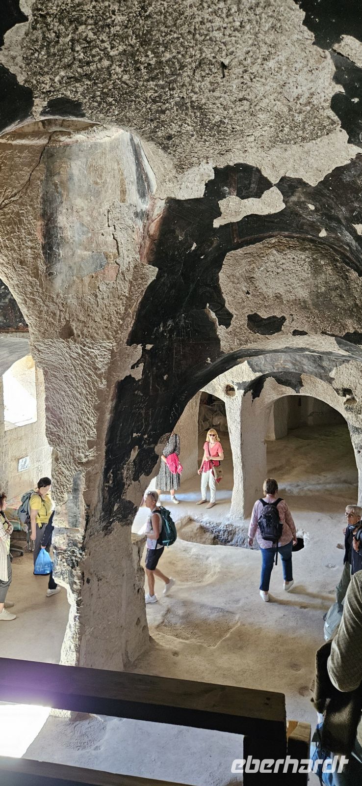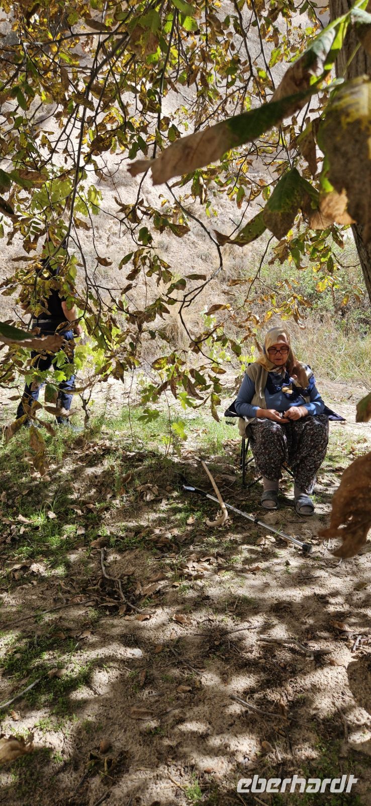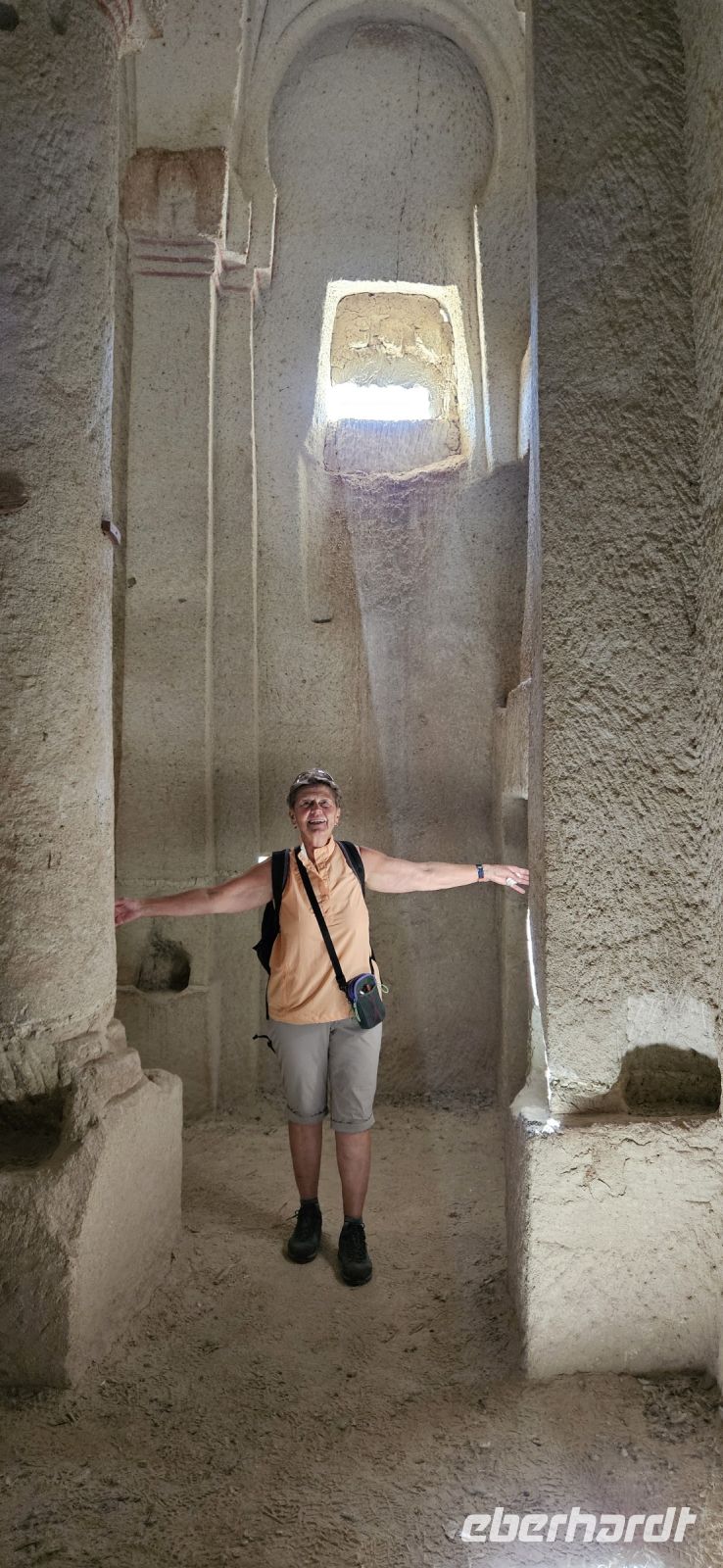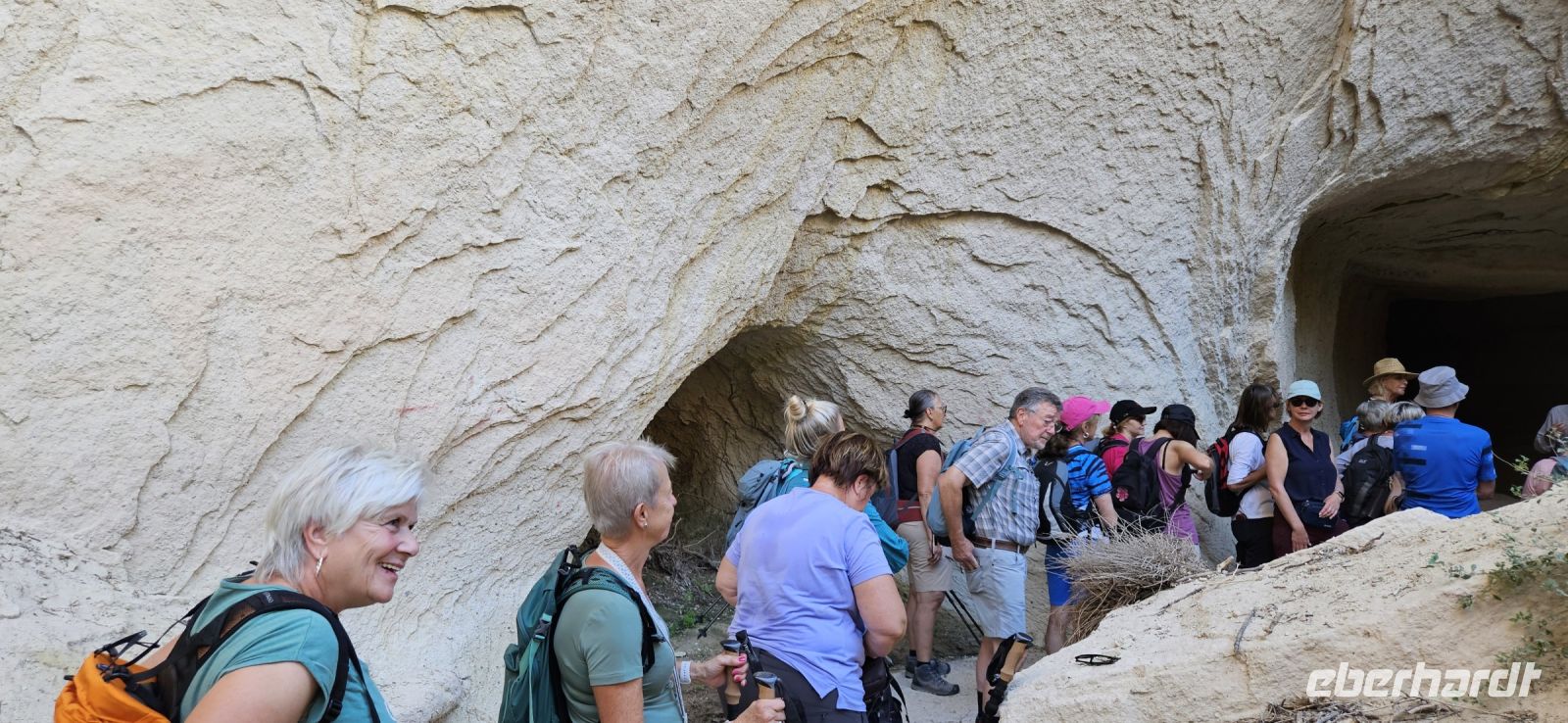 Unsere Wanderschuhe hatten heute eine Pause, denn es stand ein "Kulturtag" auf dem Programm. Wir fuhren nach Mustafapascha, in einen Ort, der beispielhaft für die große Umsiedlung von Griechen zurück nach Griechland und Türken von Griechenland zurück in die Türkei steht. Die Häuser im Ortsbild erinnern sehr an Griechenland und wir hatten die Gelegenheit, ein Boutique Hotel zu besuchen, welches auch 3 Höhlenzimmer anbietet. Ein Stück weiter erreichten wir das Keslik Kloster, welches eine Kirche mit berühmten, leider noch nicht restaurierten, Fresken hat. Özkan leuchtete uns die markanten Schriften aus und erklärte alles. Zum Kloster komplex gehörten weitere Gebäude und eine Kirche, die wir besichtigen konnten. Unser nächster Stopp war an einem Kartoffel Depot. In den Tuffstein war ein langer Gang gebort worden, von dem seitwärts große Lagerräume abgingen. Dort herrscht immer eine gleiche kühle Temperatur und das ist ideal zum Lagern von Kartoffeln, Bohnen und vielen anderen landwirtschaftlichen Produkten. Unsere Mittagspause machten wir im Soganli Tal in einem fantastischen Apfelgarten. Die Tische standen unter großen Bäumen im Schatten und das Mittagessen war köstlich. Danach erkundeten wir im Soganli Tal die wunderschön mit Fresken ausgestaltete Barbara Kirche. Özkan hatte den Schlüssel für die Kirche beschafft und erklärte uns die einzelen Szenen aus der biblischen Geschichte. Danach besuchten wir die Schwarzkopfkirche, die wahrscheinlich zu einem privaten Palast gehörte. Wir fuhren zurück nach Ürgüp und in der Weinkellerei Tursan probierten wir einen Weißwein, einen Rosewein und einen prämierten Rotwein. Die letzte Station war die Teppichmanufaktur Cinar. Dort empfing uns der Chef und erklärte im perfekten Deutsch die Philosophie seiner Firma und wir konnten 2 Knüpferinnen bei der Arbeit zusehen. Das Knüpfen eines Seidenteppichs hatte uns alle sehr beeindruckt und es entstehen in dieser Manufaktur richtige Kunstwerke. 3 Teppiche haben sogar einen Oscar bekommen. Dieser interessante Besuch endete dann leider in einem Verkaufraum, obwohl die meisten Singles nicht vor hatten, einen Teppich zu kaufen..