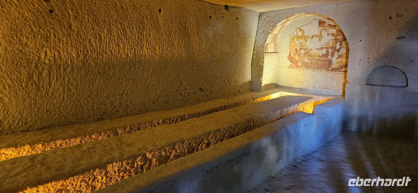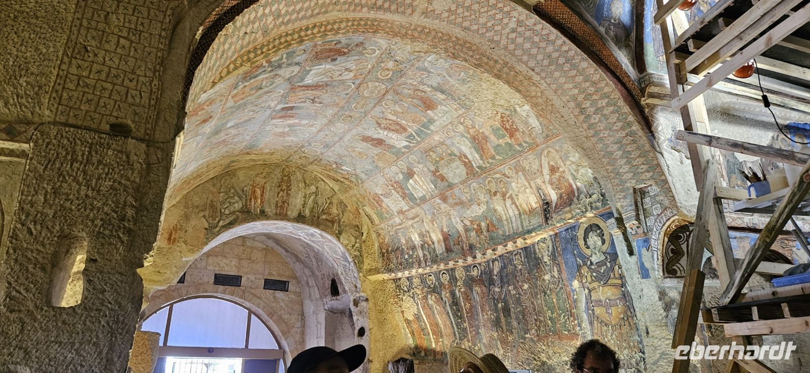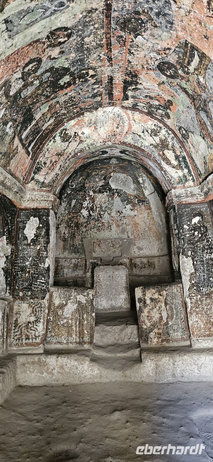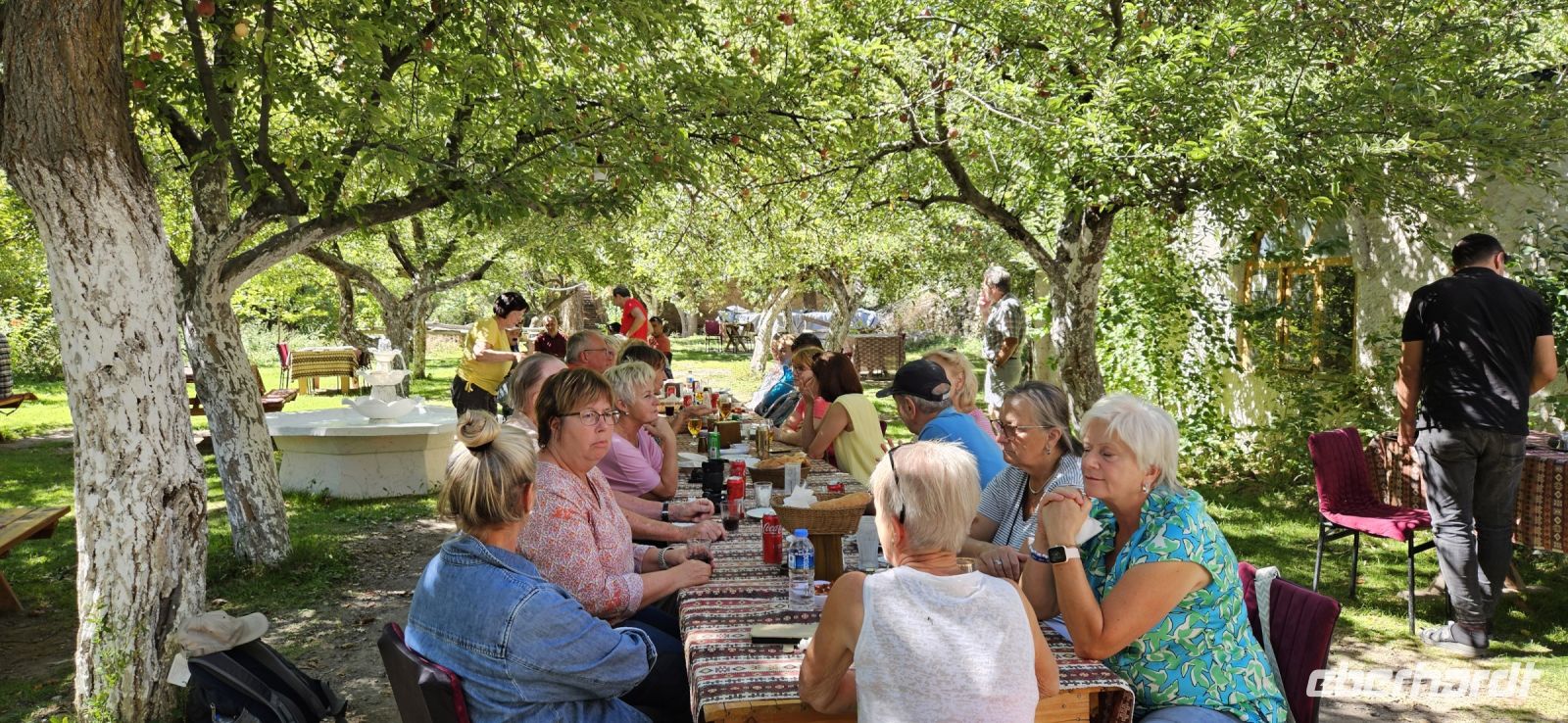 Unsere Wanderschuhe hatten heute eine Pause, denn es stand ein "Kulturtag" auf dem Programm. Wir fuhren nach Mustafapascha, in einen Ort, der beispielhaft für die große Umsiedlung von Griechen zurück nach Griechland und Türken von Griechenland zurück in die Türkei steht. Die Häuser im Ortsbild erinnern sehr an Griechenland und wir hatten die Gelegenheit, ein Boutique Hotel zu besuchen, welches auch 3 Höhlenzimmer anbietet. Ein Stück weiter erreichten wir das Keslik Kloster, welches eine Kirche mit berühmten, leider noch nicht restaurierten, Fresken hat. Özkan leuchtete uns die markanten Schriften aus und erklärte alles. Zum Kloster komplex gehörten weitere Gebäude und eine Kirche, die wir besichtigen konnten. Unser nächster Stopp war an einem Kartoffel Depot. In den Tuffstein war ein langer Gang gebort worden, von dem seitwärts große Lagerräume abgingen. Dort herrscht immer eine gleiche kühle Temperatur und das ist ideal zum Lagern von Kartoffeln, Bohnen und vielen anderen landwirtschaftlichen Produkten. Unsere Mittagspause machten wir im Soganli Tal in einem fantastischen Apfelgarten. Die Tische standen unter großen Bäumen im Schatten und das Mittagessen war köstlich. Danach erkundeten wir im Soganli Tal die wunderschön mit Fresken ausgestaltete Barbara Kirche. Özkan hatte den Schlüssel für die Kirche beschafft und erklärte uns die einzelen Szenen aus der biblischen Geschichte. Danach besuchten wir die Schwarzkopfkirche, die wahrscheinlich zu einem privaten Palast gehörte. Wir fuhren zurück nach Ürgüp und in der Weinkellerei Tursan probierten wir einen Weißwein, einen Rosewein und einen prämierten Rotwein. Die letzte Station war die Teppichmanufaktur Cinar. Dort empfing uns der Chef und erklärte im perfekten Deutsch die Philosophie seiner Firma und wir konnten 2 Knüpferinnen bei der Arbeit zusehen. Das Knüpfen eines Seidenteppichs hatte uns alle sehr beeindruckt und es entstehen in dieser Manufaktur richtige Kunstwerke. 3 Teppiche haben sogar einen Oscar bekommen. Dieser interessante Besuch endete dann leider in einem Verkaufraum, obwohl die meisten Singles nicht vor hatten, einen Teppich zu kaufen..