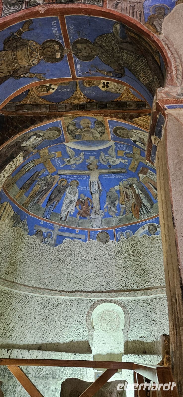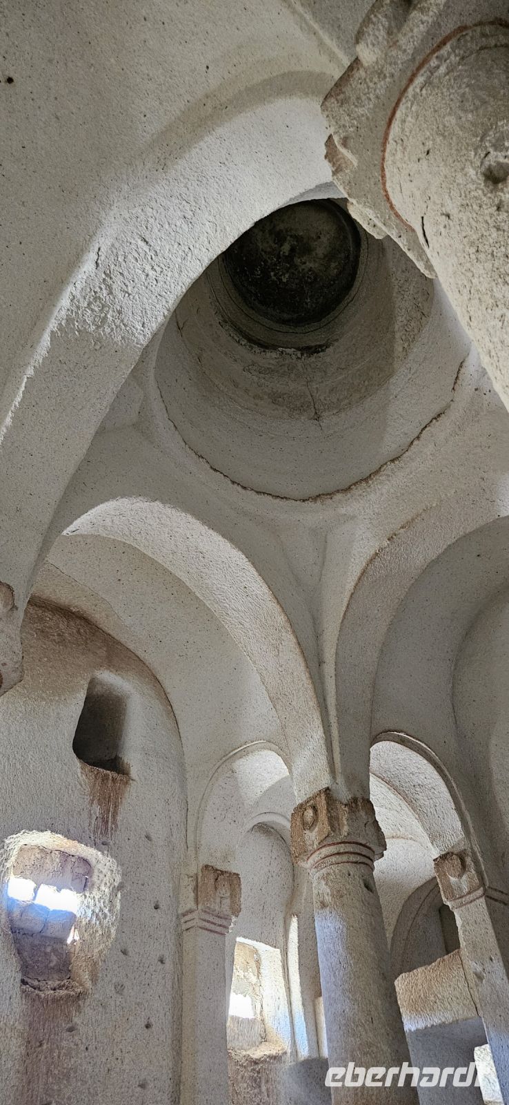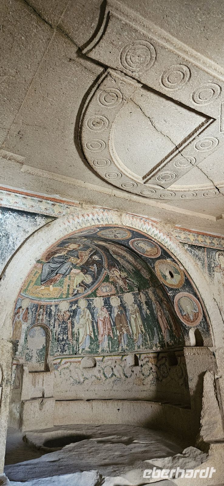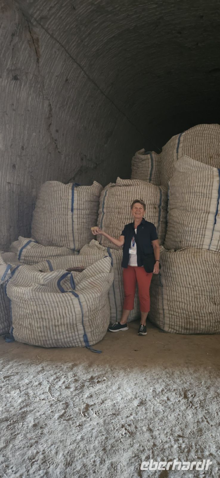 Unsere Wanderschuhe hatten heute eine Pause, denn es stand ein "Kulturtag" auf dem Programm. Wir fuhren nach Mustafapascha, in einen Ort, der beispielhaft für die große Umsiedlung von Griechen zurück nach Griechland und Türken von Griechenland zurück in die Türkei steht. Die Häuser im Ortsbild erinnern sehr an Griechenland und wir hatten die Gelegenheit, ein Boutique Hotel zu besuchen, welches auch 3 Höhlenzimmer anbietet. Ein Stück weiter erreichten wir das Keslik Kloster, welches eine Kirche mit berühmten, leider noch nicht restaurierten, Fresken hat. Özkan leuchtete uns die markanten Schriften aus und erklärte alles. Zum Kloster komplex gehörten weitere Gebäude und eine Kirche, die wir besichtigen konnten. Unser nächster Stopp war an einem Kartoffel Depot. In den Tuffstein war ein langer Gang gebort worden, von dem seitwärts große Lagerräume abgingen. Dort herrscht immer eine gleiche kühle Temperatur und das ist ideal zum Lagern von Kartoffeln, Bohnen und vielen anderen landwirtschaftlichen Produkten. Unsere Mittagspause machten wir im Soganli Tal in einem fantastischen Apfelgarten. Die Tische standen unter großen Bäumen im Schatten und das Mittagessen war köstlich. Danach erkundeten wir im Soganli Tal die wunderschön mit Fresken ausgestaltete Barbara Kirche. Özkan hatte den Schlüssel für die Kirche beschafft und erklärte uns die einzelen Szenen aus der biblischen Geschichte. Danach besuchten wir die Schwarzkopfkirche, die wahrscheinlich zu einem privaten Palast gehörte. Wir fuhren zurück nach Ürgüp und in der Weinkellerei Tursan probierten wir einen Weißwein, einen Rosewein und einen prämierten Rotwein. Die letzte Station war die Teppichmanufaktur Cinar. Dort empfing uns der Chef und erklärte im perfekten Deutsch die Philosophie seiner Firma und wir konnten 2 Knüpferinnen bei der Arbeit zusehen. Das Knüpfen eines Seidenteppichs hatte uns alle sehr beeindruckt und es entstehen in dieser Manufaktur richtige Kunstwerke. 3 Teppiche haben sogar einen Oscar bekommen. Dieser interessante Besuch endete dann leider in einem Verkaufraum, obwohl die meisten Singles nicht vor hatten, einen Teppich zu kaufen..