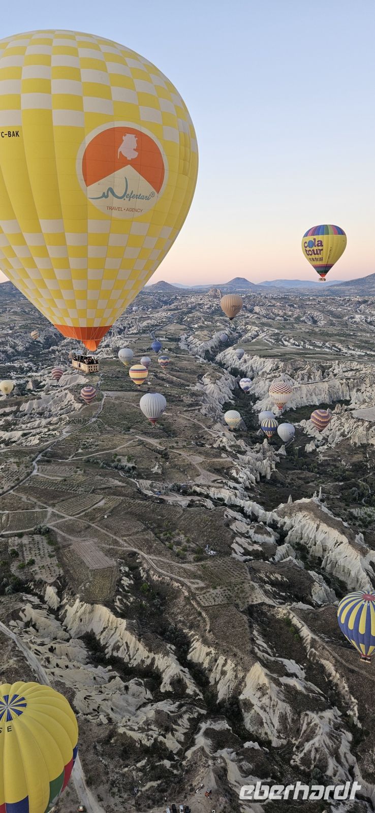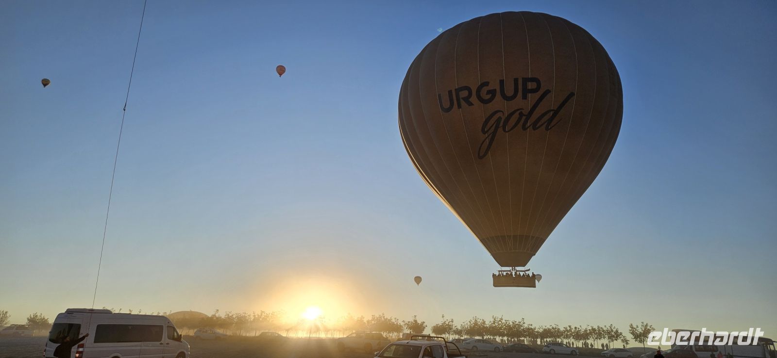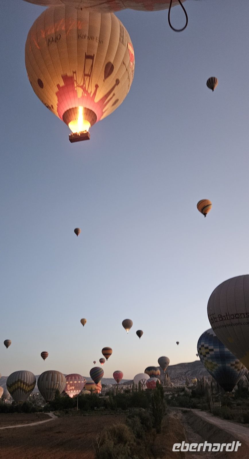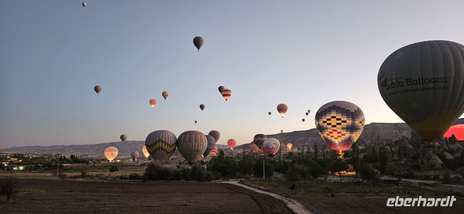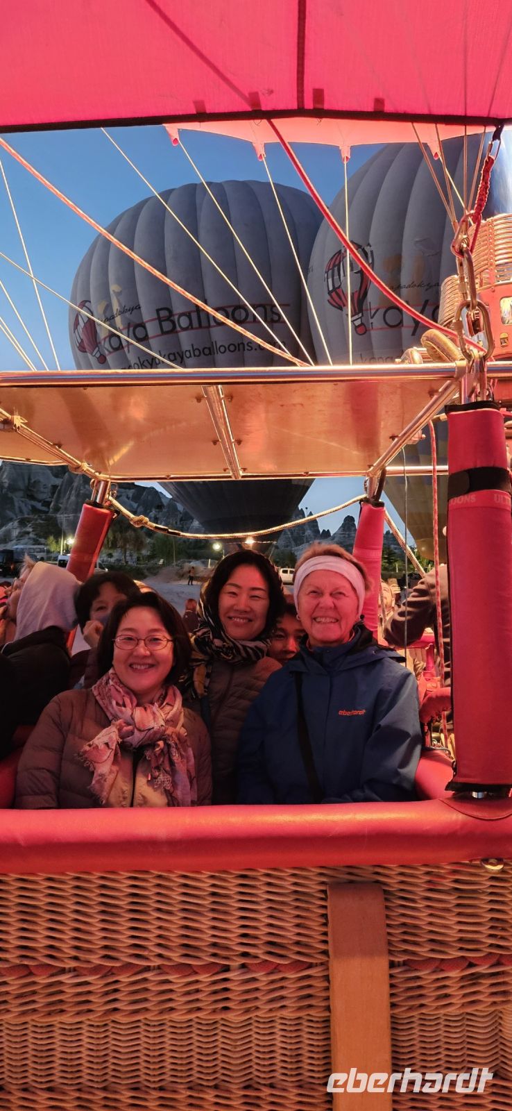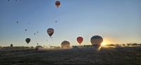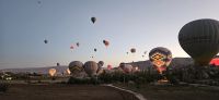 Heute stand für viele Singles DER Höhepunkt der Reise an. Kurz nach 5 Uhr wurden wir von einem Mitarbeiter der Ballon Firma Kaya im Hotel abgeholt und zu "unserem" Ballon gebracht. Kurz darauf begann das Aufblasen des Ballons. Dann richtete sich der große Korb auf und wir konnten über eine kleine Treppenleiter einsteigen. 3-4 Personen fanden in einem "Abteil" Platz und als alle drin waren, begrüßte uns Mustafa, unser Ballonführer, und sein Assistent. Um uns herum wurden die Ballons ebenfalls startklar gemacht und dann begann die Fahrt. Zunächst bewegten wir uns in Bodennähe bis das Signal zum Aufsteigen kam. Es sollen insgesamt 160 Ballons unterwegs gewesen sein und die wurden zentral dirigiert so wie die Flugzeuge am Flughafen. Es war ein unvergessliches Bild - Ballons überall. So langsam wurde es hell und als die Ballons das Liebestal erreichten, ging die Sonne auf. Wir hatten klares Wetter und konnten den Erciyes Dagi am Horizont ganz deutlich sehen. Dann begannen die Ballons in das Liebestal hinein zu fahren und kamen sich dabei sehr nahe. Nach einer Stunde erreichten wir ein großes Feld und dort stand schon ein großer Anhänger bereit, auf dem unser Korb samt Ballon landete. Für uns eine unglaubliche Leistung, aber Mustafa machte das nicht zum ersten Mal. Das Klettern aus dem Ballon auf dem Anhänger war dann nochmal speziell, aber die Kaya Mitarbeiter waren uns behilflich. Jeder bekam ein Zertifikat zur Ballonfahrt und mit einem Glas Sekt stießen wir auf das unvergessliche Erlebnis an. Dann fuhren wir zurück ins Hotel und nahmen unser Frühstück ein.