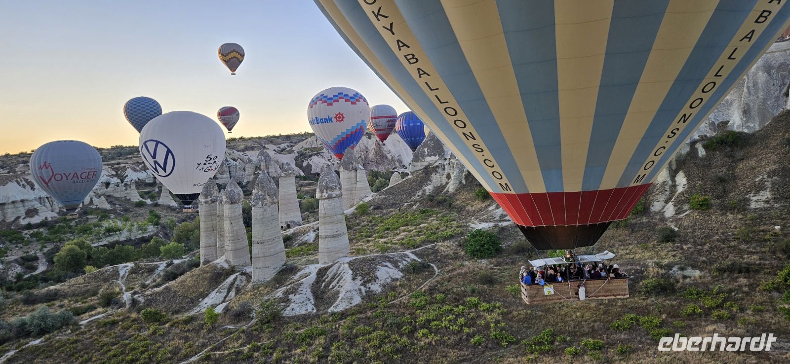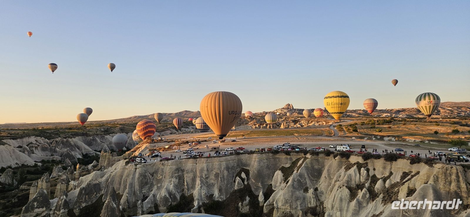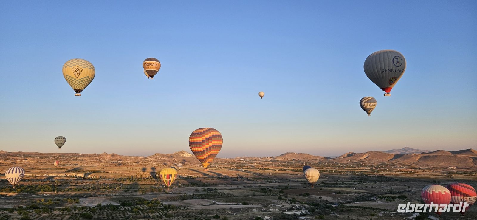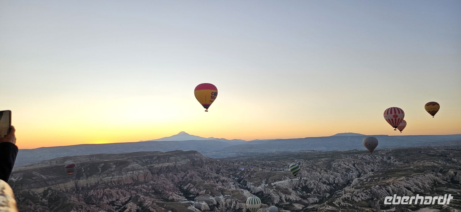 Heute stand für viele Singles DER Höhepunkt der Reise an. Kurz nach 5 Uhr wurden wir von einem Mitarbeiter der Ballon Firma Kaya im Hotel abgeholt und zu "unserem" Ballon gebracht. Kurz darauf begann das Aufblasen des Ballons. Dann richtete sich der große Korb auf und wir konnten über eine kleine Treppenleiter einsteigen. 3-4 Personen fanden in einem "Abteil" Platz und als alle drin waren, begrüßte uns Mustafa, unser Ballonführer, und sein Assistent. Um uns herum wurden die Ballons ebenfalls startklar gemacht und dann begann die Fahrt. Zunächst bewegten wir uns in Bodennähe bis das Signal zum Aufsteigen kam. Es sollen insgesamt 160 Ballons unterwegs gewesen sein und die wurden zentral dirigiert so wie die Flugzeuge am Flughafen. Es war ein unvergessliches Bild - Ballons überall. So langsam wurde es hell und als die Ballons das Liebestal erreichten, ging die Sonne auf. Wir hatten klares Wetter und konnten den Erciyes Dagi am Horizont ganz deutlich sehen. Dann begannen die Ballons in das Liebestal hinein zu fahren und kamen sich dabei sehr nahe. Nach einer Stunde erreichten wir ein großes Feld und dort stand schon ein großer Anhänger bereit, auf dem unser Korb samt Ballon landete. Für uns eine unglaubliche Leistung, aber Mustafa machte das nicht zum ersten Mal. Das Klettern aus dem Ballon auf dem Anhänger war dann nochmal speziell, aber die Kaya Mitarbeiter waren uns behilflich. Jeder bekam ein Zertifikat zur Ballonfahrt und mit einem Glas Sekt stießen wir auf das unvergessliche Erlebnis an. Dann fuhren wir zurück ins Hotel und nahmen unser Frühstück ein.