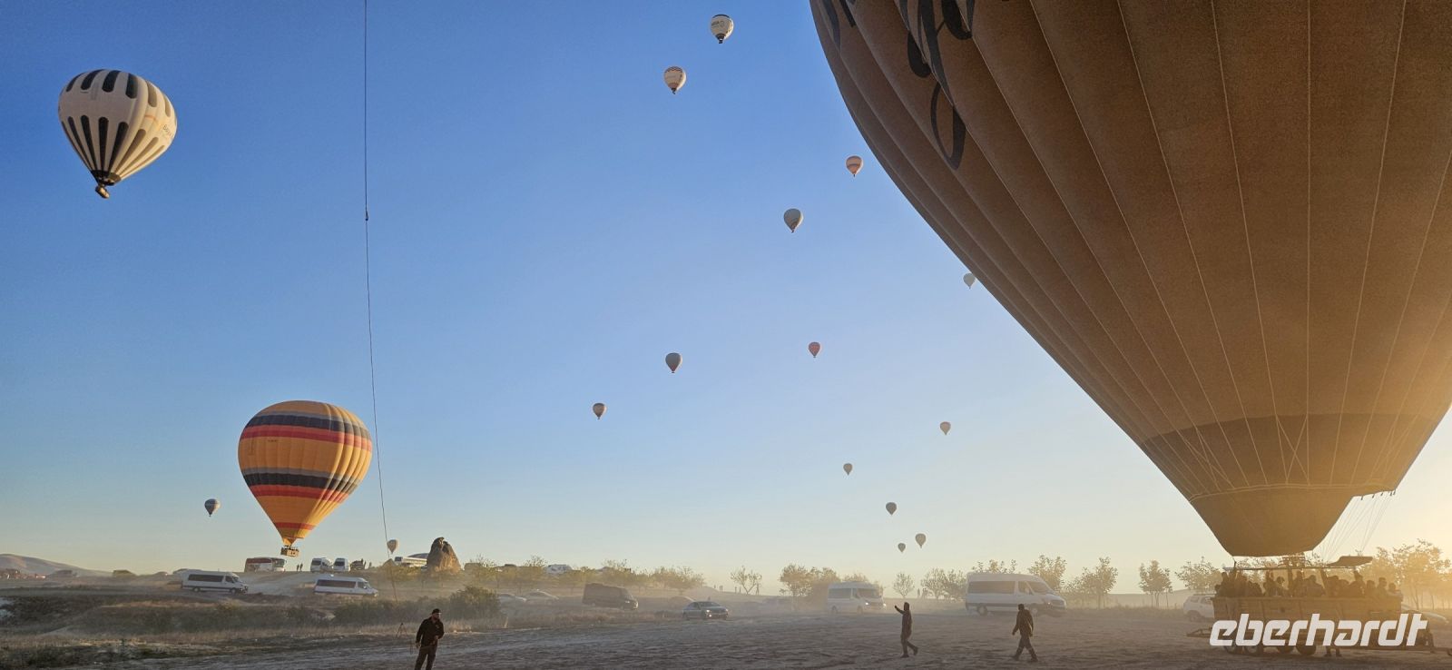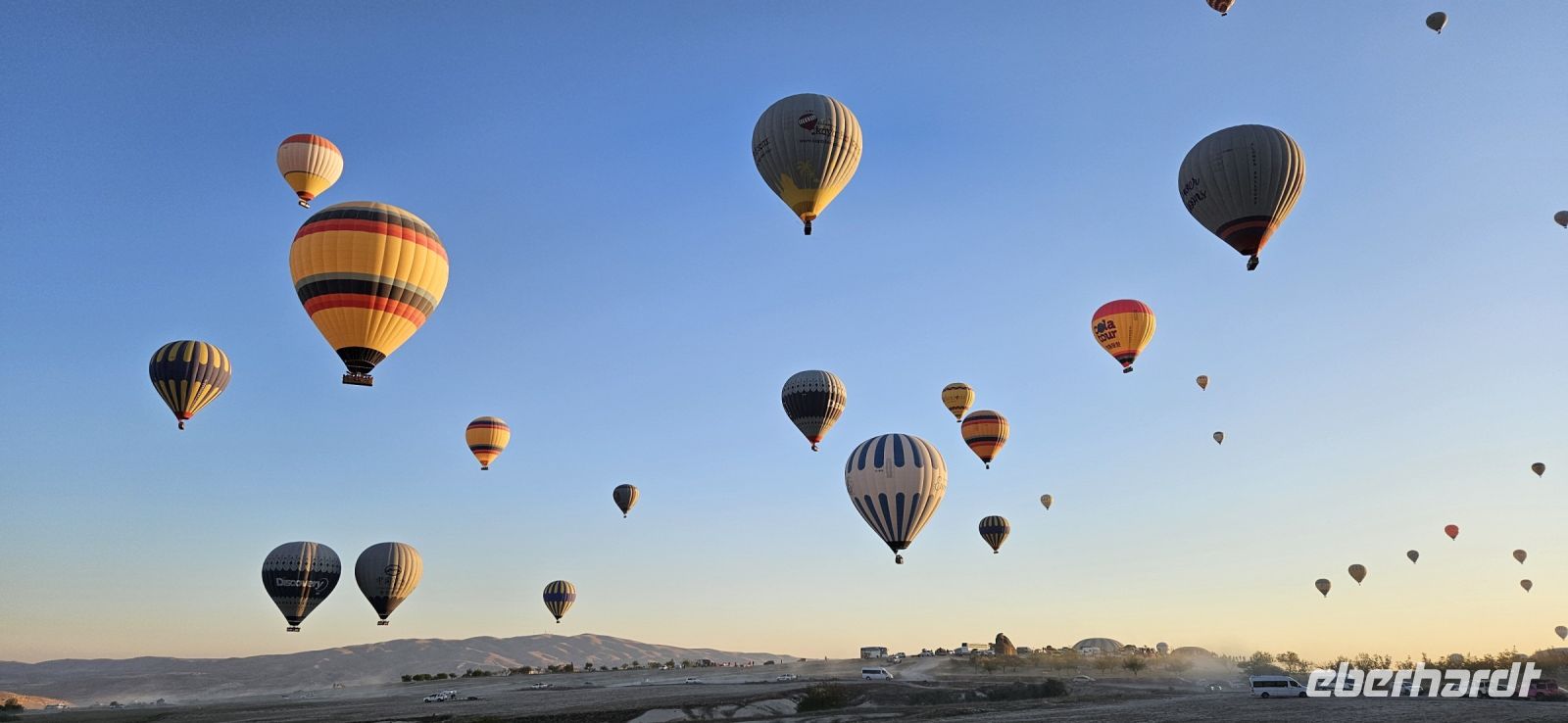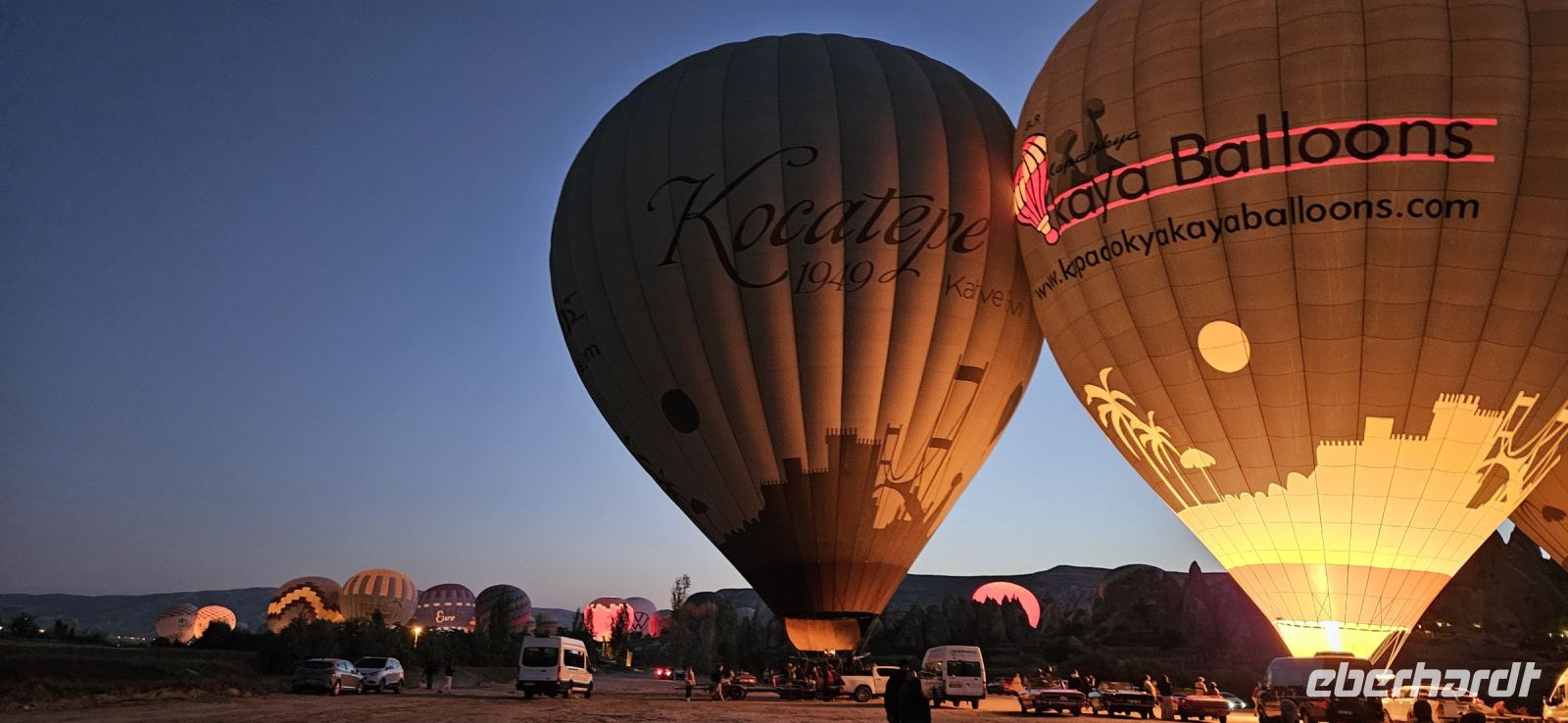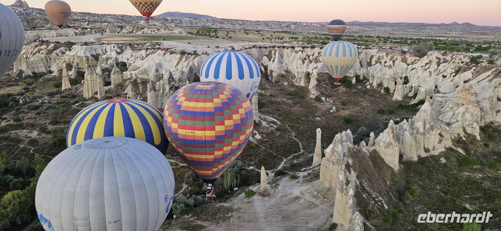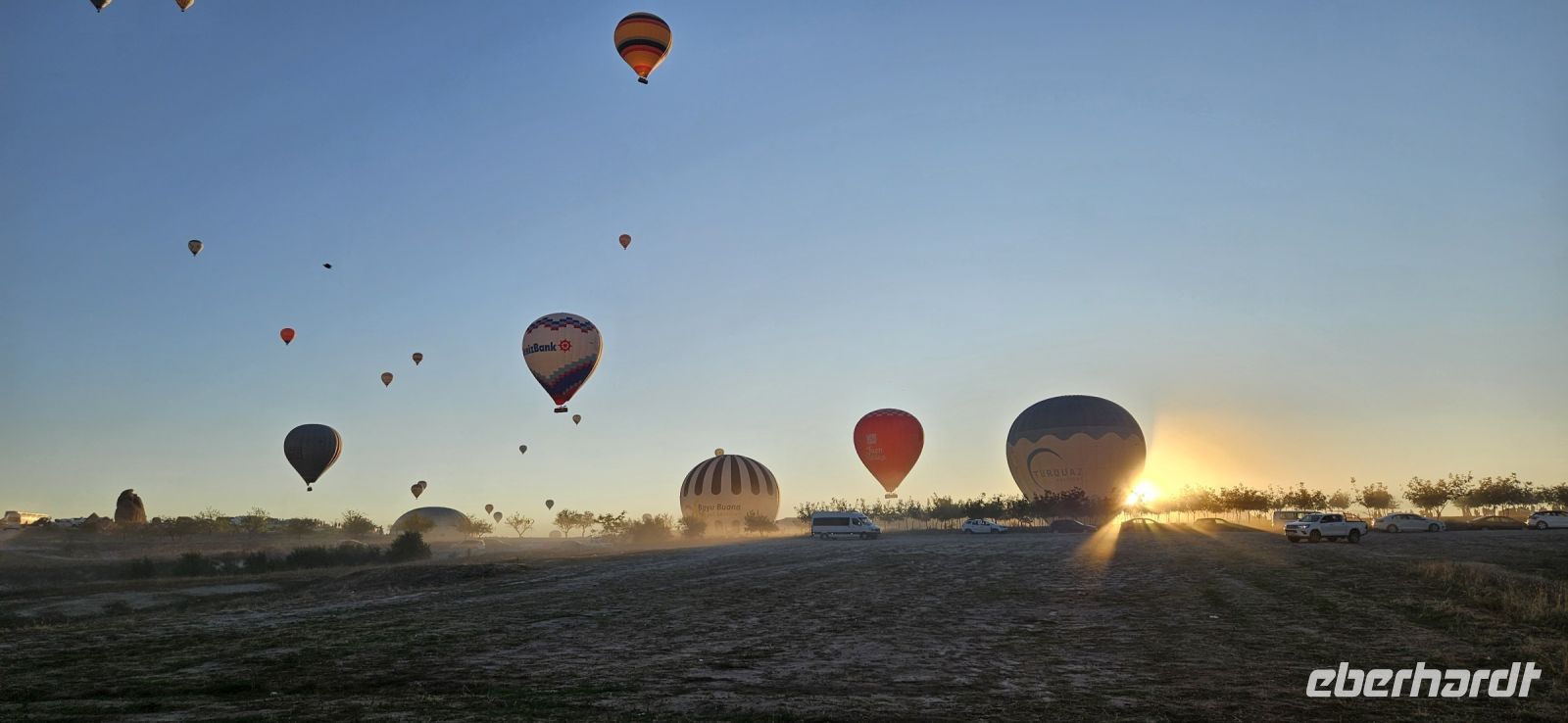 Heute stand für viele Singles DER Höhepunkt der Reise an. Kurz nach 5 Uhr wurden wir von einem Mitarbeiter der Ballon Firma Kaya im Hotel abgeholt und zu "unserem" Ballon gebracht. Kurz darauf begann das Aufblasen des Ballons. Dann richtete sich der große Korb auf und wir konnten über eine kleine Treppenleiter einsteigen. 3-4 Personen fanden in einem "Abteil" Platz und als alle drin waren, begrüßte uns Mustafa, unser Ballonführer, und sein Assistent. Um uns herum wurden die Ballons ebenfalls startklar gemacht und dann begann die Fahrt. Zunächst bewegten wir uns in Bodennähe bis das Signal zum Aufsteigen kam. Es sollen insgesamt 160 Ballons unterwegs gewesen sein und die wurden zentral dirigiert so wie die Flugzeuge am Flughafen. Es war ein unvergessliches Bild - Ballons überall. So langsam wurde es hell und als die Ballons das Liebestal erreichten, ging die Sonne auf. Wir hatten klares Wetter und konnten den Erciyes Dagi am Horizont ganz deutlich sehen. Dann begannen die Ballons in das Liebestal hinein zu fahren und kamen sich dabei sehr nahe. Nach einer Stunde erreichten wir ein großes Feld und dort stand schon ein großer Anhänger bereit, auf dem unser Korb samt Ballon landete. Für uns eine unglaubliche Leistung, aber Mustafa machte das nicht zum ersten Mal. Das Klettern aus dem Ballon auf dem Anhänger war dann nochmal speziell, aber die Kaya Mitarbeiter waren uns behilflich. Jeder bekam ein Zertifikat zur Ballonfahrt und mit einem Glas Sekt stießen wir auf das unvergessliche Erlebnis an. Dann fuhren wir zurück ins Hotel und nahmen unser Frühstück ein.