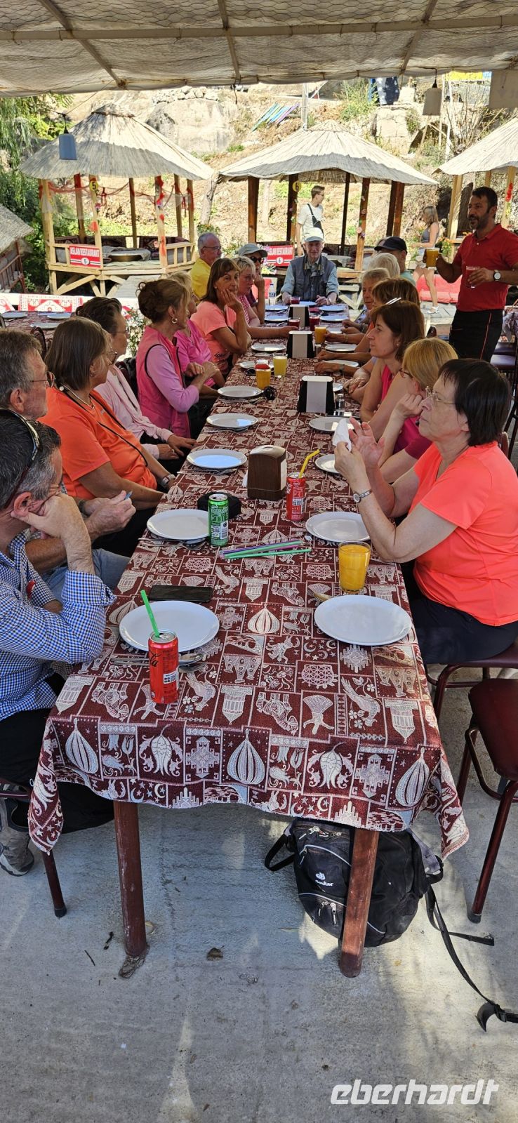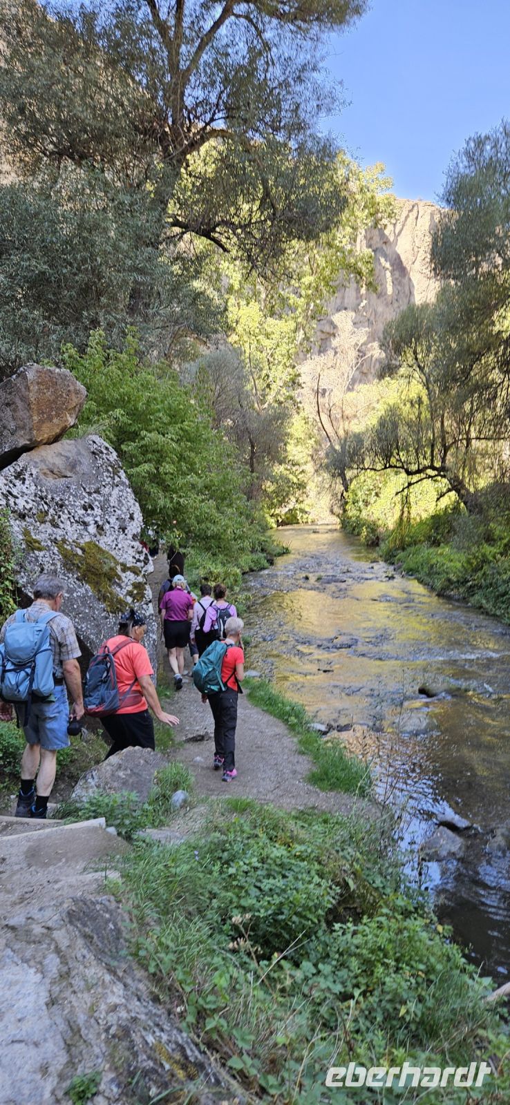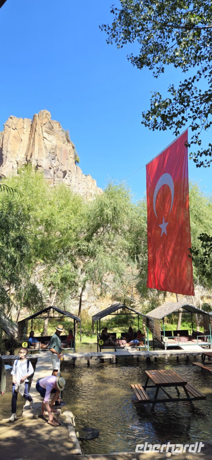 9.30 Uhr begann dann unser Ausflug ins Ihlaratal. Auf der langen Fahrt dorthin berichtete Özkan über das Wohnprojekt der TOKI Häuser, die ausserhalb der Zentren für Menschen mit geringem Einkommen und ohne Eigentum errichtet werden. Viele andere Themen wurden besprochewn und wir konnten Fragen stellen. Gegen 11 Uhr begann unsere Wanderung durch die Ihlara Schlucht, auch Grand Canyon der Türkei genannt. Auf einem breiteren Weg wanderten wir immer am Fluss entlang, besuchten unterwegs die Kokar- und die Schlangenkirche und machten unsere Mittagspause in Belisirma. Dort war es sehr touristisch, weil dieser Ort über eine Strasse sogar für Busse erreichbar ist. Nach dem Mittagessen bewanderten wir den zweiten Teil der Ihlara Schlucht und da waren deutlich weniger Personen unterwegs. Der Weg führte teil unten am Wasser und teils oben an den Felsen mit tollen Ausblicken entlang. Am Ende der Schlucht stand wieder unser Bus bereit. Wir fuhren nach Saratli und besuchten dort eine kleine unterirdische Stadt,