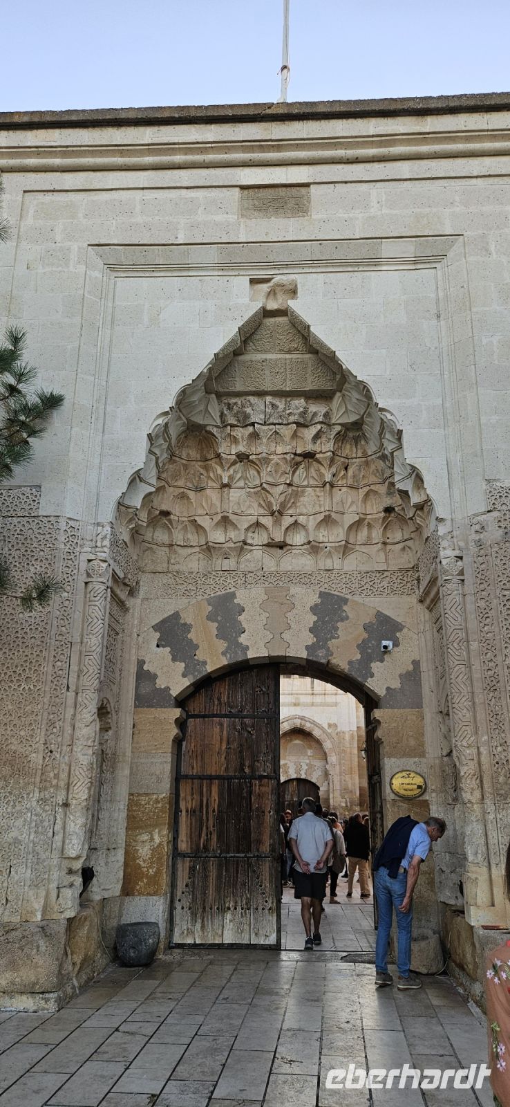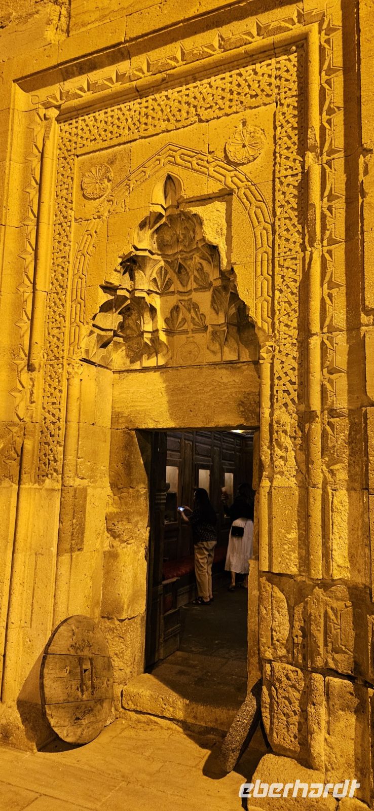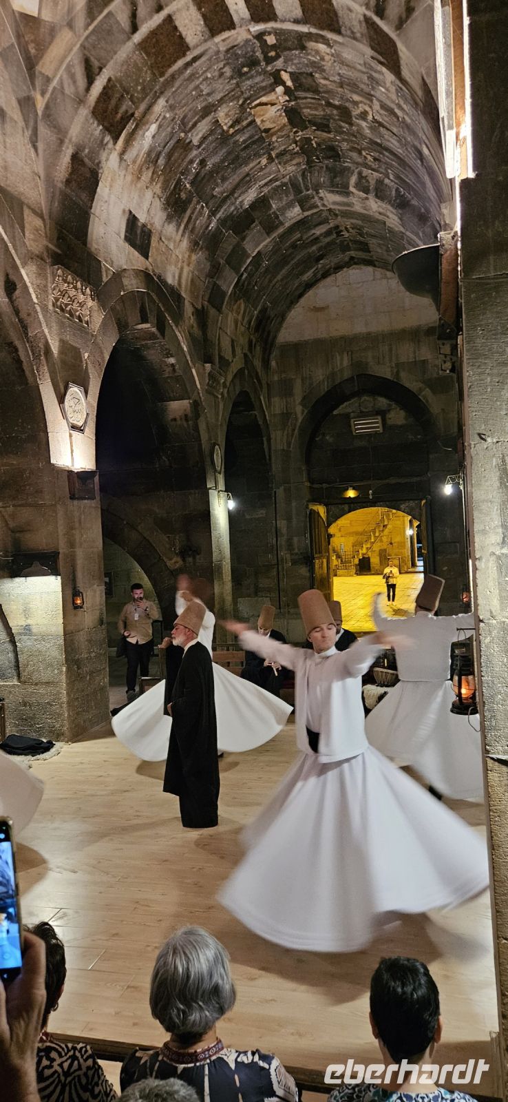 In einer Woche Kappadokien kann man natürlich nicht alle Täler bewandern, aber heute standen drei wunderschöne Talabschnitte auf unserem Programm. Alle drei liegen dicht beieinander und können beliebig kombiniert werden. Wir begasnnen mit dem steilen Abstieg in das rote Tal und da warteten wieder andere grandiose Felsformationen in verschiedenen Farben auf uns. In einem einzeln stehenden Felsen waren Bienestöcke untergebracht und wir mussten wieder durch Tunnel wandern, die das Wasser kunstvoll geformt hatte. Danach begann der Aufstieg durch das rote Tal. Dort trafen wir auf ein Ehepaar, welches Walnüsse erntete und weiter oben besuchten wir die Säulenkirche. Diese in den Tuffstein gehauene große, mondäne Kirche war beeindruckend. Wir wanderten immer weiter bergan und kamen zu einem Cafe, wo wir eine Trinkpause einlegten und den leckeren frisch gepressten Orangen/Granatapfel Saft probierten. Beim Cafe war die Kreuzkirche im Fels zu besichtigen. Danach wanderten wir weiter durch das Rosental bis hinunter ins Schwertertal. Dort konnte ein Kloster im Fels "erklommen" werden. Es war wieder ein sonniger und sehr warmer Tag und so kürzten wir die Wanderung etwas ab und fuhren zum Mittagessen nach Avanos, wo wir in einer Karawanserei das Testi Kebab probieren konnten. Es handel sich um eine Art Gulasch, zubereitet in einem Tonkrug mit viel Gemüse. Danach brachte uns der Bus zurück ins Hotel. Wir konnten uns ein wenig ausruhen, frisch machen und am frühen Abend fuhren wir zur Karawanserei Sanhan. Die Karawansereien wurden entlang der Seidenstrasse ca. aller 30 km gebaut, um den Karawanen Schutz zu bieten in der Nacht, die Tiere zu füttern oder auch auszutauschen und die wertvollen Waren sicher einzulagern. In der Karawanserei von Sanhan finden heute regelmässig Vorführungen der Derwische statt. Das Tanzritual - Sema - fand im Winterraum der Karawanserei statt und war sehr beeindruckend. Nach der Vorstellung konnten wir die Atmosphäre des beleuchteten Innenhofes der Karawanserei geniessen und dann brachte uns der Bus zurück ins Hotel.