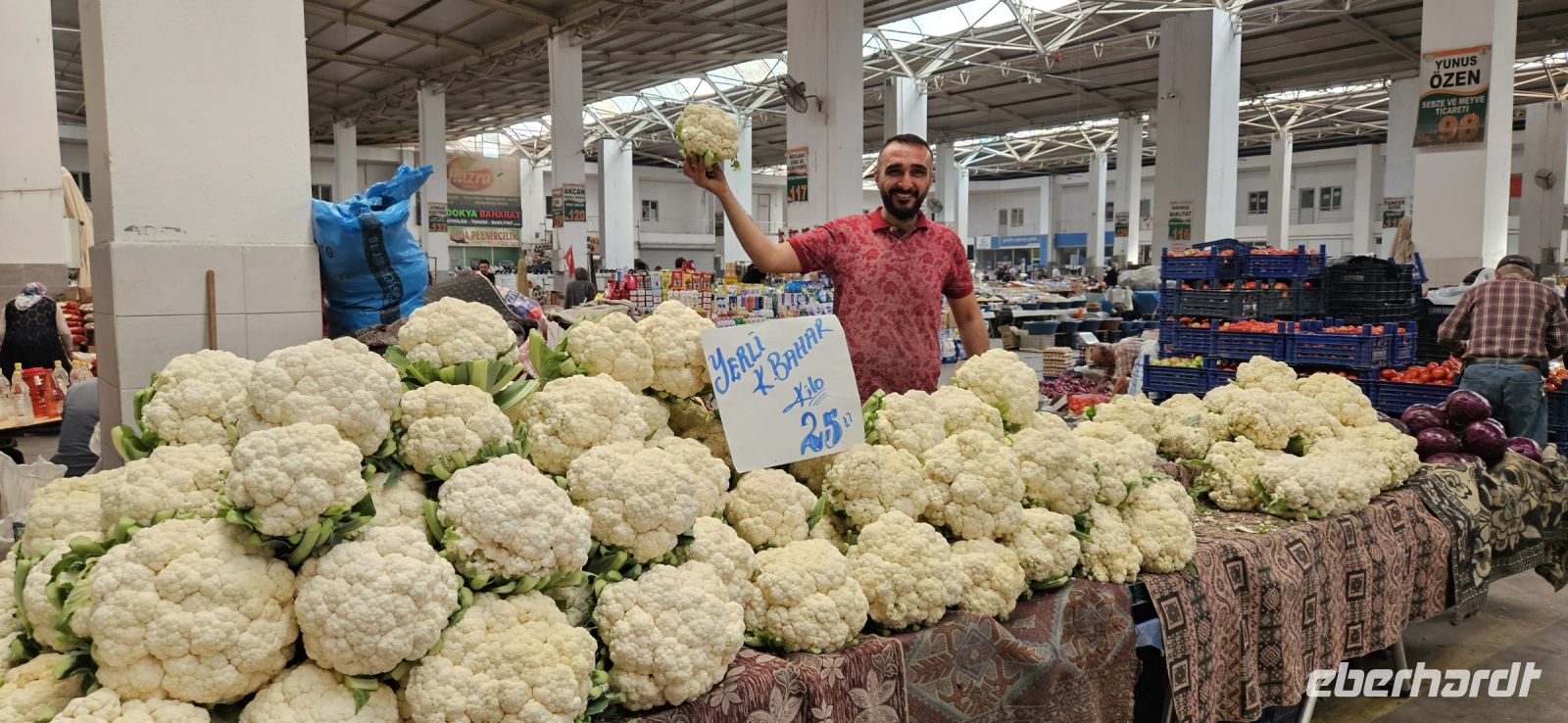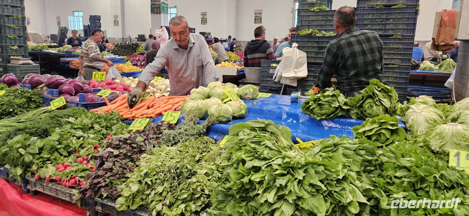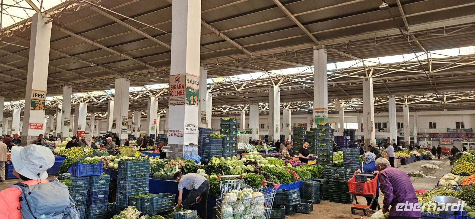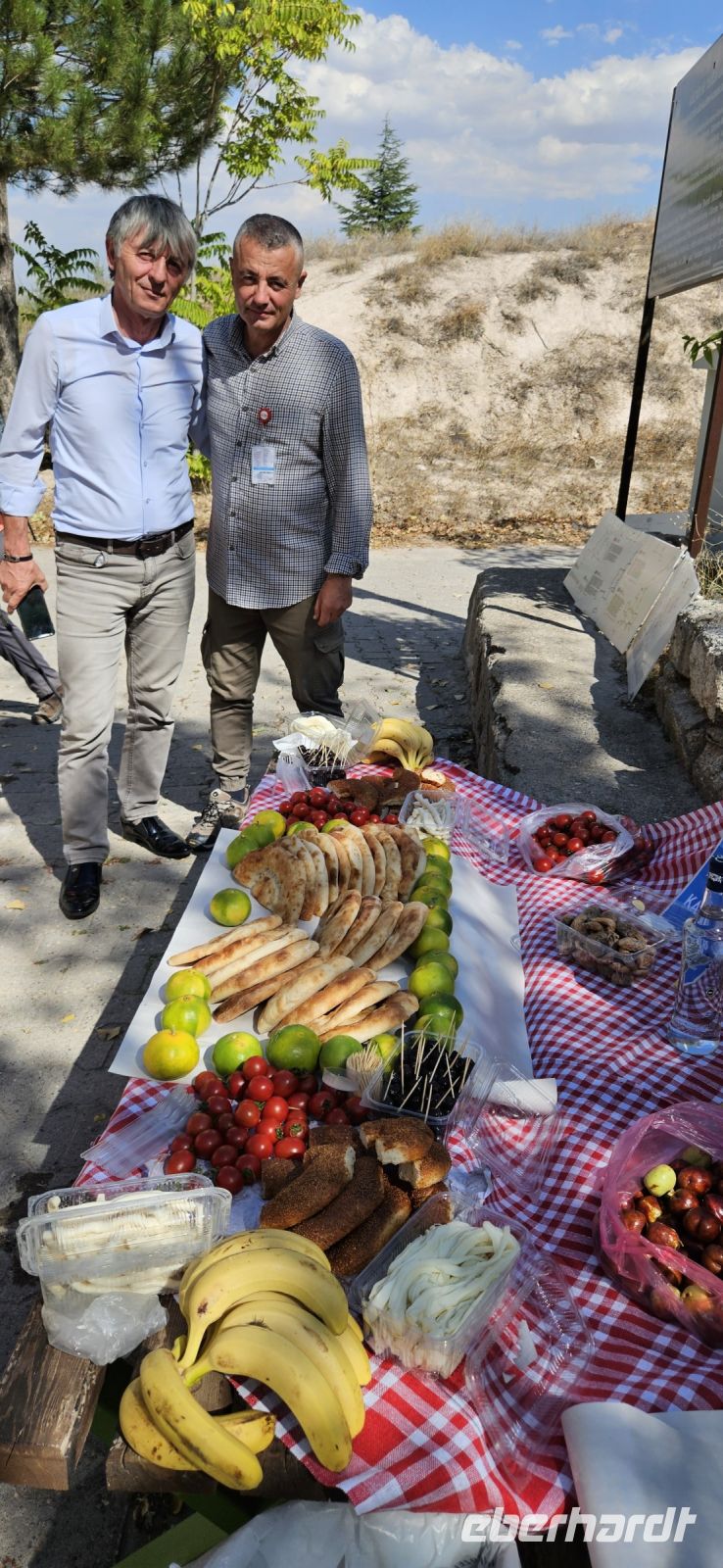 Immer montags gibt es in Nevsehir den großen Wochenmarkt und dort kauften Özkan und ich für unser Picknick ein. Die Fülle des frischen Obstes und Gemüses war beeindruckend und so riesige Weißkohlköpfe hatte ich noch nie gesehen. Das frische Brot besorgten wir dann noch in einer Bäckerei. Heute stand unsere letzte Wanderung an und die führte uns durch das Cat Tal. Sie begann im Dorf Cat und ging weiter zu einem Plateau mit einer großen türkischen Flagge. Von da an führte der Weg wieder steil bergab bis hinunter zu einem kleinen Bächlein. Dort flossen auch die geklärten Abwässer des Dorfes und das Bächlein mussten wir ständig überqueren. Das Cat Tal war geprägt von mächtigen Felswänden zu beiden Seiten, in denen einst Nekropolen waren, die zu Taubenschlägen umfunktioniert wurden. Es gab viele Stechapfel Pflanzen im Tal und sogar eine Schildkröte wurde gesichtet. Am Ende des Tales war ein großes Areal mit besonders schön geformten Felsen und einem großen Pilz. Es war wieder sehr warm und so freute sich jeder auf das Picknick in der Natur. Beim Wärterhaus am Eingang zum Felsareal bauten wir das Picknick auf und genossen die frischen Produkte vom Markt. Zum Abschluss gab es einen Raki und wir bedankten uns sehr herzlich bei Özkan und Okdan für die gute Betreuung und sichere Fahrweise. Dann fuhren wir nochmals nach Avanos und hatten genügend Freizeit zum Besuch einer Töpferei, zum Kaffeetrinken und zum Probieren von Ziegenmilch Eis, welches man mit Messer und Gabel isst. Schon tagsüber waren viele Wolken am Himmel und gegen Abend wurden es immer mehr. Es stürmte und der Sand wirbelte durch die Luft. Wir erreichten sicher unser Hotel. Nach dem Abendessen sassen wir zusammen in der Lobby und liessen unsere wunderschöne Woche in Kappadokien noch einmal Revue passieren. Über Nacht regnete es stark.