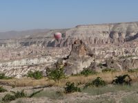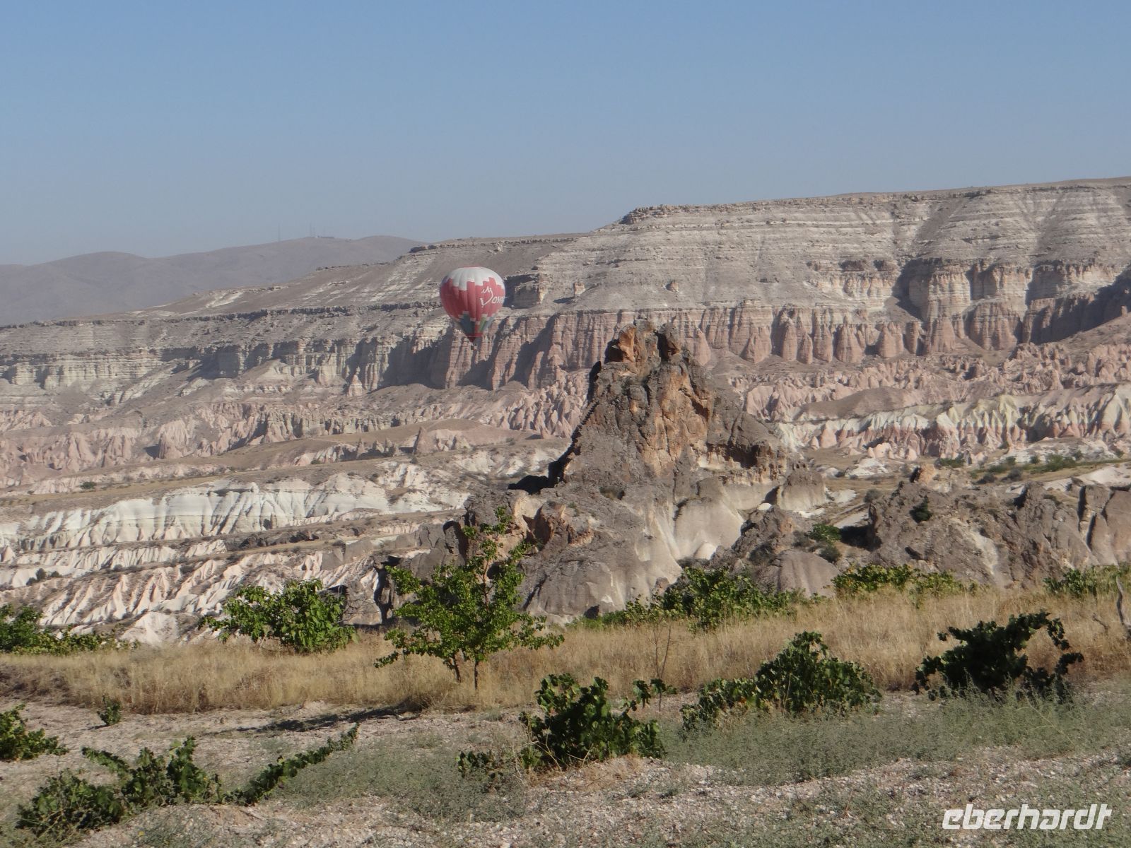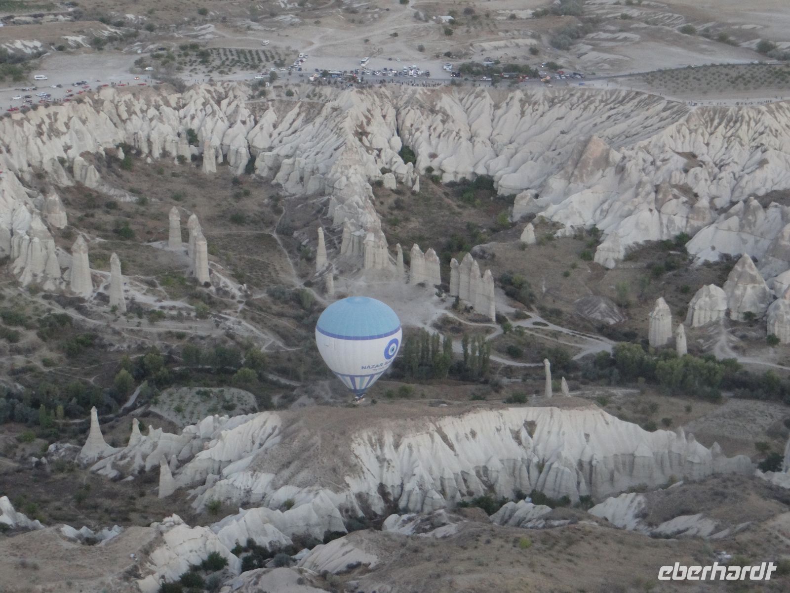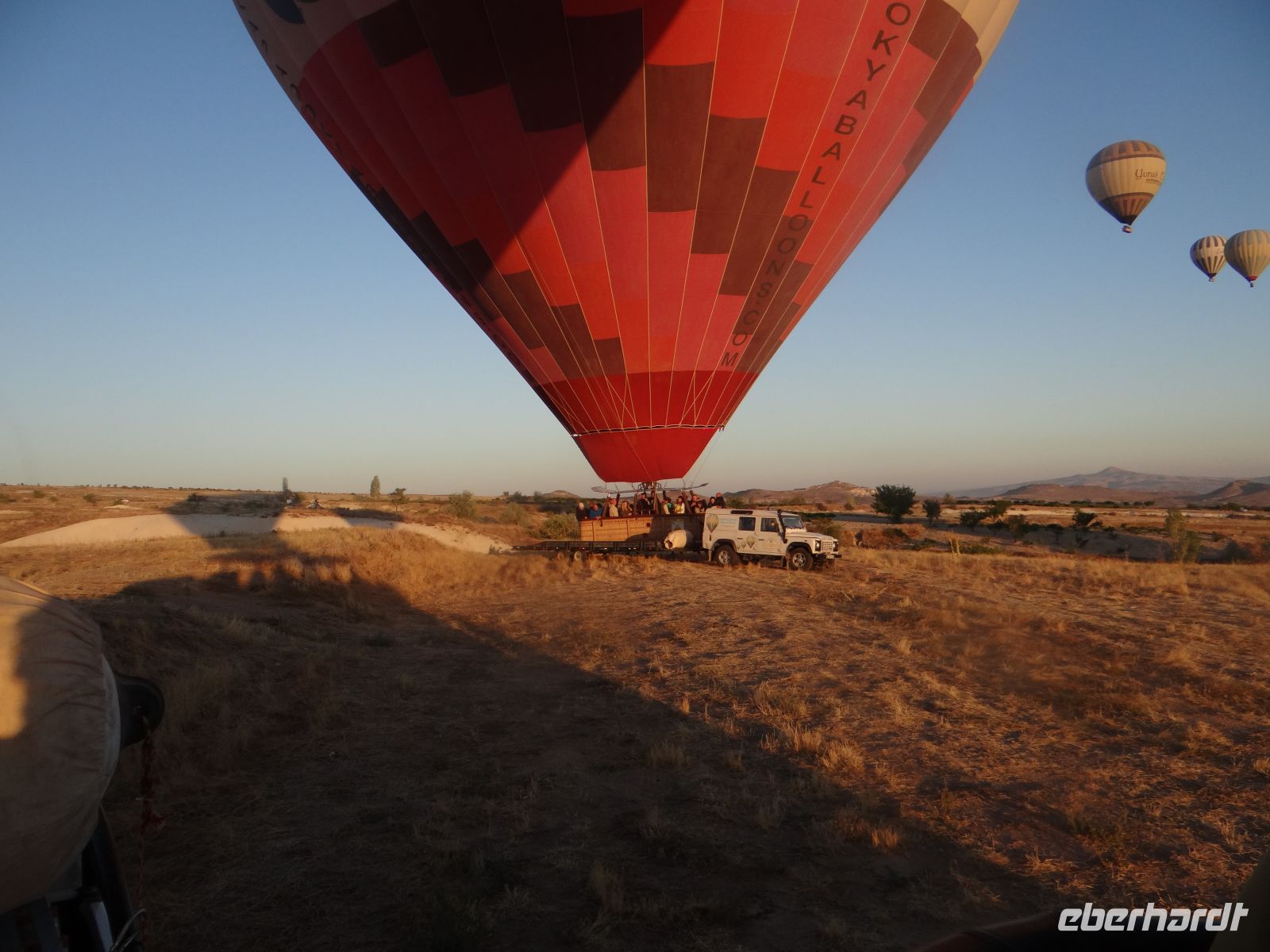 Von oben sieht man, dass jede Fläche bewirtschaftet ist. Wir sehen die Festung von Uçhisar, die sich hoch über die Ebene erhebt. Wir sehen die Felswand, die das Rote Tal begrenzt, in dem wir gestern gewandert sind. Man sieht sich ein und ist viel zu schnell wieder unten. Die Landung ist spektakulär, denn wir landen nicht auf dem Boden, sondern gleich auf dem Anhänger, der das Fluggerät in die Garage fährt. Es braucht einige Schubsen des Korbes in die richtige Richtung, dann steht er in der richtigen Position und wir krabbeln heraus. Dann eilt die Bodencrew zum Ballon, der zu Boden sinkt. An Schnüren wird er zu Boden gerungen wie ein großes wildes Tier, das sich aufbäumt und doch keine Chance hat. Die Hülle wird zusammengerollt und auf dem Anhänger verstaut.