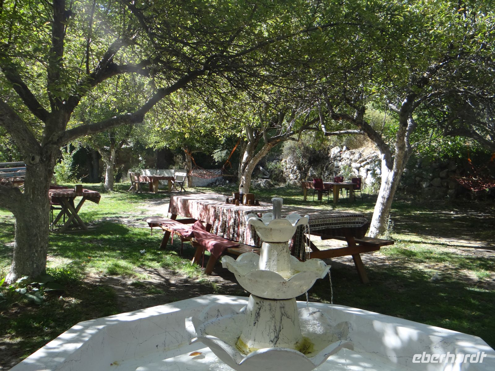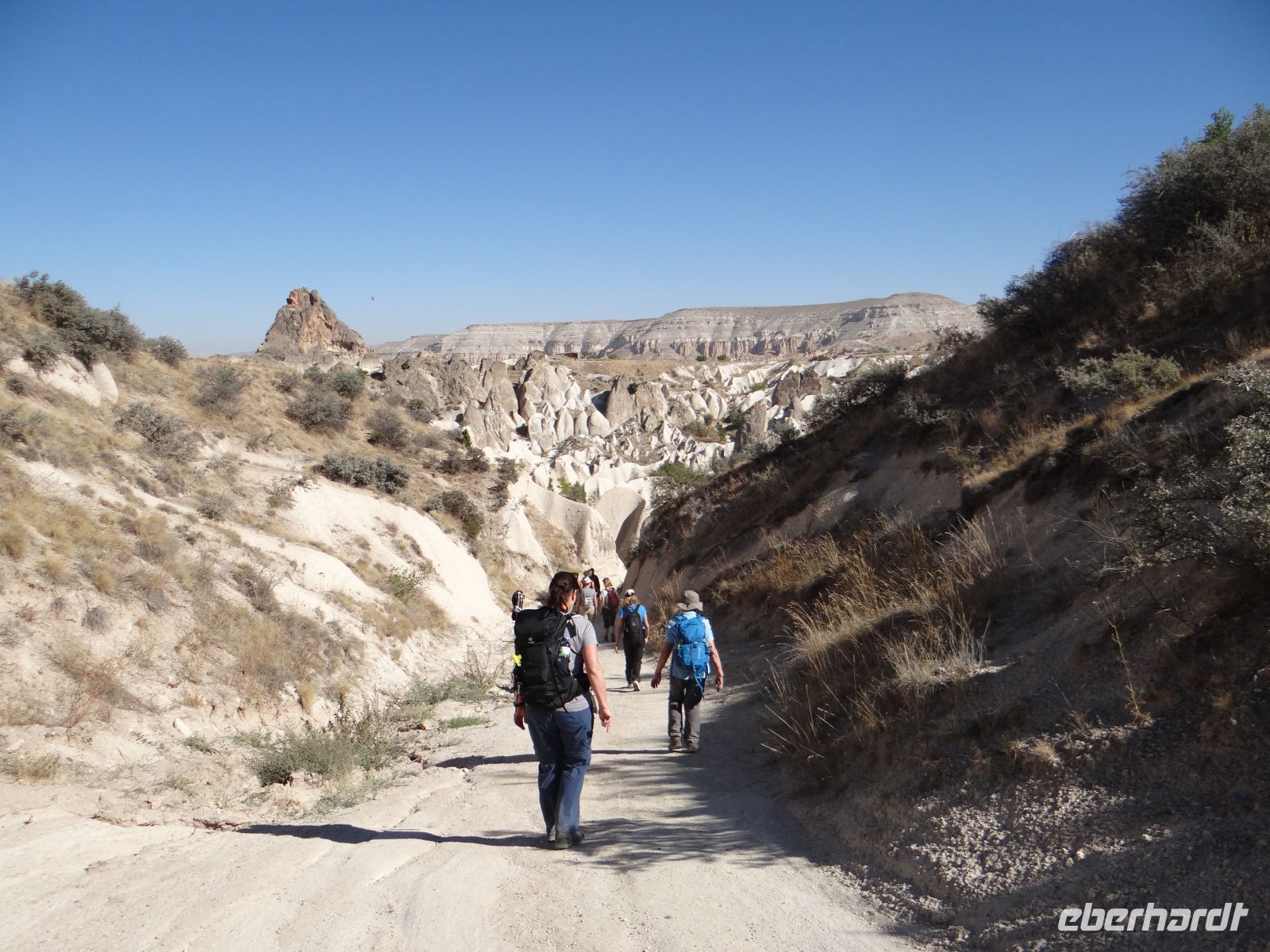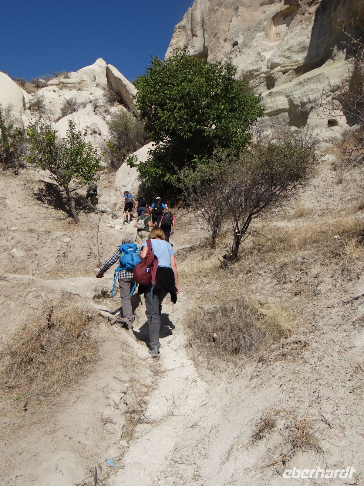 Erey, unser Busfahrer, setzt uns aus und dann folgen wir wie brave Schafe unserem achtsa-men Hirten Hüseyin, der uns zunächst durch das Meskendir-Tal führt. Entlang an Weinreben geht es hinunter in ein schmales Tal, das uns auf Schritt und Tritt überrascht: gewundene Wege, die durch Tunnel führen, vorbei an Walnussbäumen, gepflegten Gärtchen. An einer Biegung ein Café, es gibt frisch gepresste Säfte, mit bunten Teppichen und Stoffen ausgeleg-ten Bänke unter einer Pergola. Auf dem Holzfeuer siedet eine Fleischbrühe vor sind hin. In der Sonne dörren Granatäpfel, um daraus Tee zu machen. Hüseyin füttert uns unterwegs mit wilden Trauben, die Büsche und Bäume umschlungen halten.