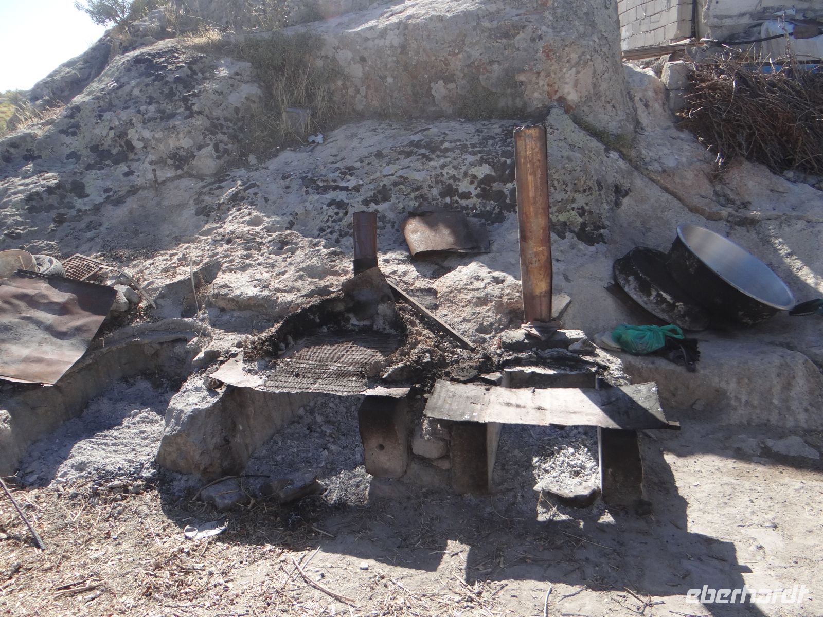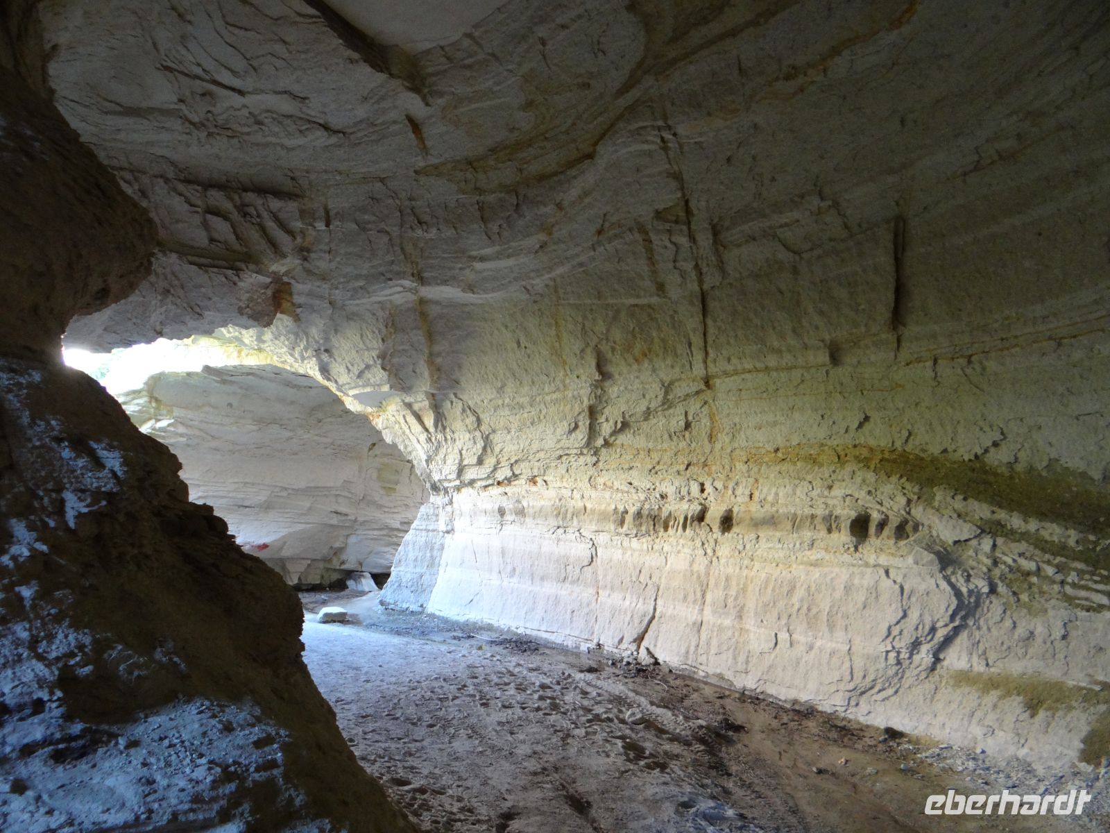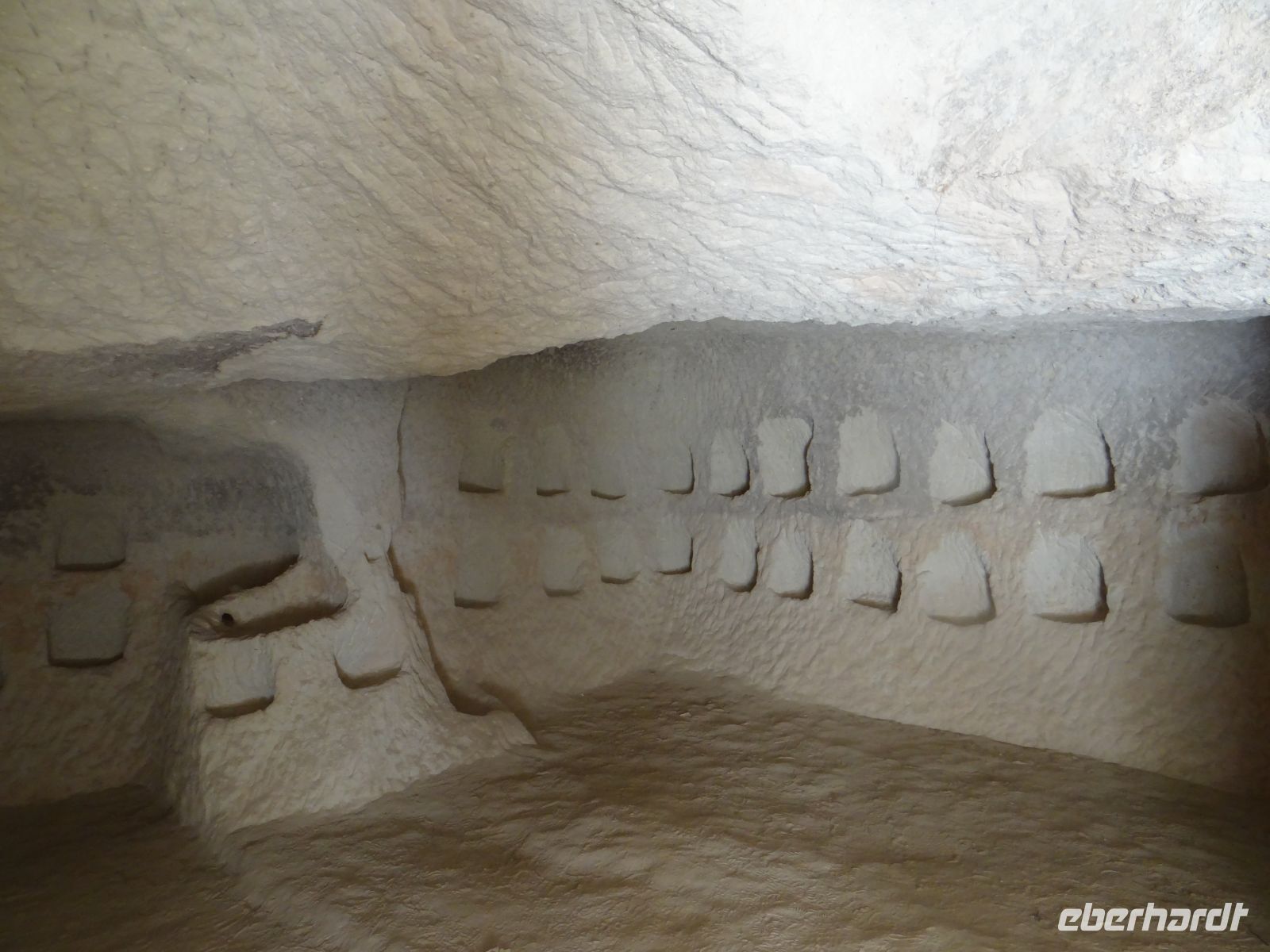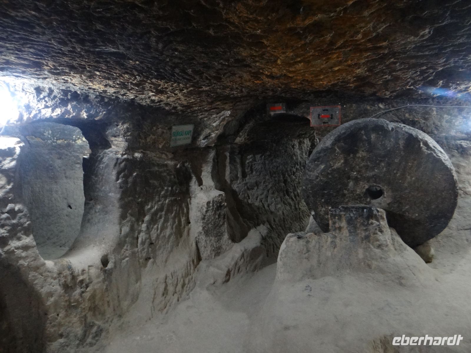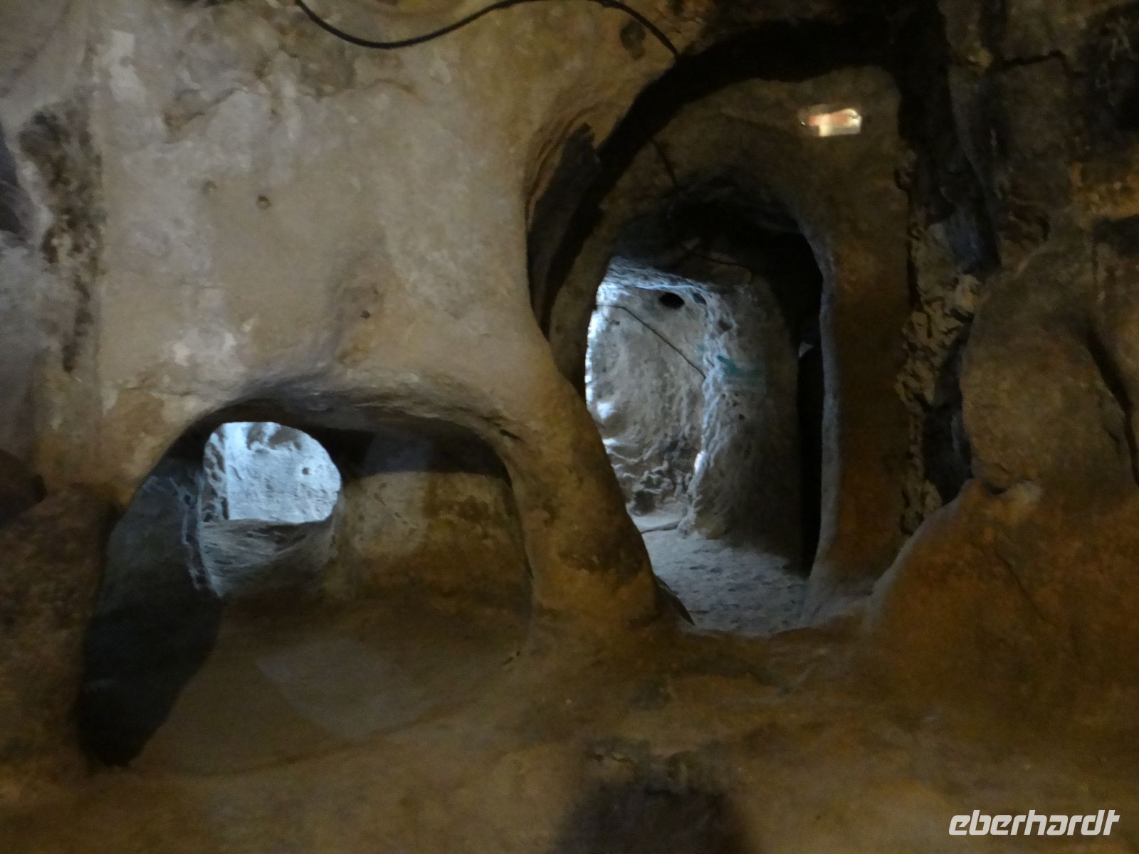 Ein Labyrinth aus Gängen und Räumen durchzieht den Felsen. Die Durchgänge wurden mit großen runden Steinen verschlossen, Mühlsteinen ähnlich, in der Mitte ein Loch, um sie zu bewegen. Da müsste man schon Obelix sein, so schwer sind sie. Es gibt kleinere und größere Räume, z.T. durch ein Loch verbunden, um zu sehen, was nebenan vorgeht. In einem Stall mit Futterkrippen wurden die Tiere in Sicherheit gebracht. Länger als 2,3 Wochen blieb hier keiner, denn es war stockdunkel. Über Lüftungslöcher kam Frischluft in die Gänge.