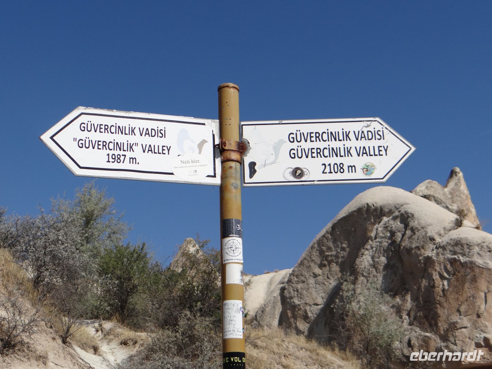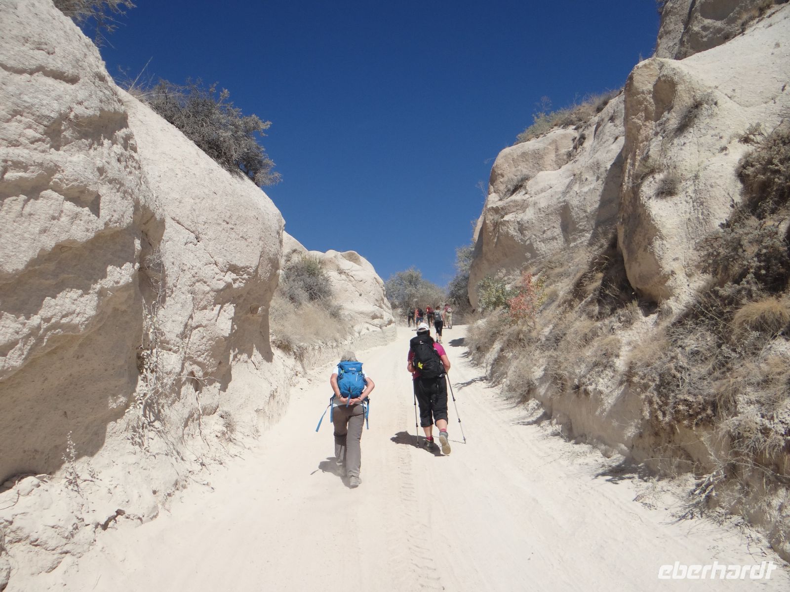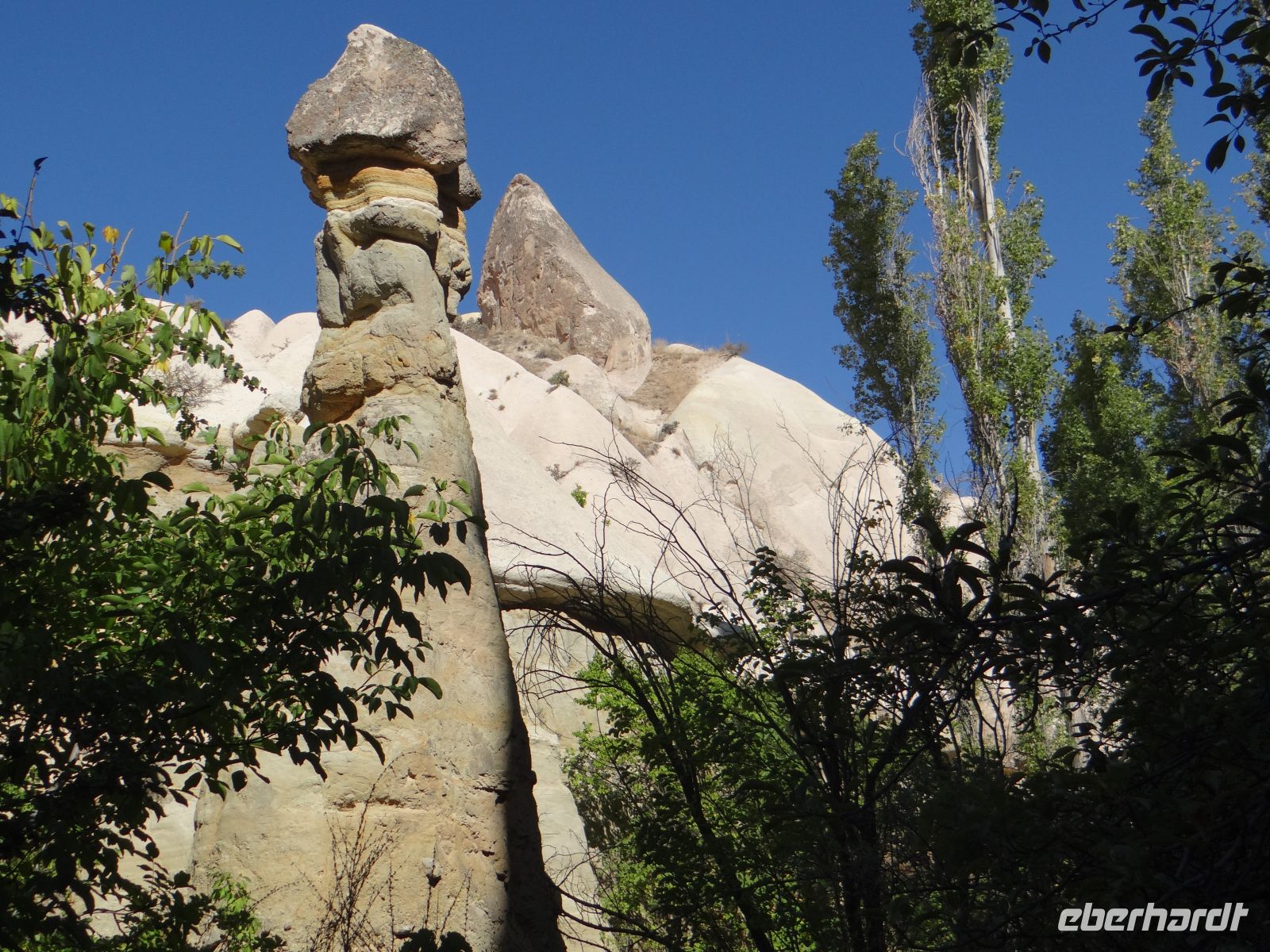 Dann der gleitende Übergang ins Liebestal. Ach, jetzt verstehen wir…. Hier stehen die Feenkamine wie phallusartige Gebilde in der Landschaft und ist es rührend oder Hilflosigkeit, diesem Talgrund diesen Namen gegeben zu haben? Wir sind hier unten im Tal und stehen unmittelbar vor diesen Säulen. Oben sind die Fotostopps für die Touristen, die nicht unsere Zeit und unsere Lust am Wandern haben und sie schauen auch noch gegen die Sonne. Was geht es uns gut.
