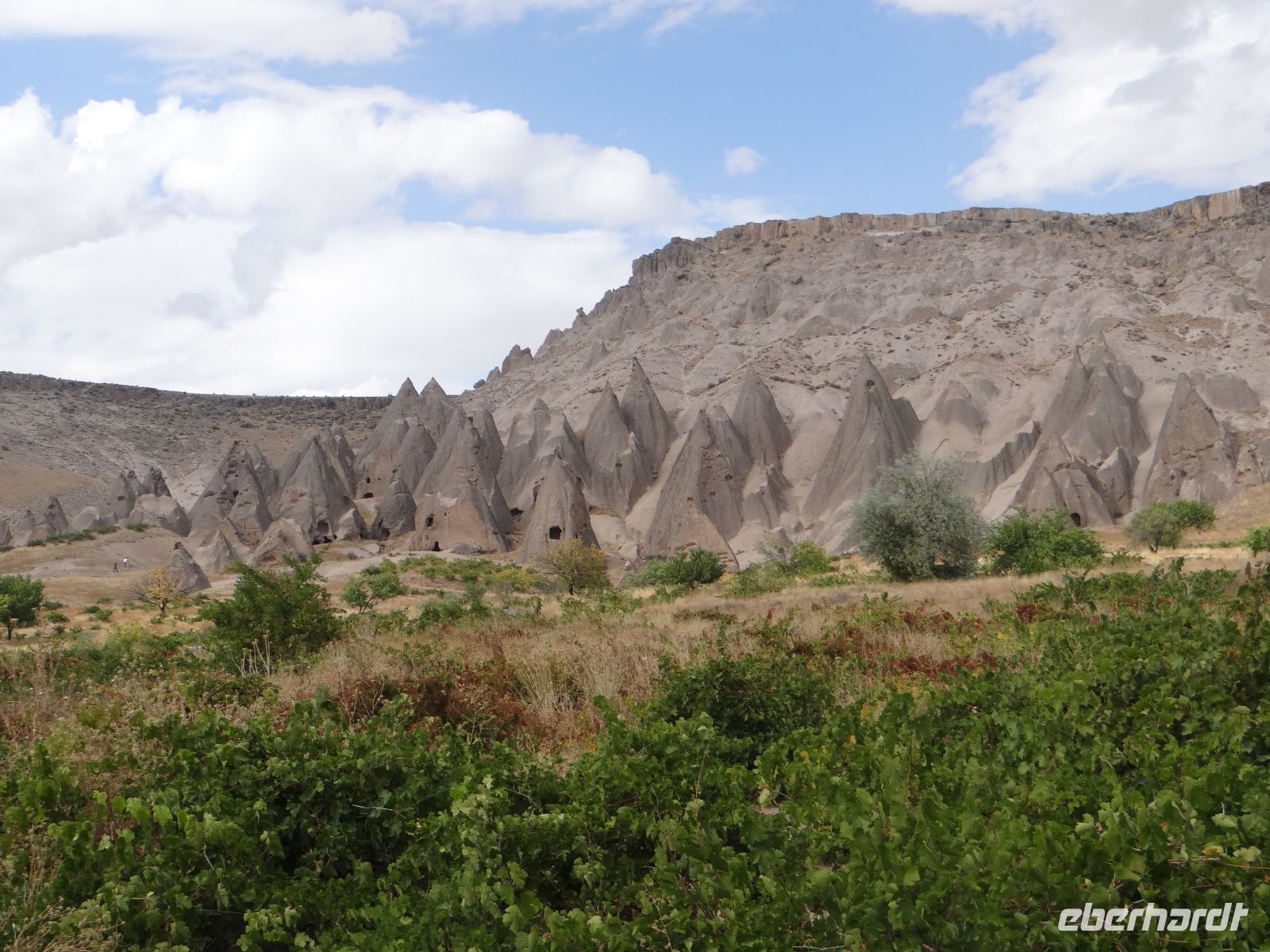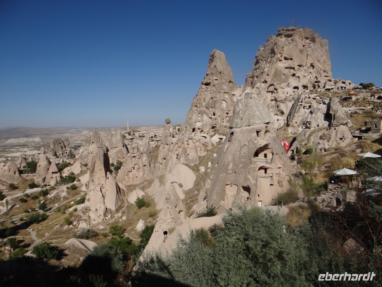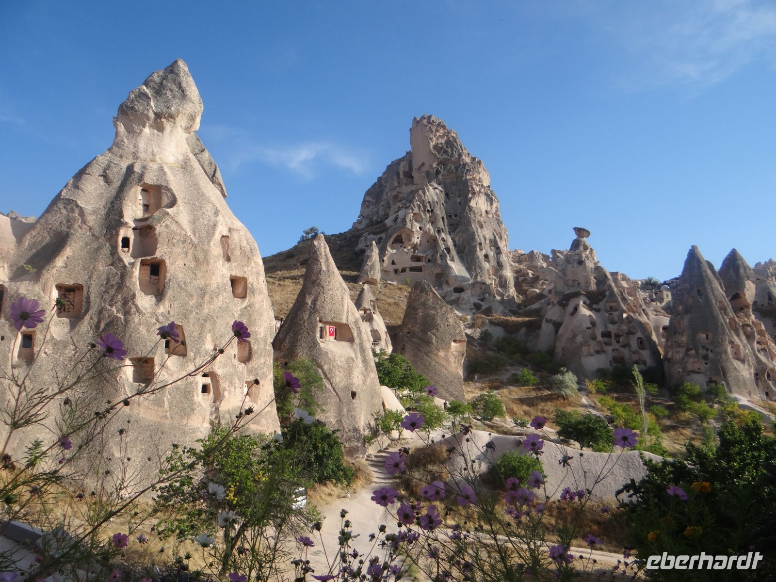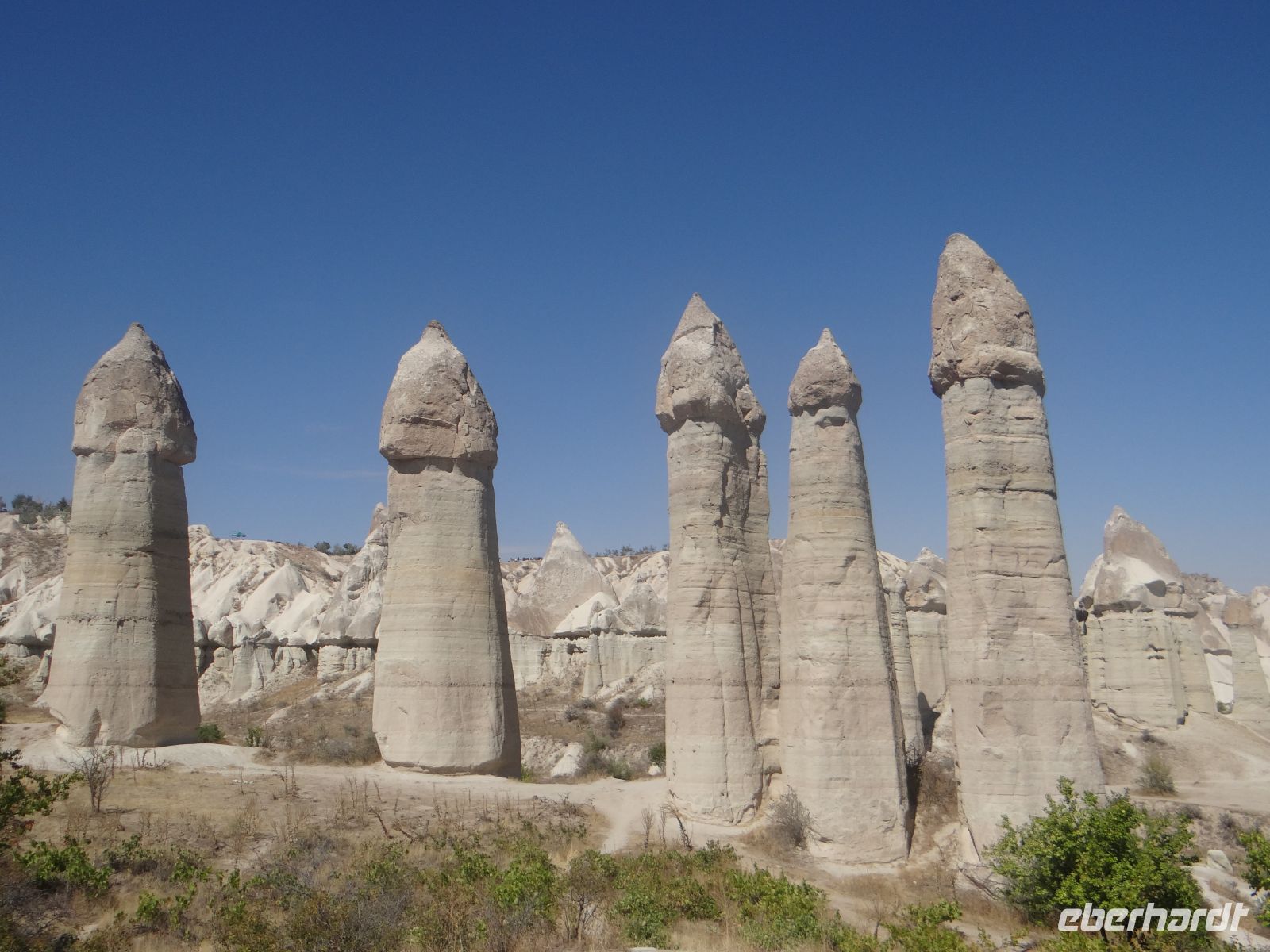 Diese Felsformationen! Und wie wenn das nicht genug wäre, die in den Stein geschlagenen Taubenverschläge. Die Felsen als Vogelverschläge! Durchzogen wird die Landschaft von abgeschliffenem Vulkangestein, die aussehen wie große Zipfelmützen und Feenkamine ge-nannt werden.