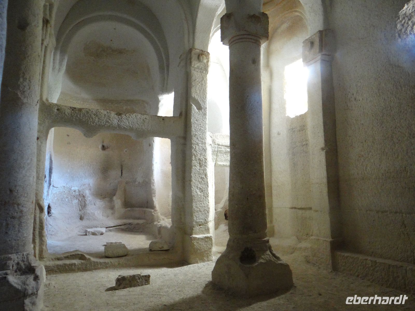 Eine der ältesten Höhlenkirchen von Kappadokien ist die Johanneskirche vermutlich aus dem 5. Jahrhundert. Nach einem Felsabbruch 1963 ist von ihr nur noch die Apsis mit in den Felsen gehauenen Bänken zu sehen. Die Wände waren stuckiert und bemalt. Medaillons mit Köpfen erkennt man noch und Engel. Doch leider sind die Kostbarkeiten zerkratzt. Ein Jammer. Jeder kann hier jederzeit kommen und gehen, seinen Müll liegenlassen.