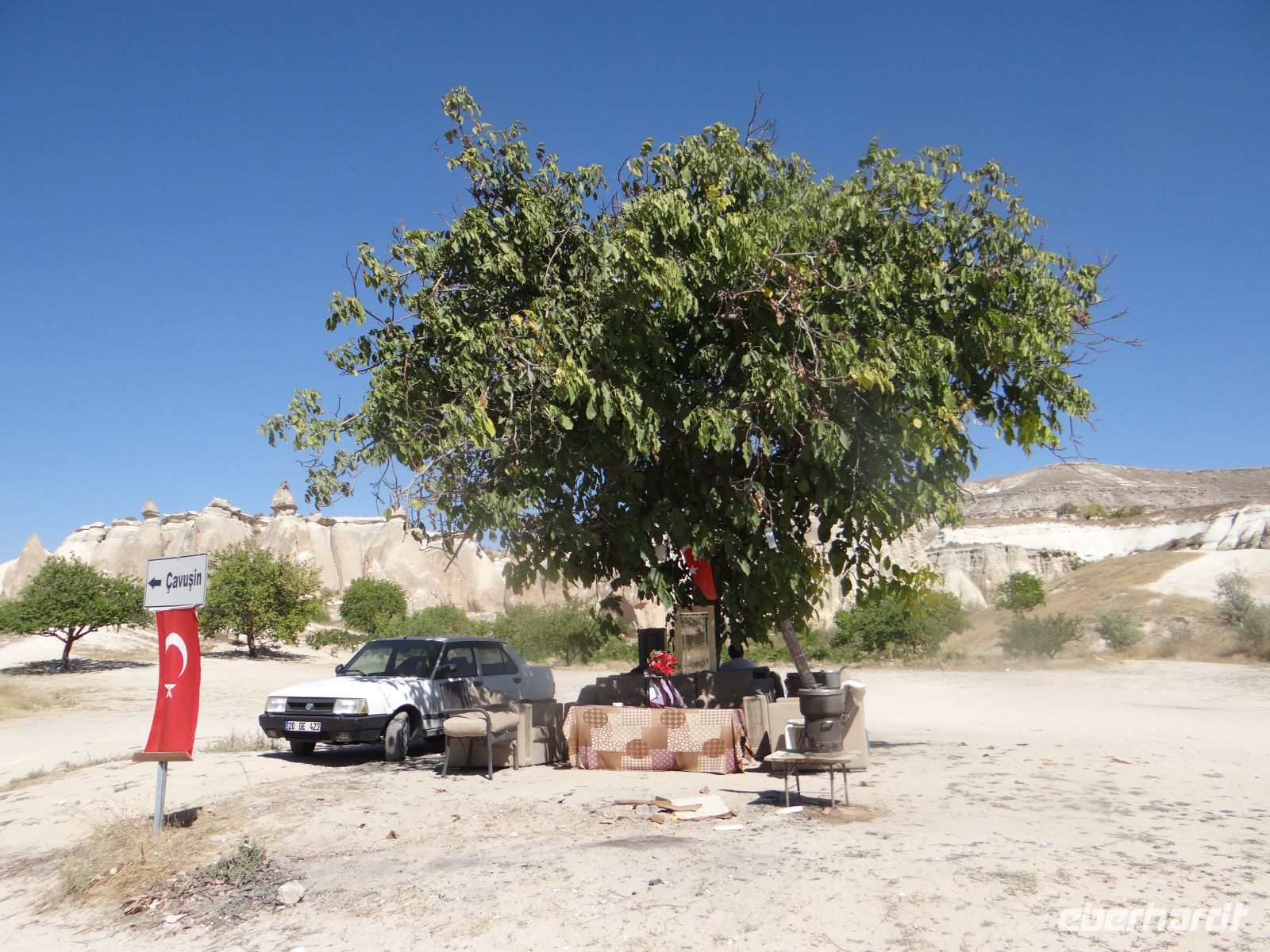 Erey, unser sehr netter Busfahrer, mit seinen 22 Jahren und seinem scheuen sympathischen Lächeln der Liebling jeder Schwiegermutter, holt uns ab und bringt uns zum Mittagessen. Das Touristenlokal ist einer Karawanserei nachempfunden und wirkt einladend. Die Spezialität ist Testi Kebab; ein Tongefäß wird mit Rindfleisch, Paprika, gebratenen Auberginen, Tomaten und Zwiebeln gefüllt, gewürzt mit Thymian und mit einer Brotdeckel verschlossen in den Backofen gestellt. Das Ergebnis ist köstlich und kann zu Hause im Römertopf nachgekocht werden. Der Tontopf hat damit seine Aufgabe erfüllt, er kann leider kein weiteres Mal verwendet werden und ist somit Wegwerfgeschirr.