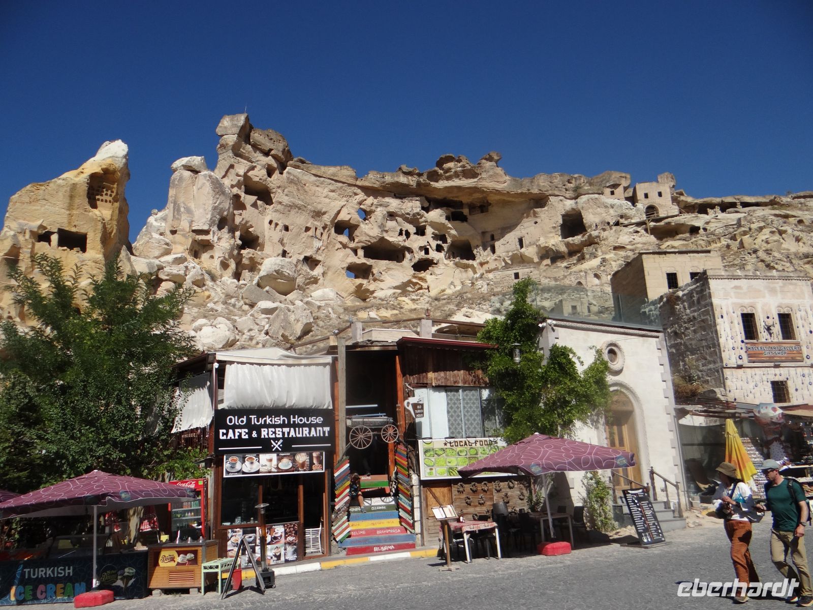 Hüseyin lädt uns zunächst in ein Hotel ein, lauschig mit weinumrankter Pergola. Hier gibt es Zimmer, die in den Fels gebaut worden sind. Das ist sehenswert. Dann geht es zum kleinen Zentrum, gepflegte Hausfassaden, kleine Terrassen von Cafés und Hotels, die zum Verweilen einladen.