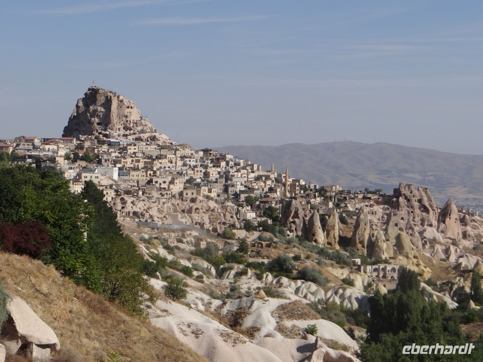 Wir fahren nach Uçhisar. Neben malerischen Häuschen und steilen, winkeligen Gassen hat die Stadt eine einmalige Sehenswürdigkeit zu bieten – die Burg von Uçhisar. Schon die Hethiter nutzen diese Burg 2000 v. Chr. 1.000 Menschen sollen hier gelebt haben – ein Wohnturm. Die Burg erinnert äußerlich an ein Termitennest. Über zahlreiche Stufen steigen wir zur Spit-ze hoch und haben einen wunderschönen Blick über die Landschaft. Dass sie so schöne Wanderstrecken birgt wie unsere heutigen, sieht man ihr von hier oben nicht an.
