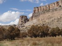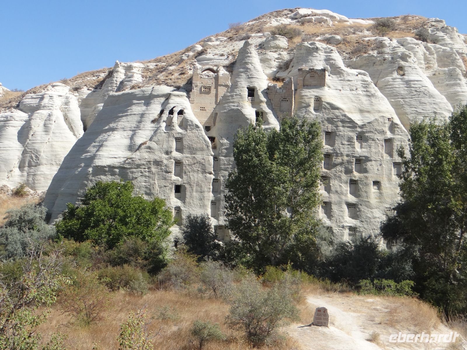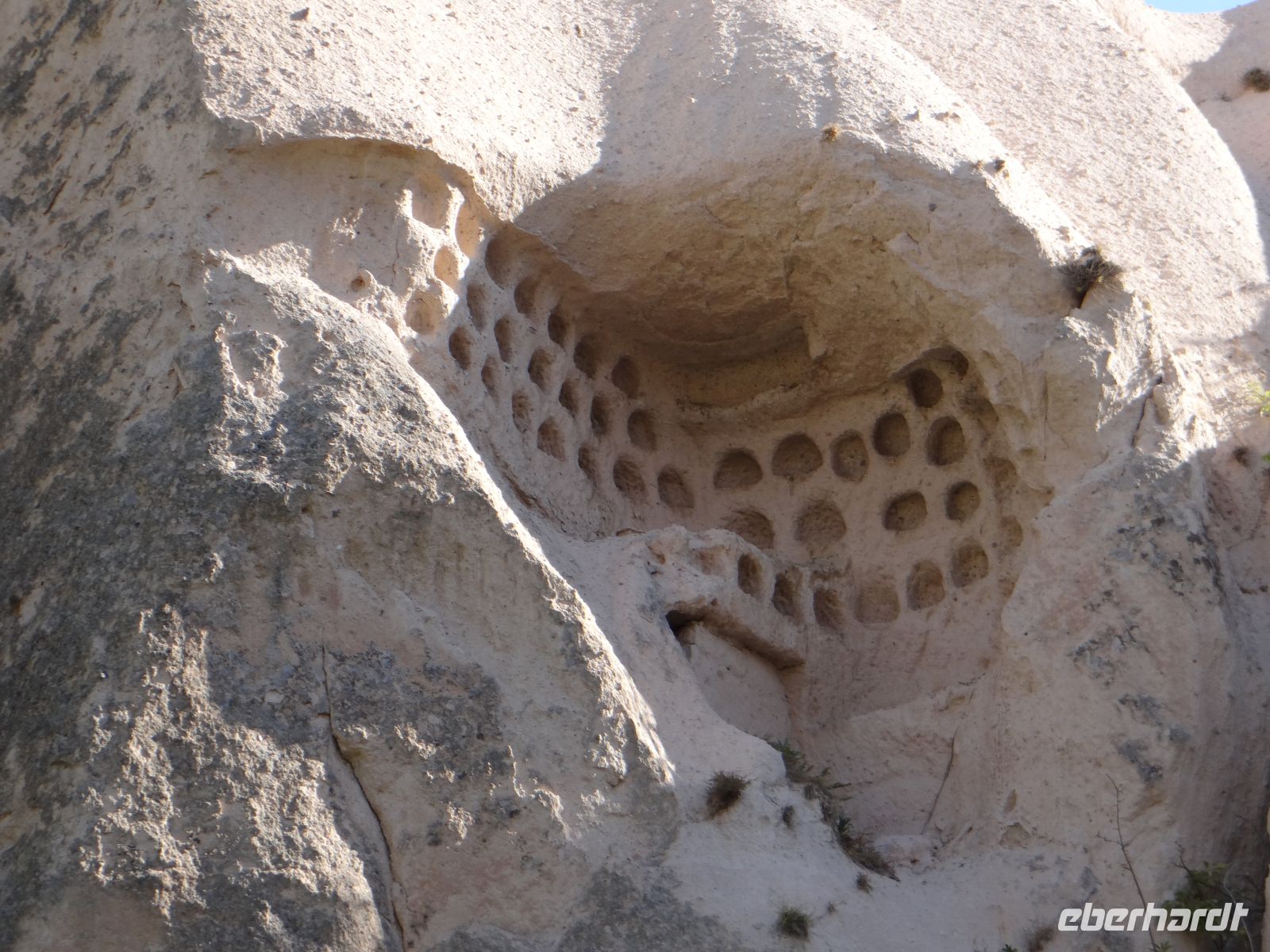 Die Pferde scharren mit den Hufen und so geht es zum Gomeda-Tal, eines der weniger bekannten schönen Täler Kappadokiens. Ein bequemer, eben verlaufender Weg führt hindurch. Links und rechts das uns nun schon bekannte Bild der in den Fels gehauenen Taubenschläge, die vor Jahrhunderten in die Felsen gehauen worden sind.