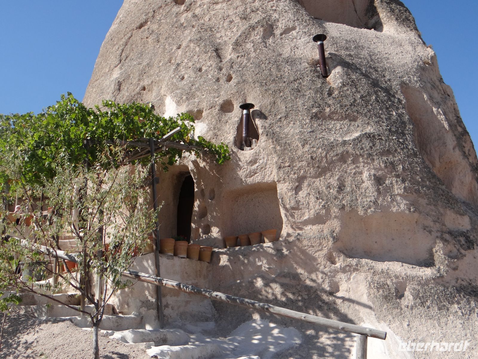 Um zum nächsten Tal zu gelangen, müssen wir erst hoch zur Straße und stehen vor einem malerischen „Zwergenhaus“ mit weinbewachsener Pergola. Unser „Oh“ lässt mich Hüseyin bitten, die Hausbewohnerin, die mit einem Tee nach draußen gekommen ist, zu fragen, ob wir wohl einen Blick in ihre Wohnung werfen könnten. Leider hat sie gleich einen Termin und es passt nicht. Doch Hüseyin kommt da eine Idee…