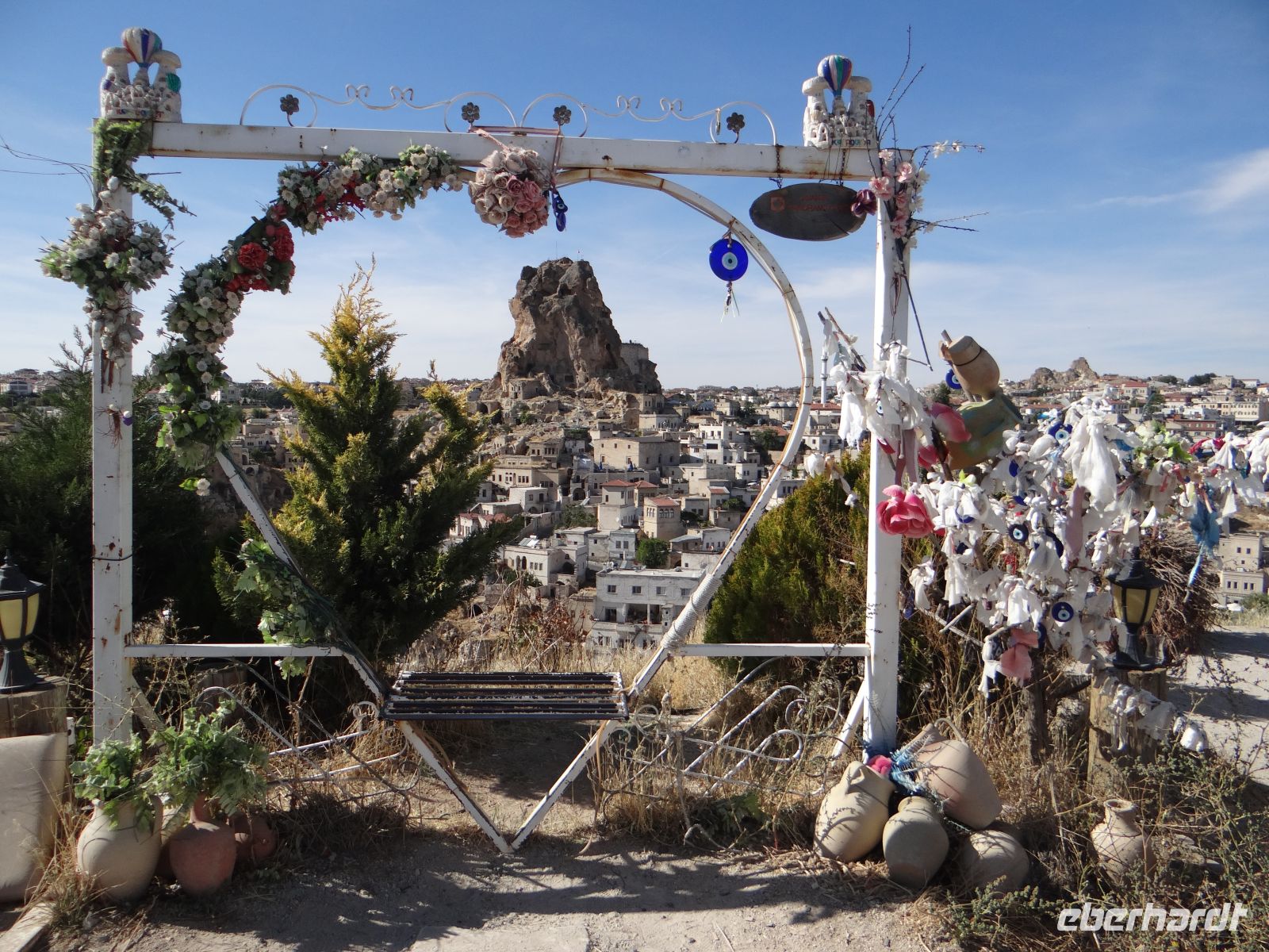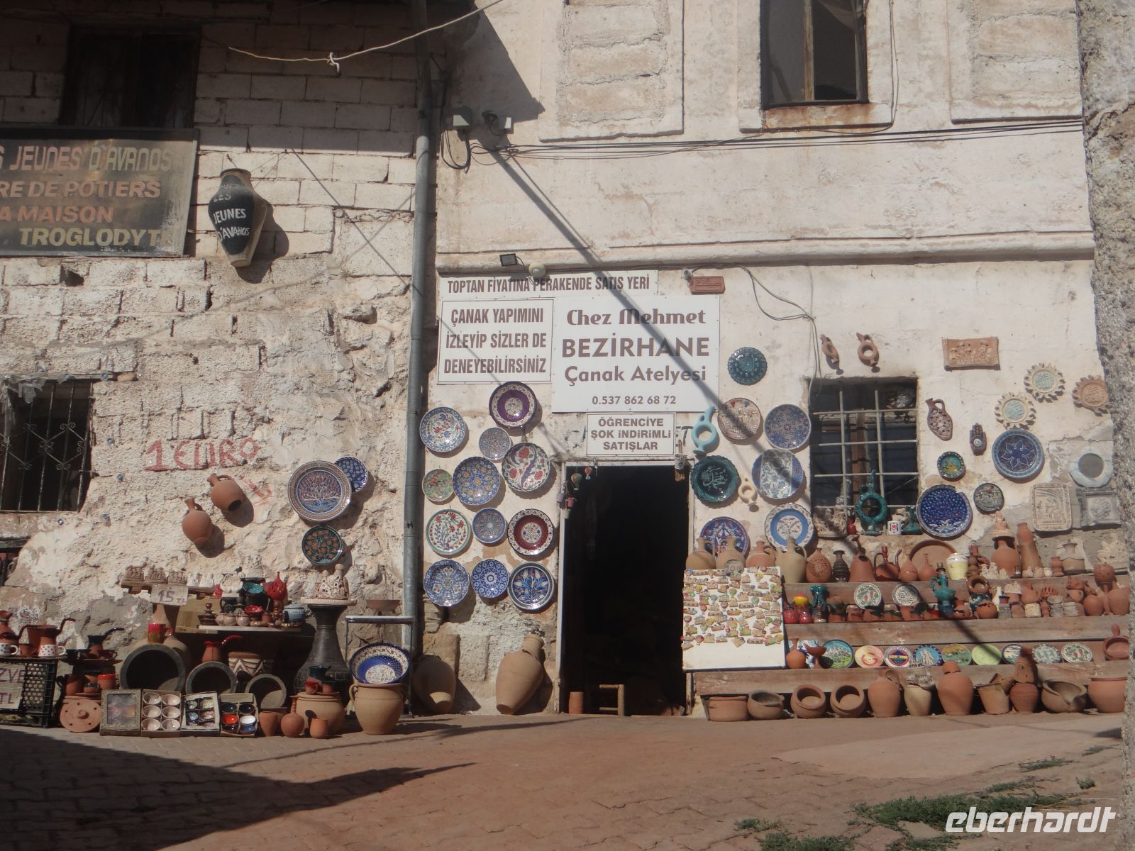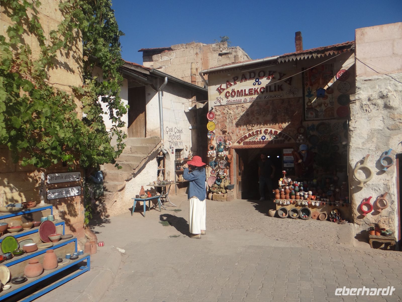 Dann fahren wir doch noch mal nach Mustafapasa. Die Besichtigung heute morgen ging zu schnell und wir haben noch Zeit und sind unternehmungslustig, und was Nettes kaufen möchten wir auch. Kaum angekommen und ausgestiegen, steuern wir den Kunstgewerbeladen direkt gegenüber an, der einen guten Eindruck macht. Und richtig, er ist gut sortiert, hat geschmackvolle Sachen und schnell sind ein paar Souvenirs mehr im Gepäck. Die junge Verkäuferin hat Sorge, dass ihr Vater unzufrieden ist, da wir mit ihr gehandelt haben. Ich tröste sie, dass sie so schnell sicher nicht immer verkauft.