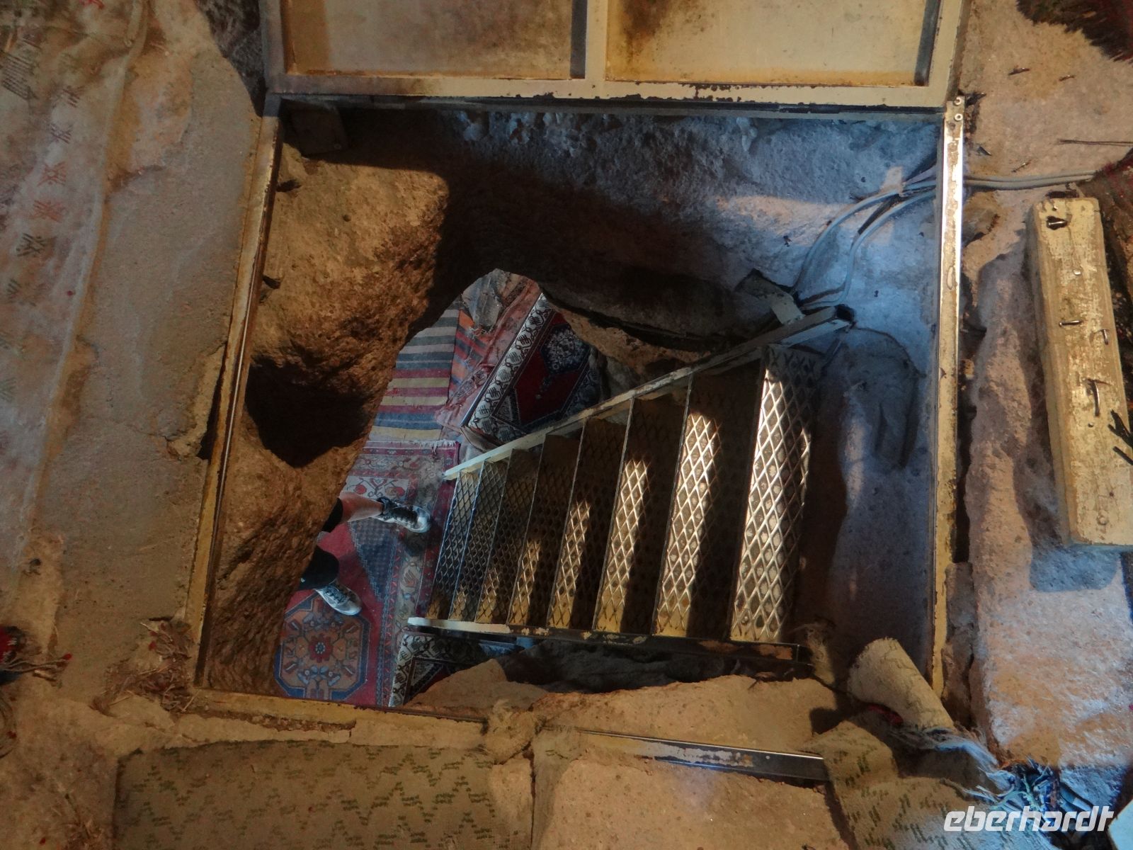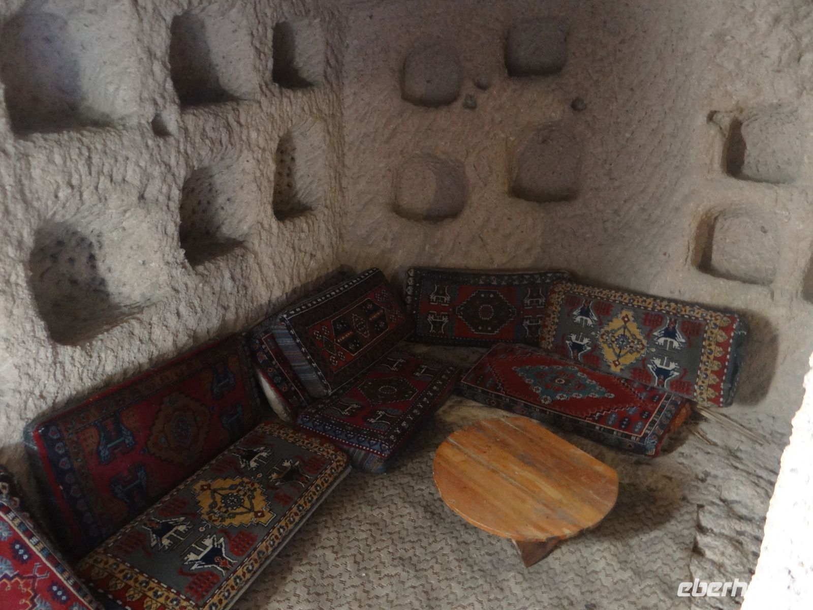 Wir fahren „nach Hause“ Richtung Hotel und halten unterhalb von Uçhisar an, um eine Felsenwohnung zu besichtigen. Unseren Wunsch macht Hüyesin wahr. Das Café „Cave Man“ ist in einem solchen Spitzkegel eingerichtet und der Besitzer ist so freundlich, uns zu einer Besichtigung einzuladen. Der Gang über die steile Holztreppe zur Tür ist noch einfach. Innen geht es dann über noch steile Eisenleitern ohne Geländer von einer Etage in die nächste. Unten gibt es einen Ofen und eine kleine Küche, in alle Wände sind Taubennester eingearbeitet, der Boden mit dünnen Teppichen ausgelegt, an den Wänden lehnen Polster. Achtung, Kopf, ob man sich nun auf der Etage bewegt und von einer zu anderen klettert. Wir bewegen uns mit Bedacht und auch ein wenig ehrfürchtig. Hier sollte man gut überlegen, ob man alles dabei hat, bevor man in die nächste Etage klettert.