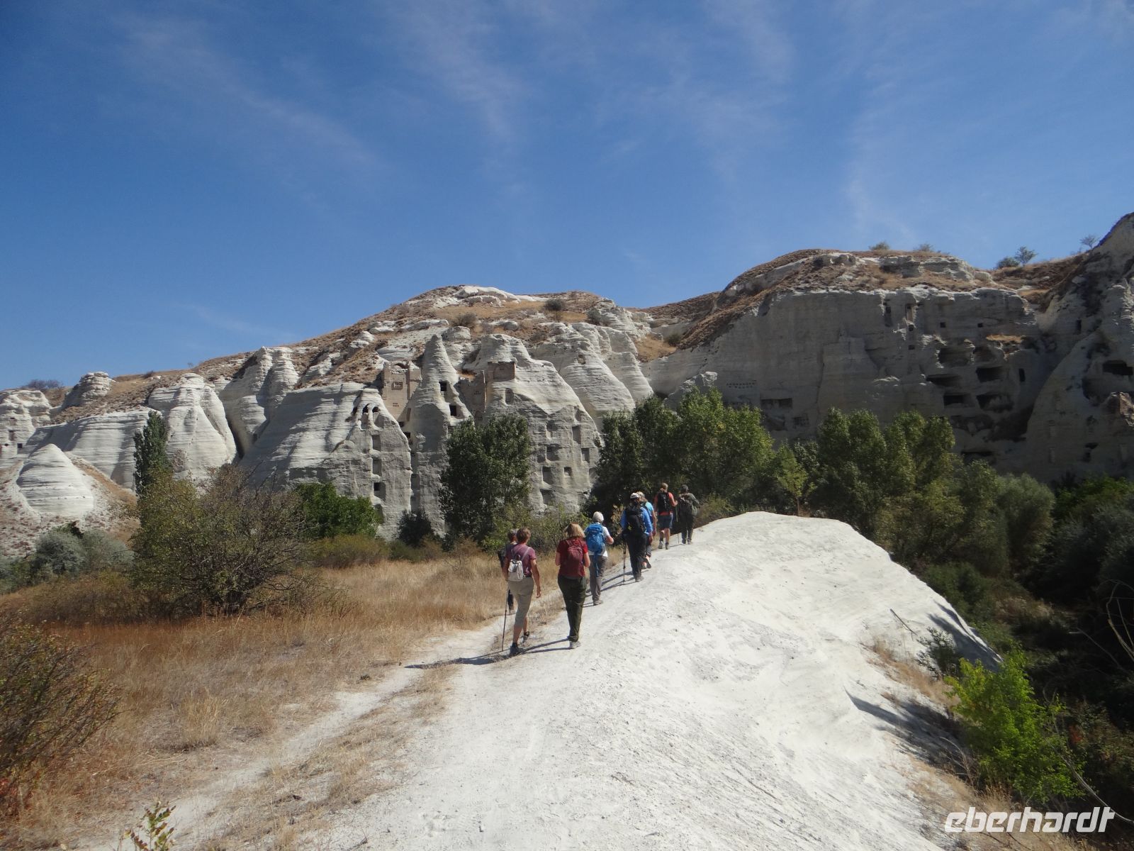 Wir machen eine Fotostopp mit Aussicht auf Ortahisar und einen Stopp mit Blick auf die „Drei Grazien“ - Üç Güzeller. Heike fällt auf, dass die weißen weichen Steinflächen aussehen, als wenn ein Tischtuch darüber läge - ein passendes Bild. Doch inmitten der Einheimischen, die auch hier halten, um zu gucken und Fotos zu machen, fühlen wir uns aus unserer ruhigen Welt der Wanderungen und der Einkehr rausgerissen und sind dankbar, dass wir diese Tage fernab der Touristenpfade erleben. Wir sehen alle Highlights, doch wir erwandern sie uns, was eine freudige Form der Genugtuung ist.