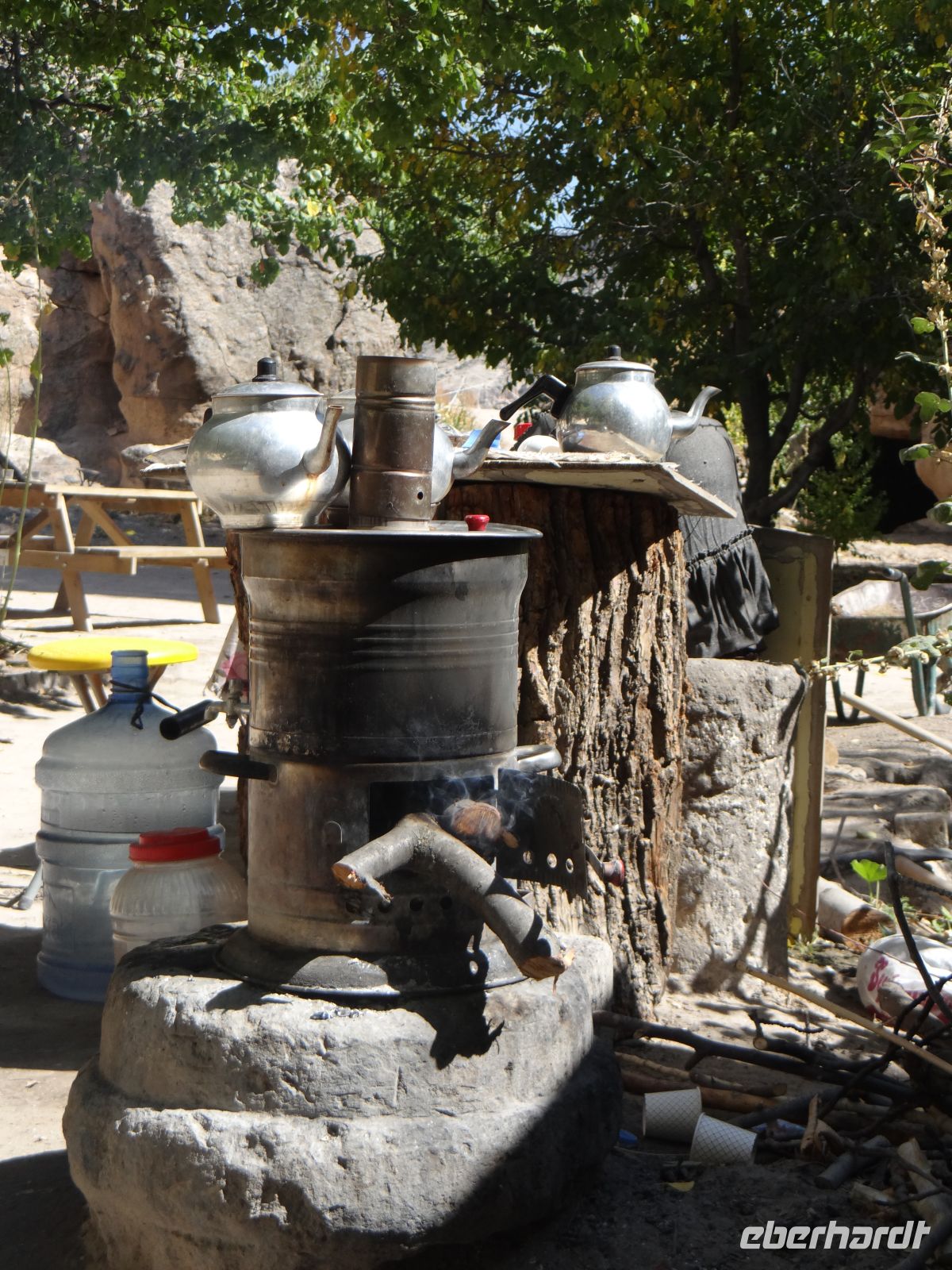 Wir erreichen einen bescheidenen Hof mit zwei bis drei Kühen und Kälbern, Hühnern. Jeder freie Platz ist mit Europaletten, Plastikeimern und allerlei anderem kreative Spielecke. Vier Generationen sind heute hier, um uns willkommen zu heißen. Arif und Gülsüm sind die Eltern, Meryem die Tochter mit Ehemann Kamil und die Schwiegertochter Mihriye. Die Omas sitzen auf Plastikstühlen unter einem Sonnenschirm und betrachten wohlwollend, wie der Traubensaft in großen Töpfen auf einem Holzfeuer eingekocht wird. Statt eines Webergrills reichen hier Holz, ein Bottich und ein Ofenrohr, fertig ist die Kochstelle.