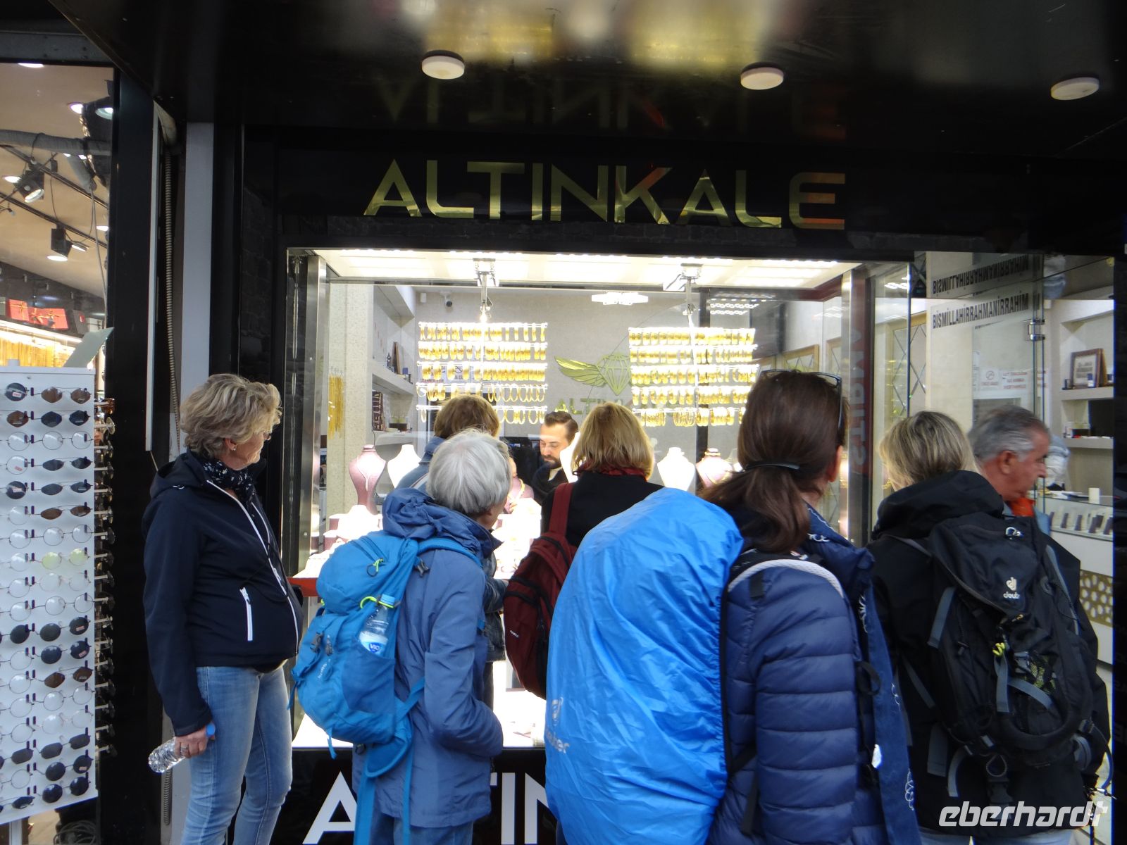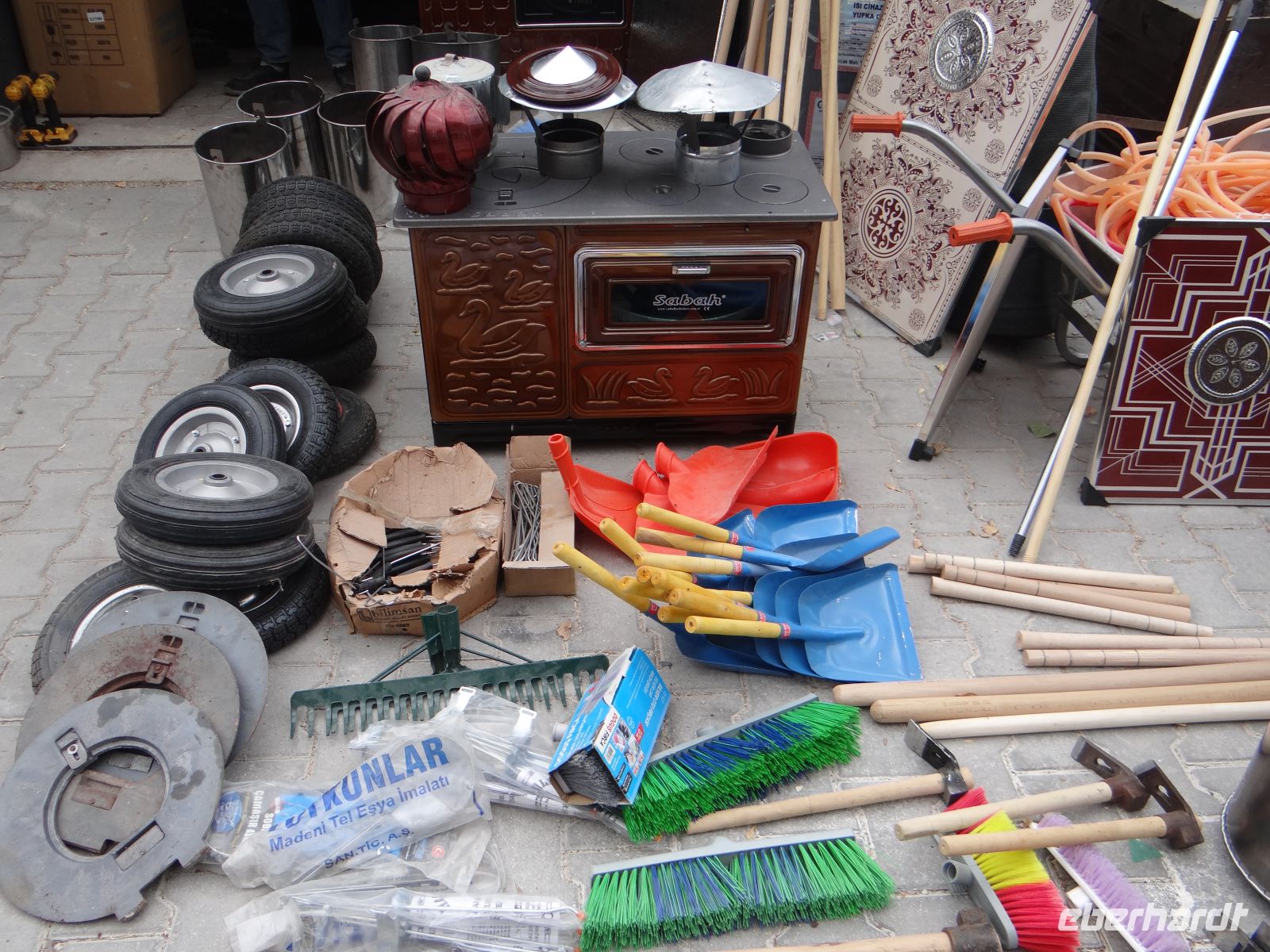 Wir laufen weiter zum Basar, ein Shopping-Center der besonderen Art. Das Gute für die Einkäufer ist, dass das Gesuchte konzentriert ist. Es gibt eine Ladenzeile für Haushaltswaren, eine für die Spezialität Pastırma, den luftgetrockneten Rinderschinken. Das spart Zeit. Die vielen Kopien von Louis-Vuitton-Portemonnaies oder Hermes-Gürtelschnallen lassen schmunzeln.