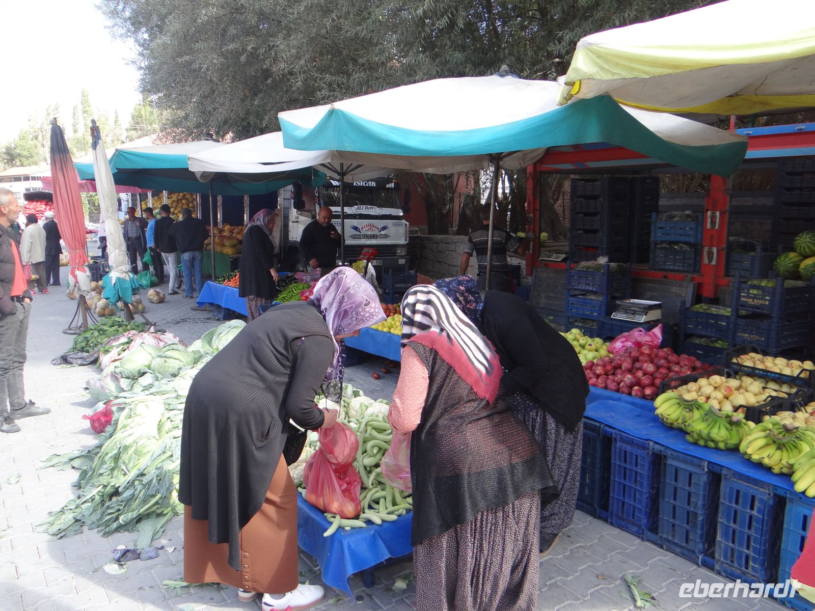 Zum Mittagessen ist ein Picknick bereitet in Aktepe. Dort bedient der Bürgermeister des Ortes. Es gibt Gurken, die in der Türkei fest und sehr schmackhaft sind, Tomaten und Käse sowie Gözleme und zum Nachtisch Wasser- und Honigmelone. Wir sitzen unter einem Sonnensegel im lauen Wind. So könnte der Tag nun zu Ende gehen.