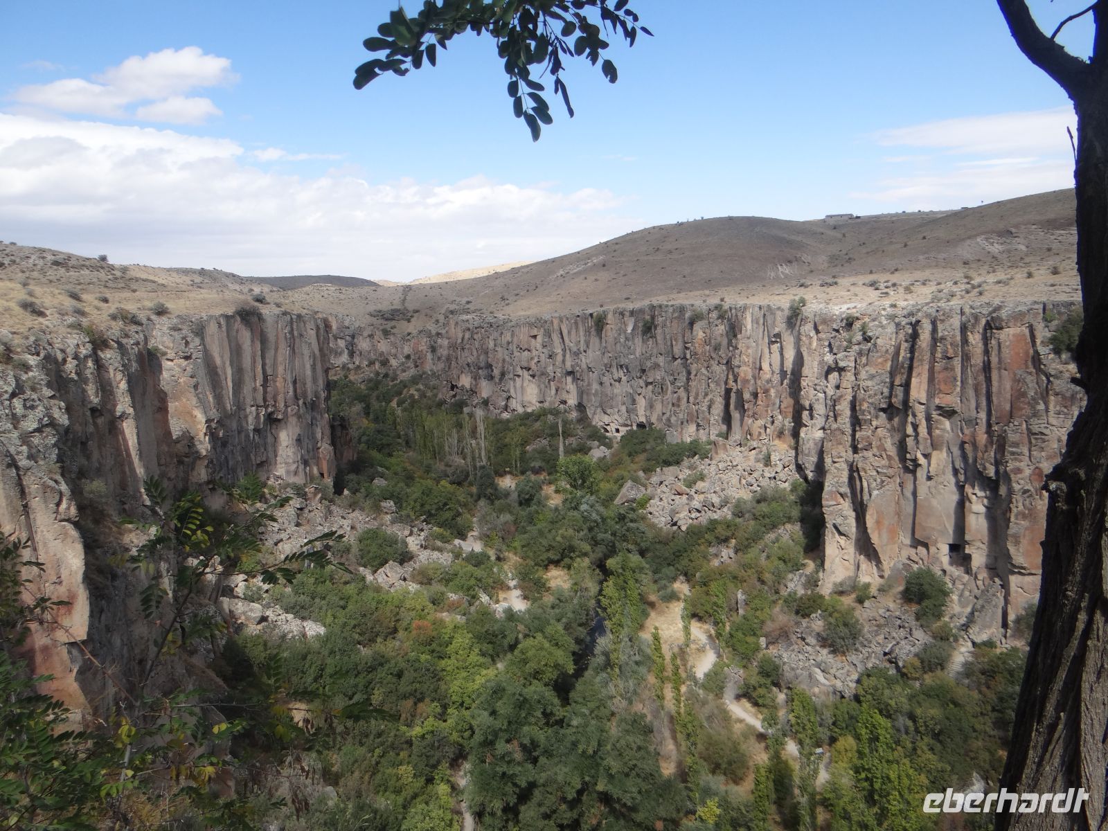 Dann fahren wir zum Ihlara-Tal. Eine schöne neue Toilettenanlage, großzügige Terrassen mit Blumenschmuck, der gerade gegossen wird, doch das Café, die Souvenirstände sind noch nicht freigegeben. Wie so oft in diesem Land, wird etwas groß hochgezogen und dann nicht geöffnet, bleibt ungenutzt stehen und verfällt. Der Blick ist großartig. Die Ihlara-Schlucht wird auch als „Grand Canyon der Türkei" bezeichnet und ist bis zu 80 Meter. Links und rechts ziehen sich steil die Felswände nach oben mit einem markanten Band aus rötlichen großen Blöcken als Abschluss. Und dort laufen wir nun also durch!