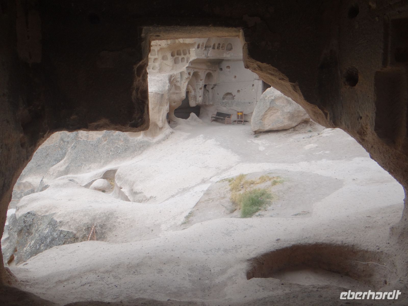 Wir kommen in den Ort Selime und hier sind wir auch am Ziel. Ein Felsen, durchlöchert wie ein Schweizer Käse, birgt eine Kathedrale und ein Kloster. Wir haben zwar schon viele Kirchen und Räume in Felsen gesehen, doch sind wir auch hier neugierig. Hüseyin zahlt den Eintritt und wir laufen die Treppen und Bohlenwege nach oben, zu den Aussichtspunkten, den Kirchen und Kapellen, der Kathedrale, die sich durch ihre Höhe von dem bisher Gesehenen unterscheidet. Und es gibt ein Kloster, einen quadratischen Raum mit einer auf drei Seiten umlaufenden Arkadengang, wie ein Kreuzgang. Das haben wir noch nicht gesehen, das ist neu.