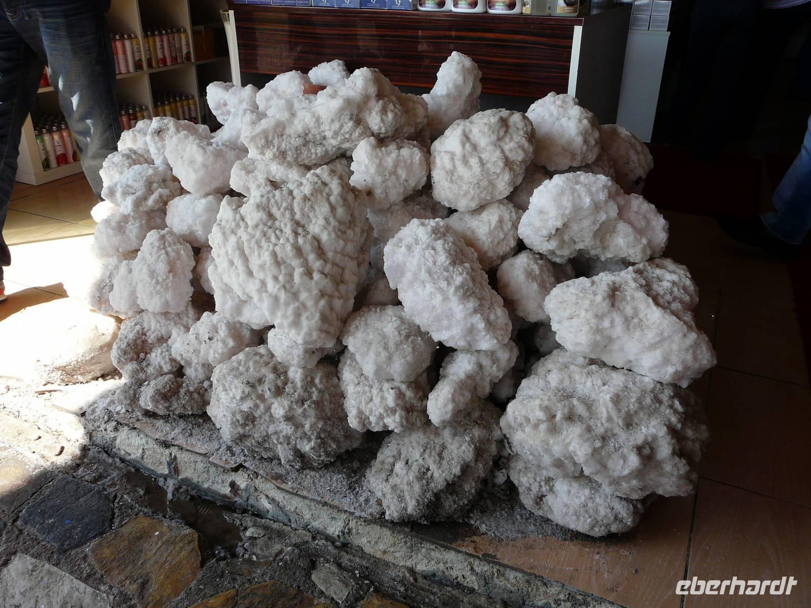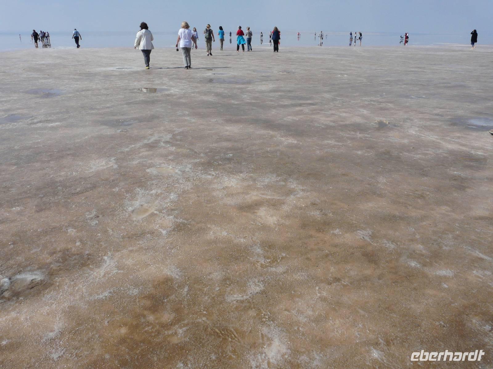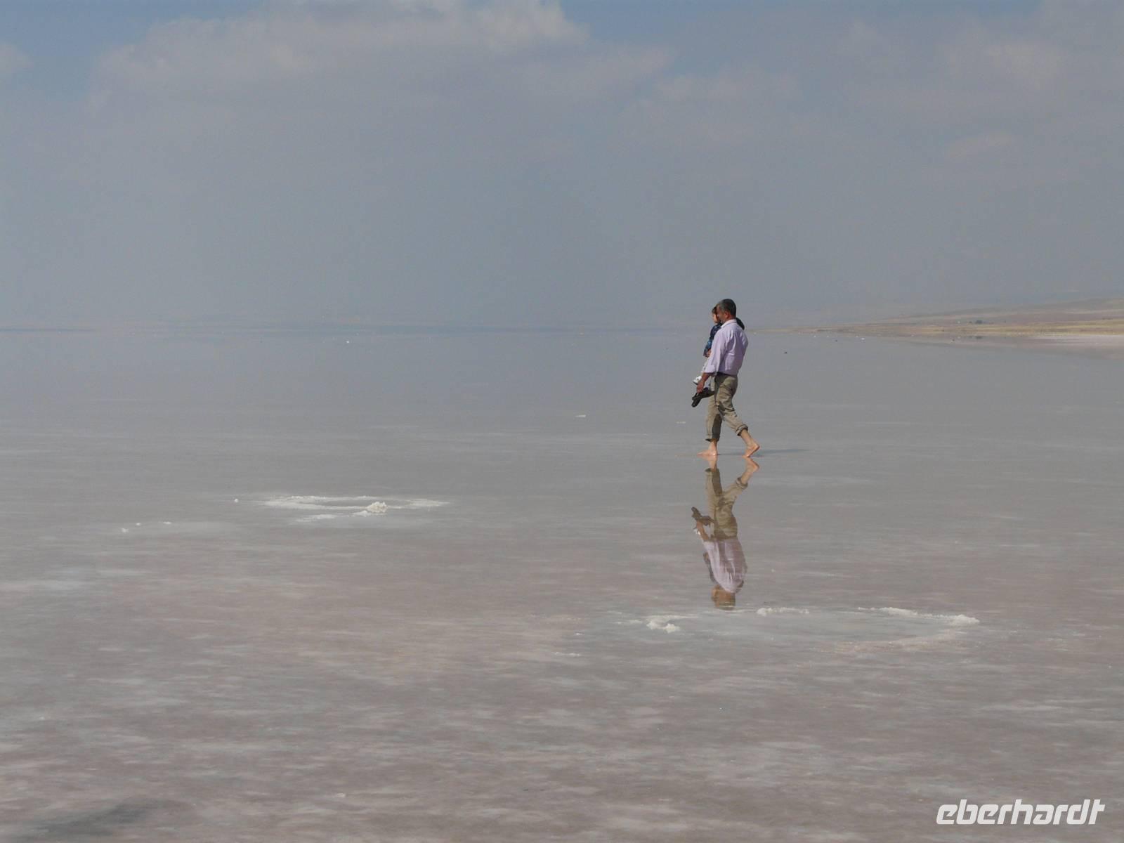 Zu Beginn des zweiten Tages fahren wir zuerst einmal hoch hinaus. Mit dem Bus geht es hinauf zur alten Festung von wo aus wir einen weiten Blick über die ganze Stadt haben. Erst hier wird einem wirklich bewusst, wie groß Ankara doch ist. Gleichzeitig wirkt das Nebeneinander frisch sanierter und kurz vor dem Zerfall stehender Häuser doch ziemlich befremdlich. An einem der vielen Stände unterhalb der Festung decken wir uns dann noch mit Nüssen und getrockneten Früchten ein, schließlich liegt die lange Fahrt bis nach Kappadokien vor uns. Wir brauchen noch eine ganze Weile, ehe wir Ankara verlassen. Doch dann zeigt sich das wahre Gesicht der Türkei - wir fahren vorbei an endlosen Weiten, riesigen Feldern und nur selten durchqueren wir eine größere Stadt. Reiseleiter Hassan erzählt und erklärt uns währenddessen viel über Land und Leute. Zur Mittagszeit erreichen wir den Salzsee. Vorbei an den vielen Verkaufsständen laufen wir auf der harten Salzschicht Richtung Wasser. Ein paar von uns tapsen sogar barfuss durch das salzige Nass, doch um überhaupt knöcheltiefes Wasser erreichen zu können, hätten wir wohl noch eine ganze Weile laufen müssen. Nachdem wir den Salzgehalt von ca. 33% ordnungsgemäß geprüft haben geht es zurück zum Parkplatz, natürlich mit einem kurzen Stopp, um ganz fix kosmetische Geheimtipps zu erstehen ;-).