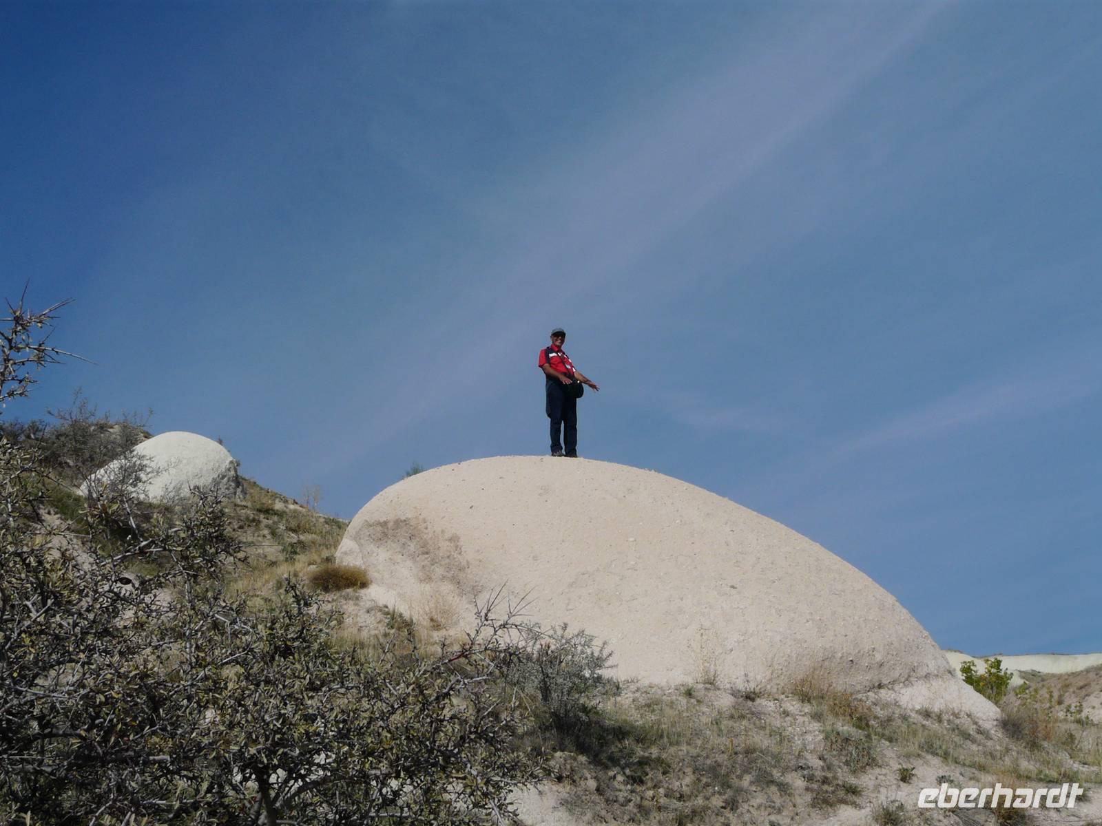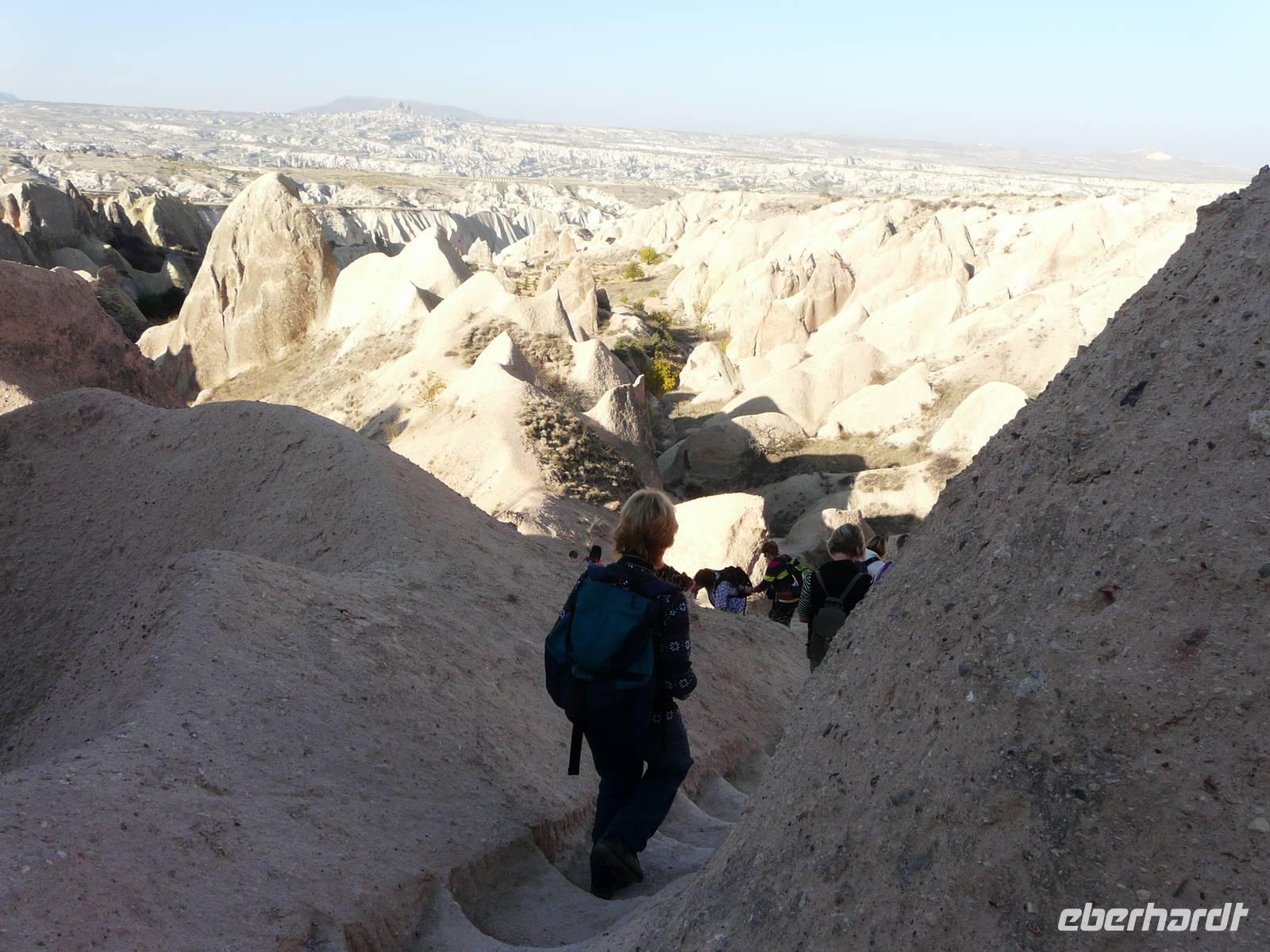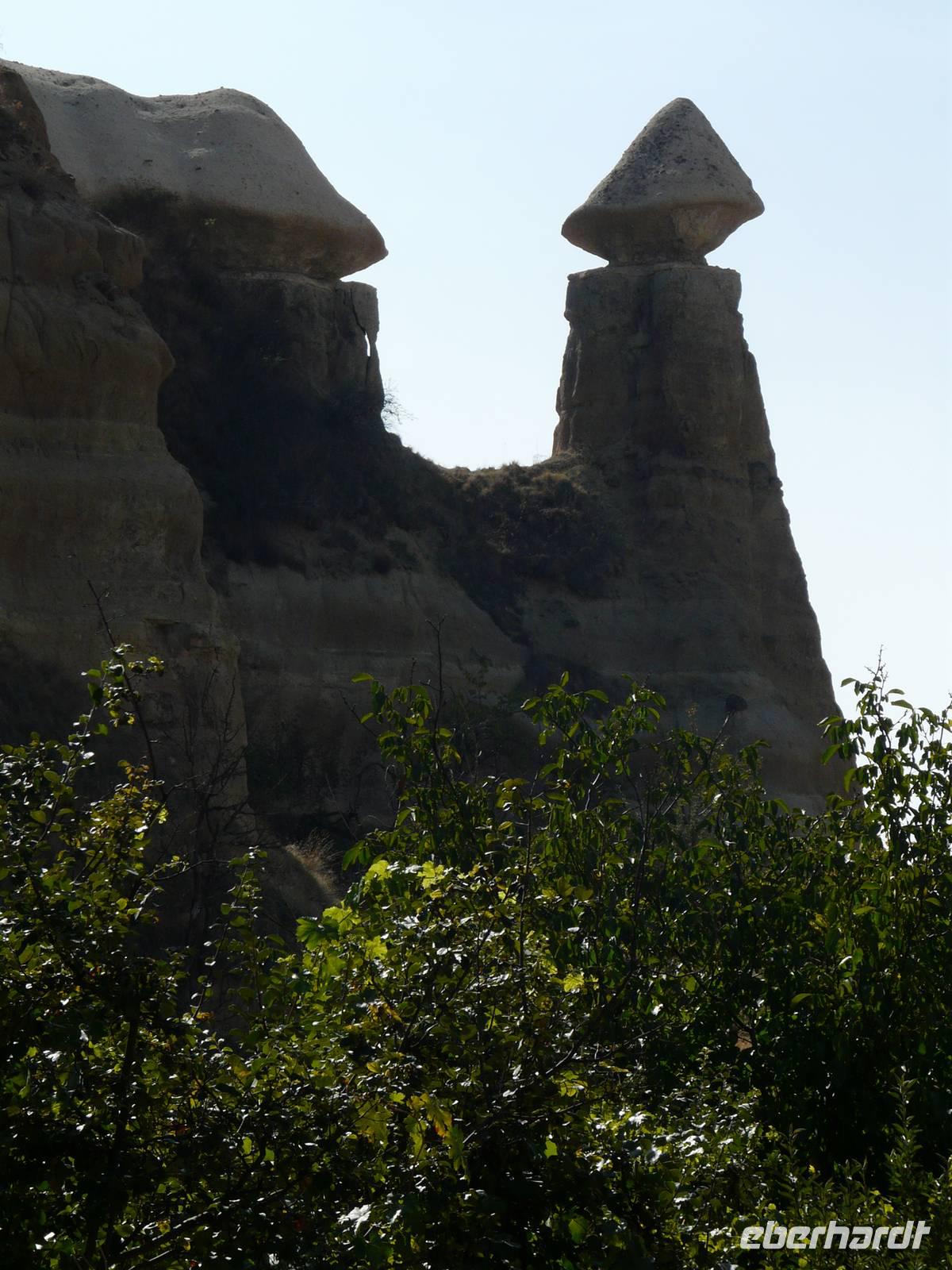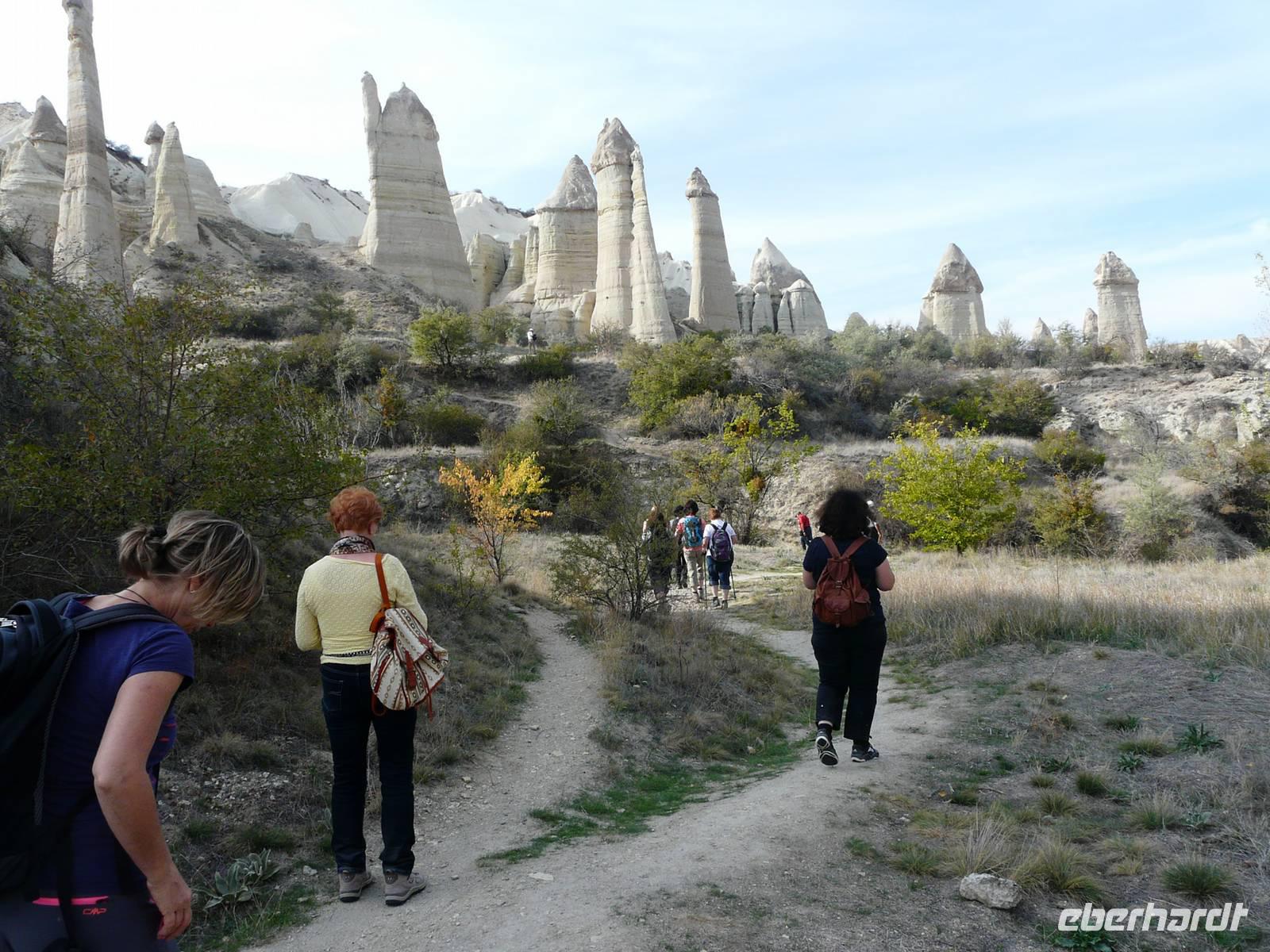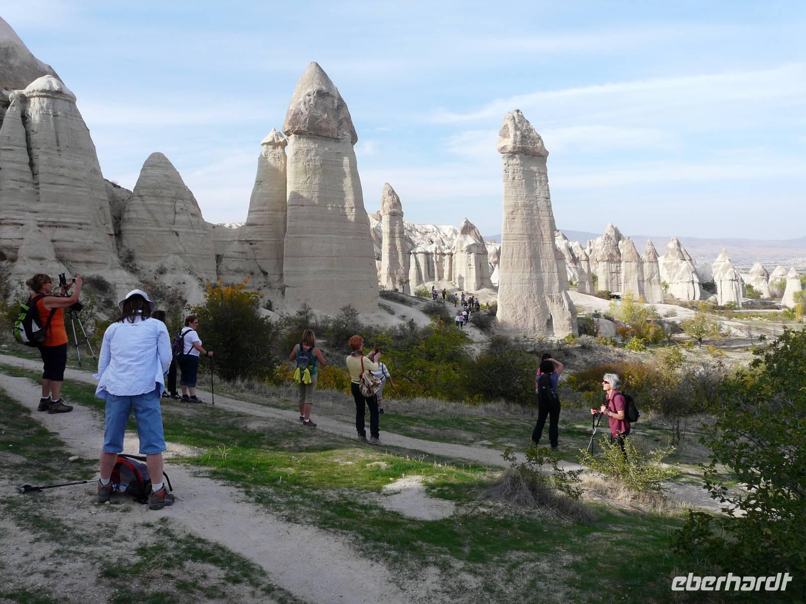 Der Nachmittag hält die nächste Wanderung für uns bereit - das Liebestal oder auch Bagli Dere Tal. Erneut steigen wir anfangs abenteuerlich bergab und wahrscheinlich freut sich jeder, ordentliches Profil unter den Schuhen zu haben. Wir lassen uns anfangs etwas mehr Zeit, lassen die Natur auf uns wirken und vor allem zwei andere Gruppen vorlaufen - so haben wir unsere Ruhe. Ismael geht vor, während Hasan um unser leibliches Wohl besorgt zu sein scheint, holt er doch aus allen Ecken frische Weintrauben zum Kosten. Warum das Tal nun seinen Namen trägt erfahren wir wenig später. Wir sehen nicht mehr nur die typischen Feenkamine, sondern auch Felsen, die aussehen wir riesige Phallusse. Dass der Fotostopp hier etwas länger dauert, erklärt sich von selbst. Der Weg schlängelt sich nun so langsam wieder aus dem Tal heraus, der Boden wird immer sandiger. An der Straße sehen wir dann auch schon „unseren" Bus mit Fahrer Ogus, der auch in den nächsten Tagen zuverlässig und immer zur Stelle sein wird. Nach einem langen und beeindruckenden Tag fahren wir dann auch so langsam wieder ins Hotel.