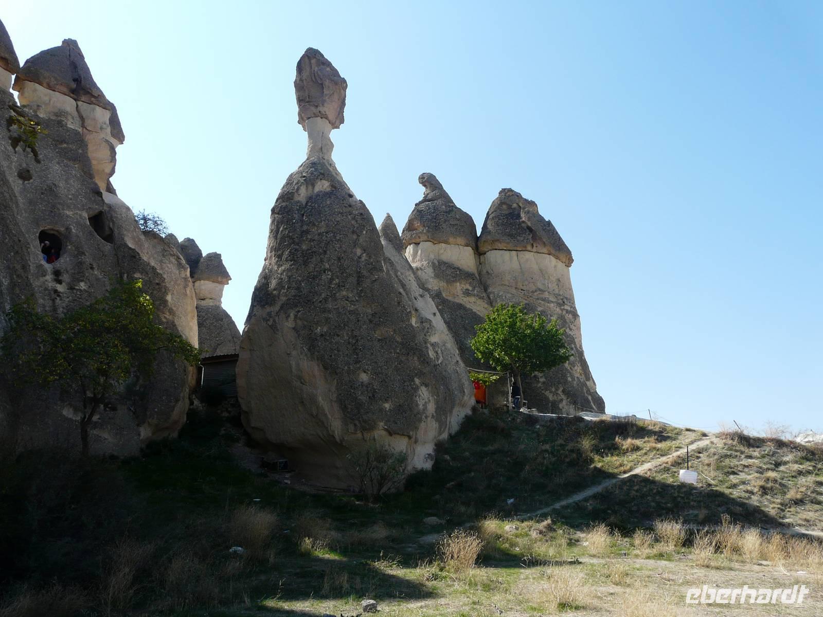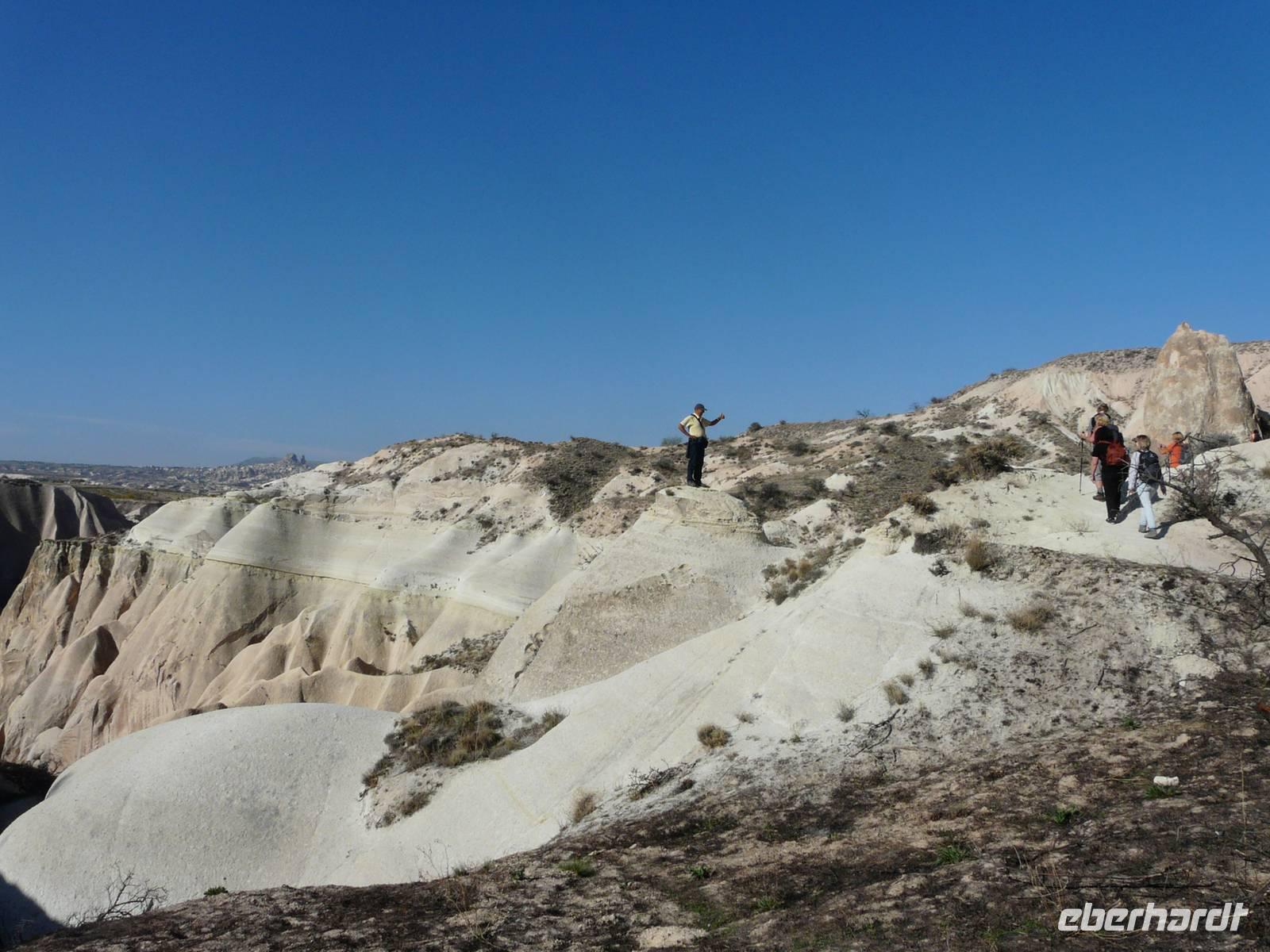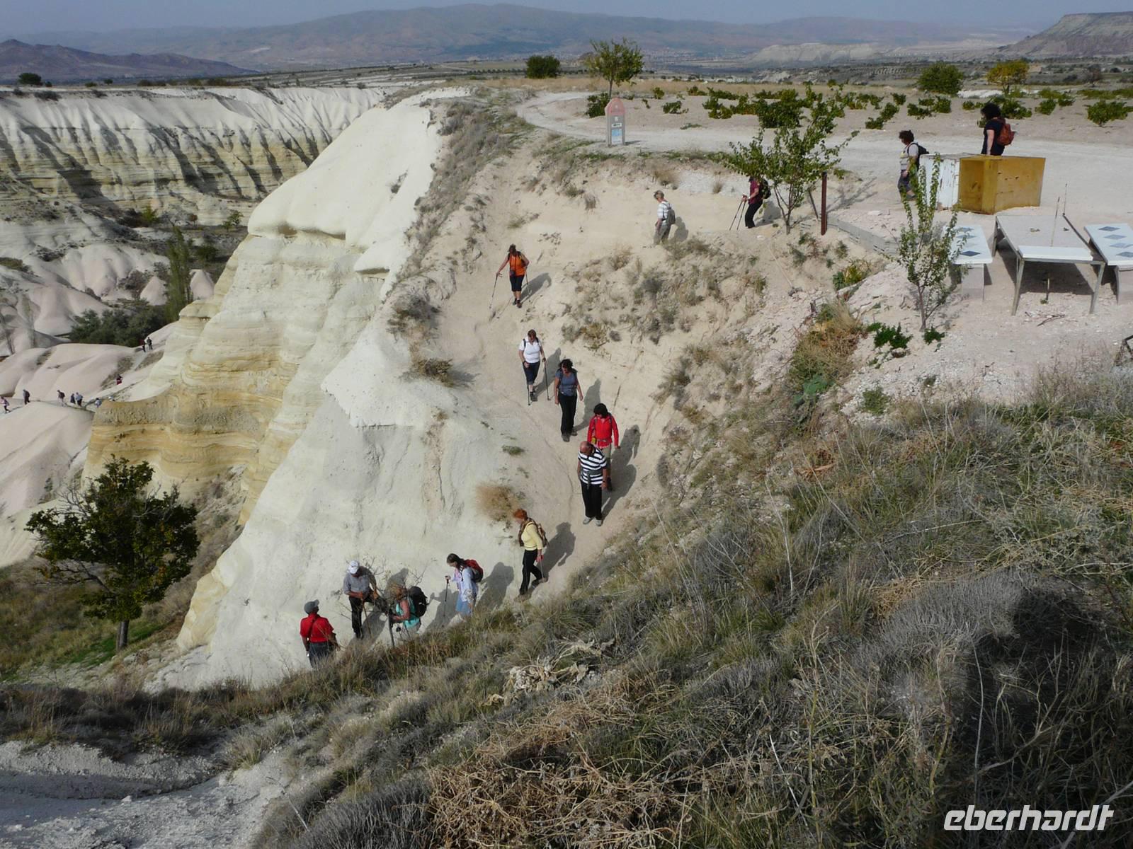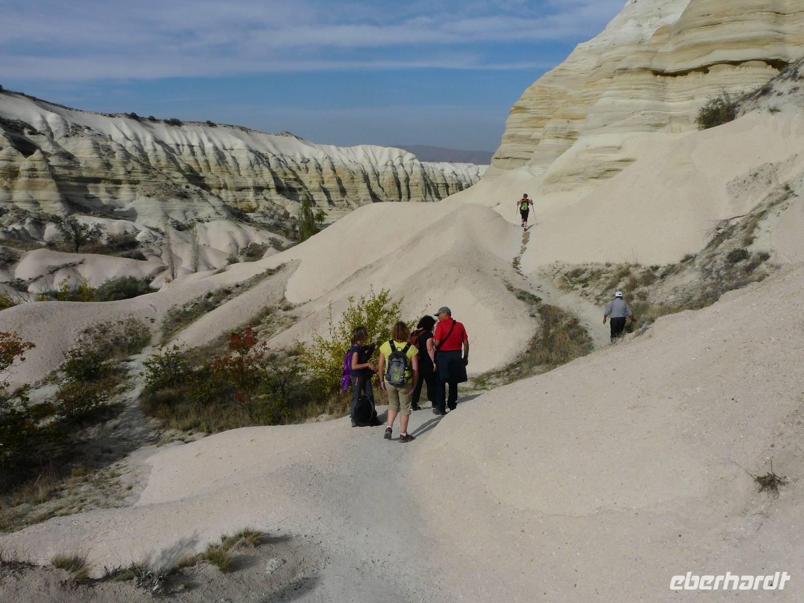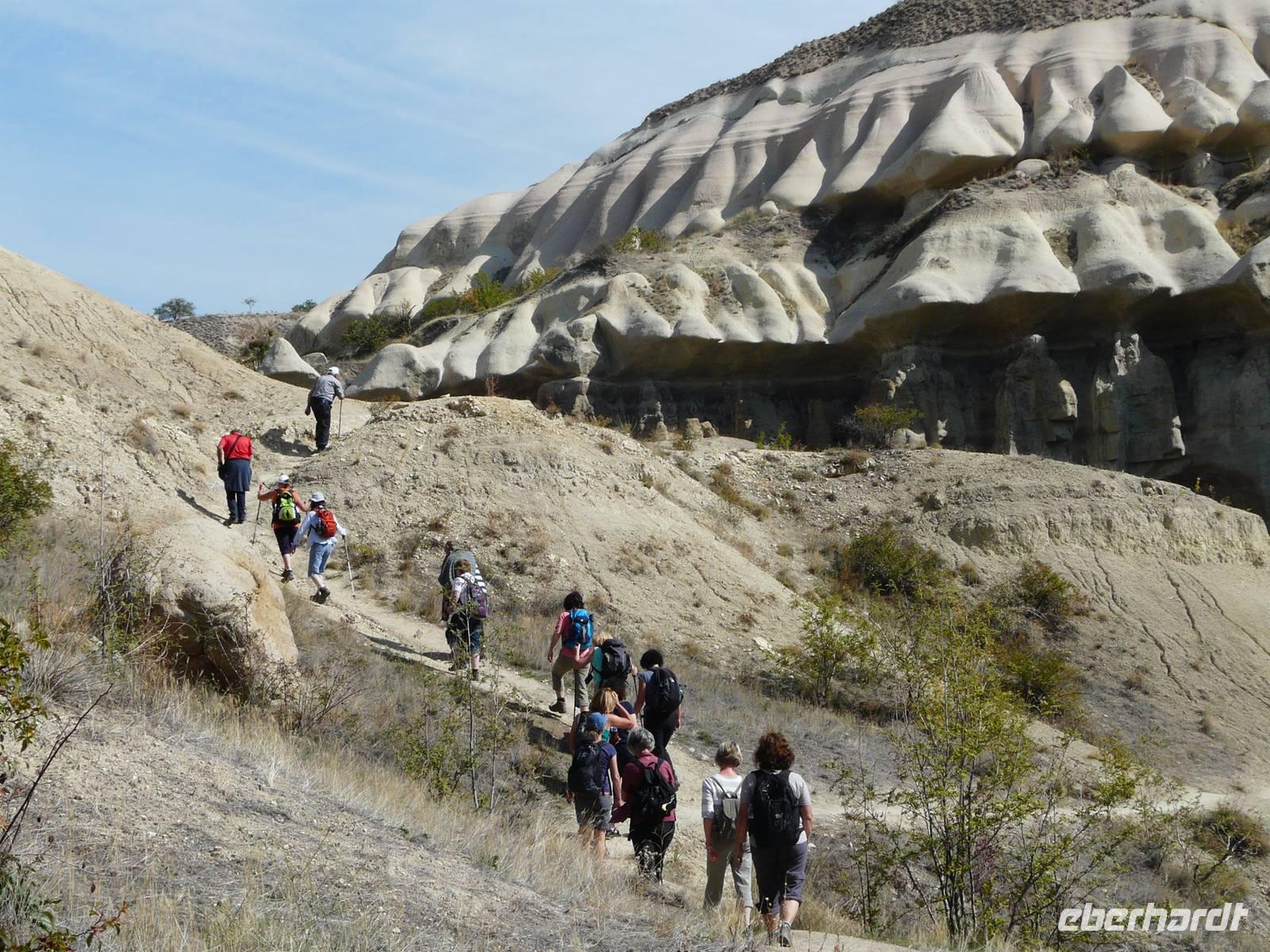 Der Nachmittag hält die nächste Wanderung für uns bereit - das Liebestal oder auch Bagli Dere Tal. Erneut steigen wir anfangs abenteuerlich bergab und wahrscheinlich freut sich jeder, ordentliches Profil unter den Schuhen zu haben. Wir lassen uns anfangs etwas mehr Zeit, lassen die Natur auf uns wirken und vor allem zwei andere Gruppen vorlaufen - so haben wir unsere Ruhe. Ismael geht vor, während Hasan um unser leibliches Wohl besorgt zu sein scheint, holt er doch aus allen Ecken frische Weintrauben zum Kosten. Warum das Tal nun seinen Namen trägt erfahren wir wenig später. Wir sehen nicht mehr nur die typischen Feenkamine, sondern auch Felsen, die aussehen wir riesige Phallusse. Dass der Fotostopp hier etwas länger dauert, erklärt sich von selbst. Der Weg schlängelt sich nun so langsam wieder aus dem Tal heraus, der Boden wird immer sandiger. An der Straße sehen wir dann auch schon „unseren" Bus mit Fahrer Ogus, der auch in den nächsten Tagen zuverlässig und immer zur Stelle sein wird. Nach einem langen und beeindruckenden Tag fahren wir dann auch so langsam wieder ins Hotel.