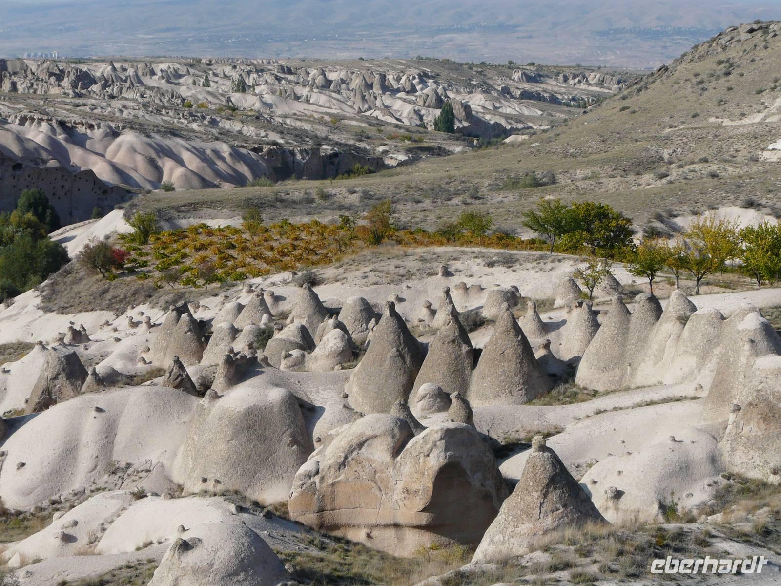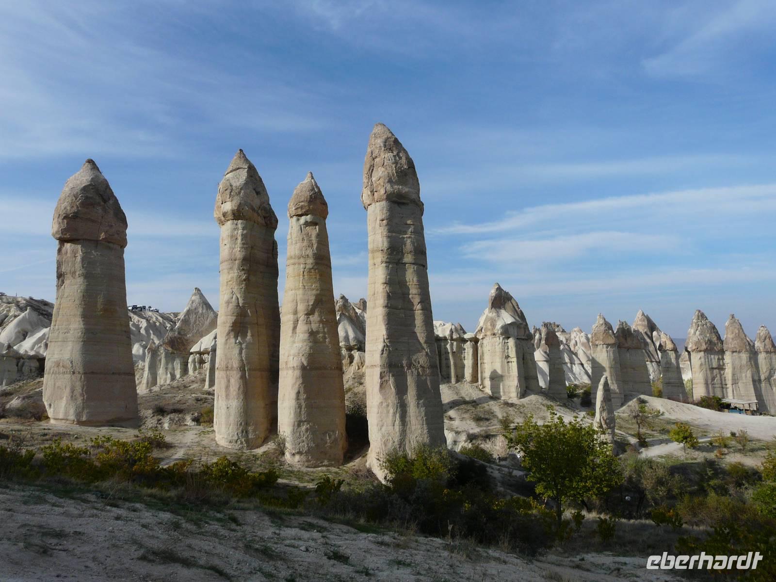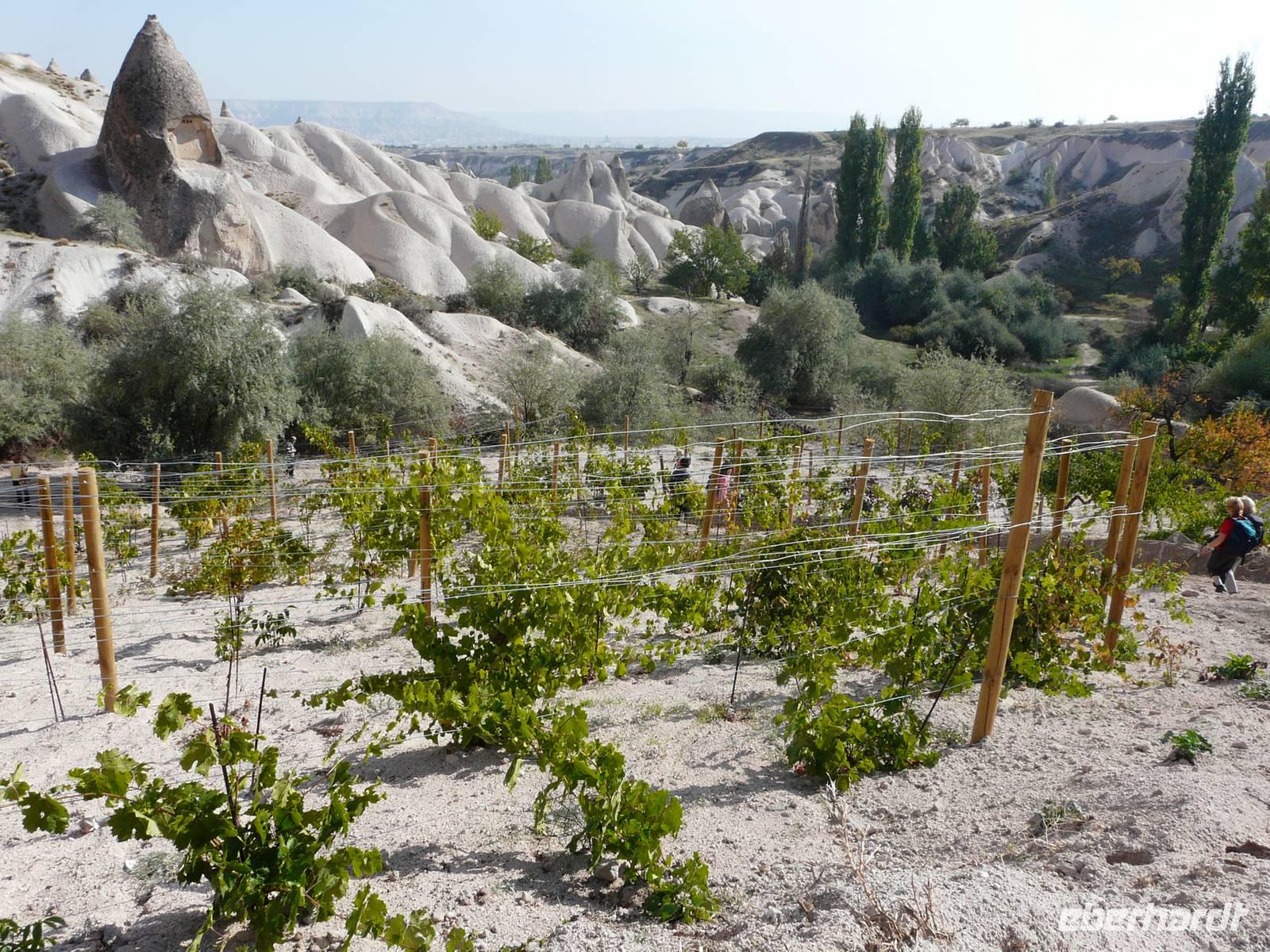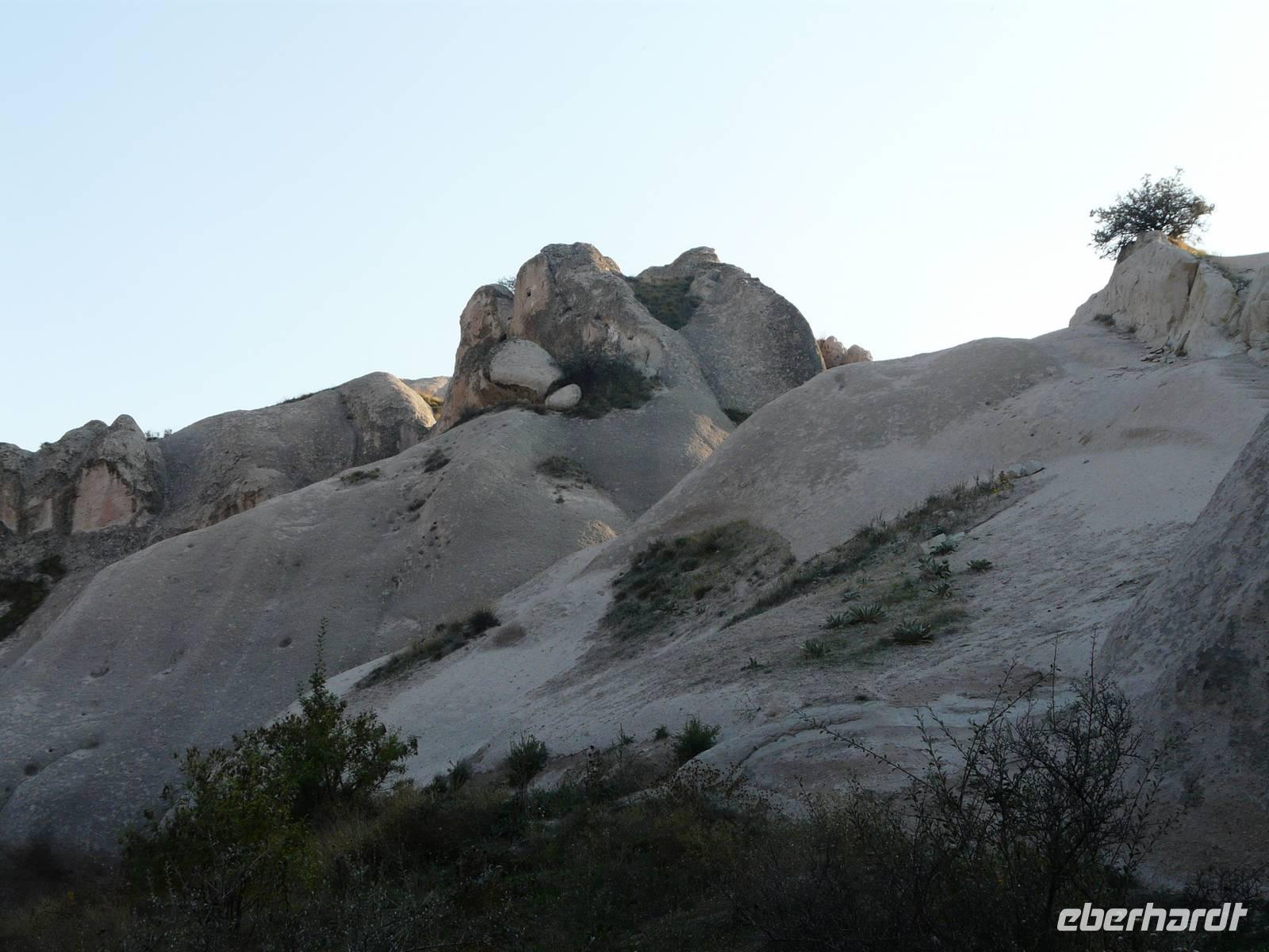 Der Nachmittag hält die nächste Wanderung für uns bereit - das Liebestal oder auch Bagli Dere Tal. Erneut steigen wir anfangs abenteuerlich bergab und wahrscheinlich freut sich jeder, ordentliches Profil unter den Schuhen zu haben. Wir lassen uns anfangs etwas mehr Zeit, lassen die Natur auf uns wirken und vor allem zwei andere Gruppen vorlaufen - so haben wir unsere Ruhe. Ismael geht vor, während Hasan um unser leibliches Wohl besorgt zu sein scheint, holt er doch aus allen Ecken frische Weintrauben zum Kosten. Warum das Tal nun seinen Namen trägt erfahren wir wenig später. Wir sehen nicht mehr nur die typischen Feenkamine, sondern auch Felsen, die aussehen wir riesige Phallusse. Dass der Fotostopp hier etwas länger dauert, erklärt sich von selbst. Der Weg schlängelt sich nun so langsam wieder aus dem Tal heraus, der Boden wird immer sandiger. An der Straße sehen wir dann auch schon „unseren" Bus mit Fahrer Ogus, der auch in den nächsten Tagen zuverlässig und immer zur Stelle sein wird. Nach einem langen und beeindruckenden Tag fahren wir dann auch so langsam wieder ins Hotel.