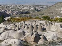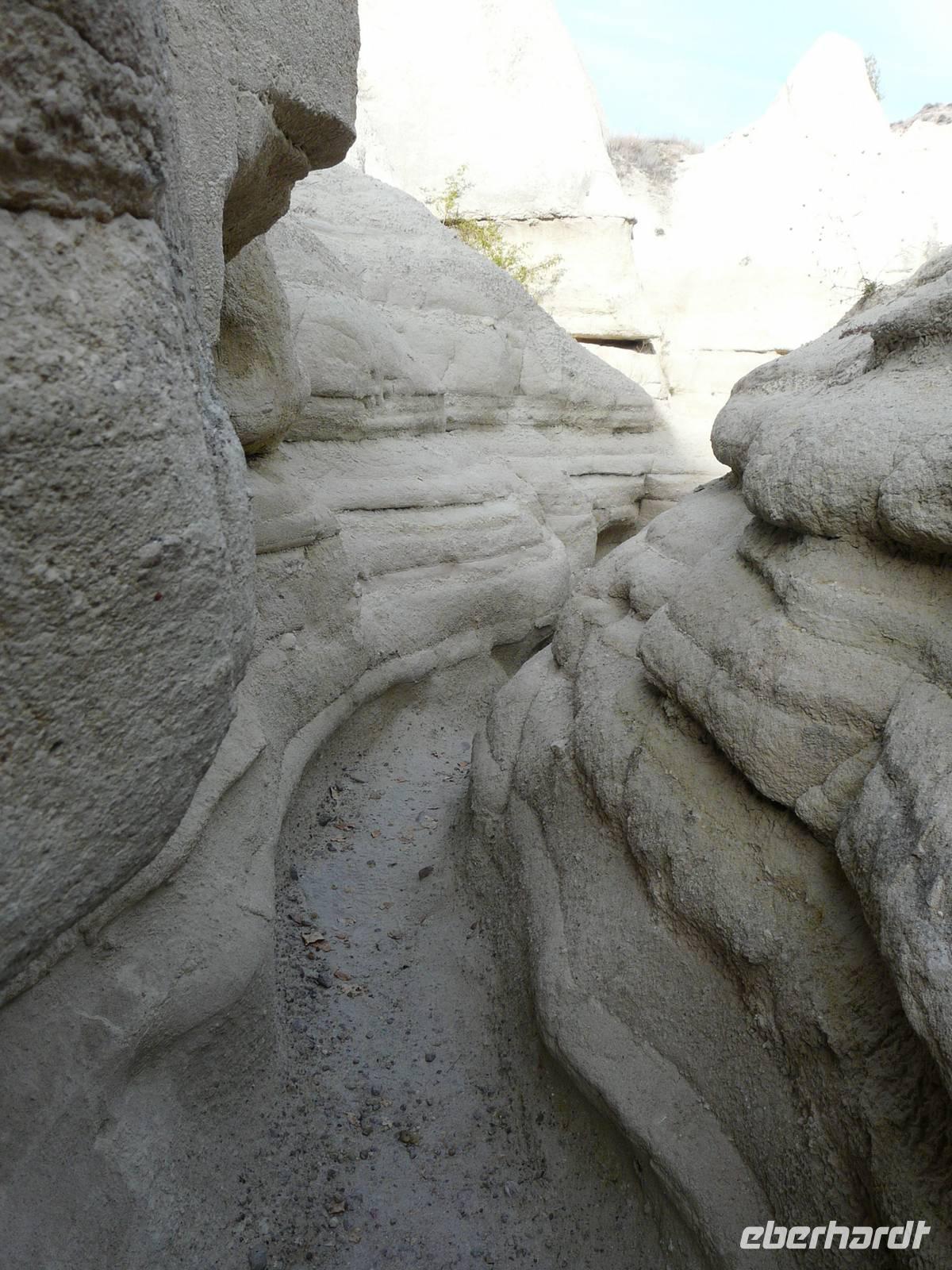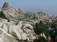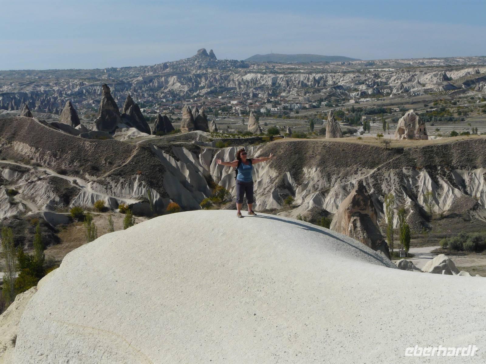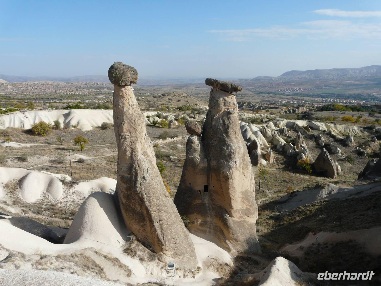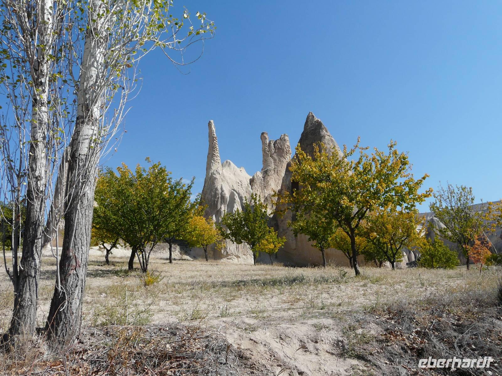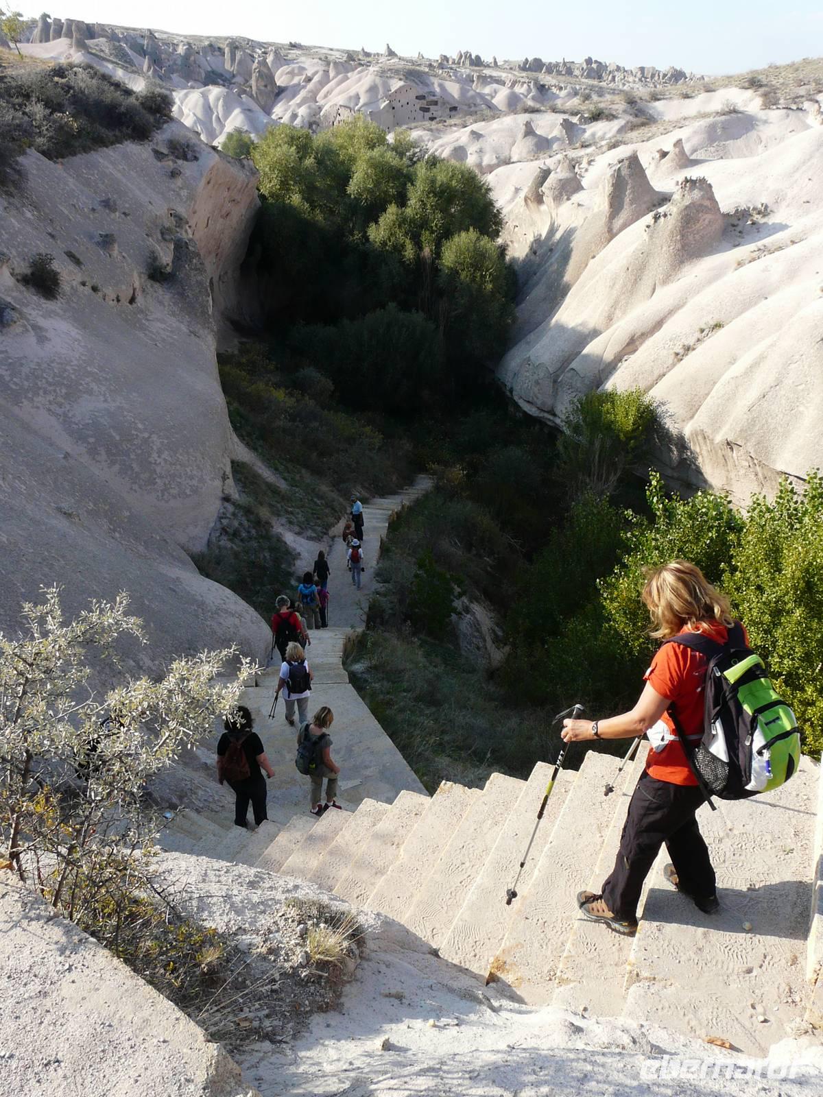 Der Nachmittag hält die nächste Wanderung für uns bereit - das Liebestal oder auch Bagli Dere Tal. Erneut steigen wir anfangs abenteuerlich bergab und wahrscheinlich freut sich jeder, ordentliches Profil unter den Schuhen zu haben. Wir lassen uns anfangs etwas mehr Zeit, lassen die Natur auf uns wirken und vor allem zwei andere Gruppen vorlaufen - so haben wir unsere Ruhe. Ismael geht vor, während Hasan um unser leibliches Wohl besorgt zu sein scheint, holt er doch aus allen Ecken frische Weintrauben zum Kosten. Warum das Tal nun seinen Namen trägt erfahren wir wenig später. Wir sehen nicht mehr nur die typischen Feenkamine, sondern auch Felsen, die aussehen wir riesige Phallusse. Dass der Fotostopp hier etwas länger dauert, erklärt sich von selbst. Der Weg schlängelt sich nun so langsam wieder aus dem Tal heraus, der Boden wird immer sandiger. An der Straße sehen wir dann auch schon „unseren" Bus mit Fahrer Ogus, der auch in den nächsten Tagen zuverlässig und immer zur Stelle sein wird. Nach einem langen und beeindruckenden Tag fahren wir dann auch so langsam wieder ins Hotel.