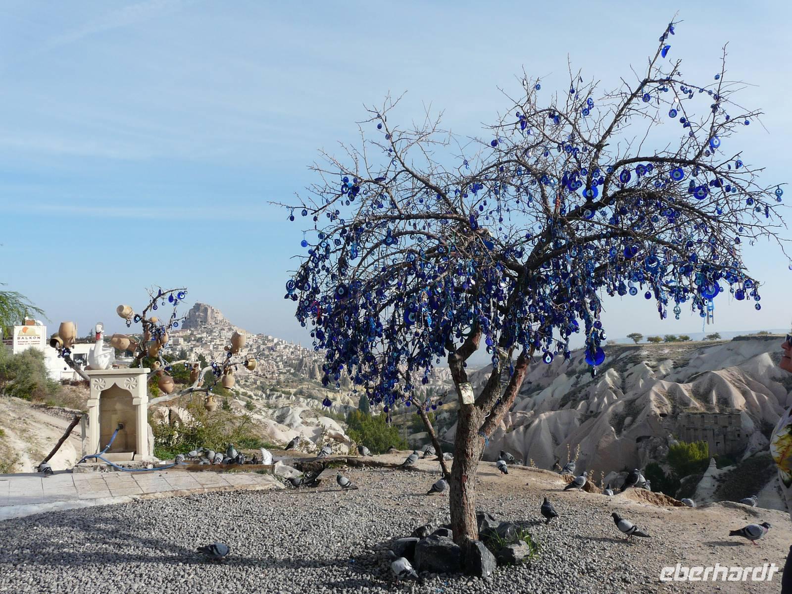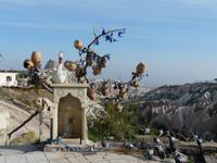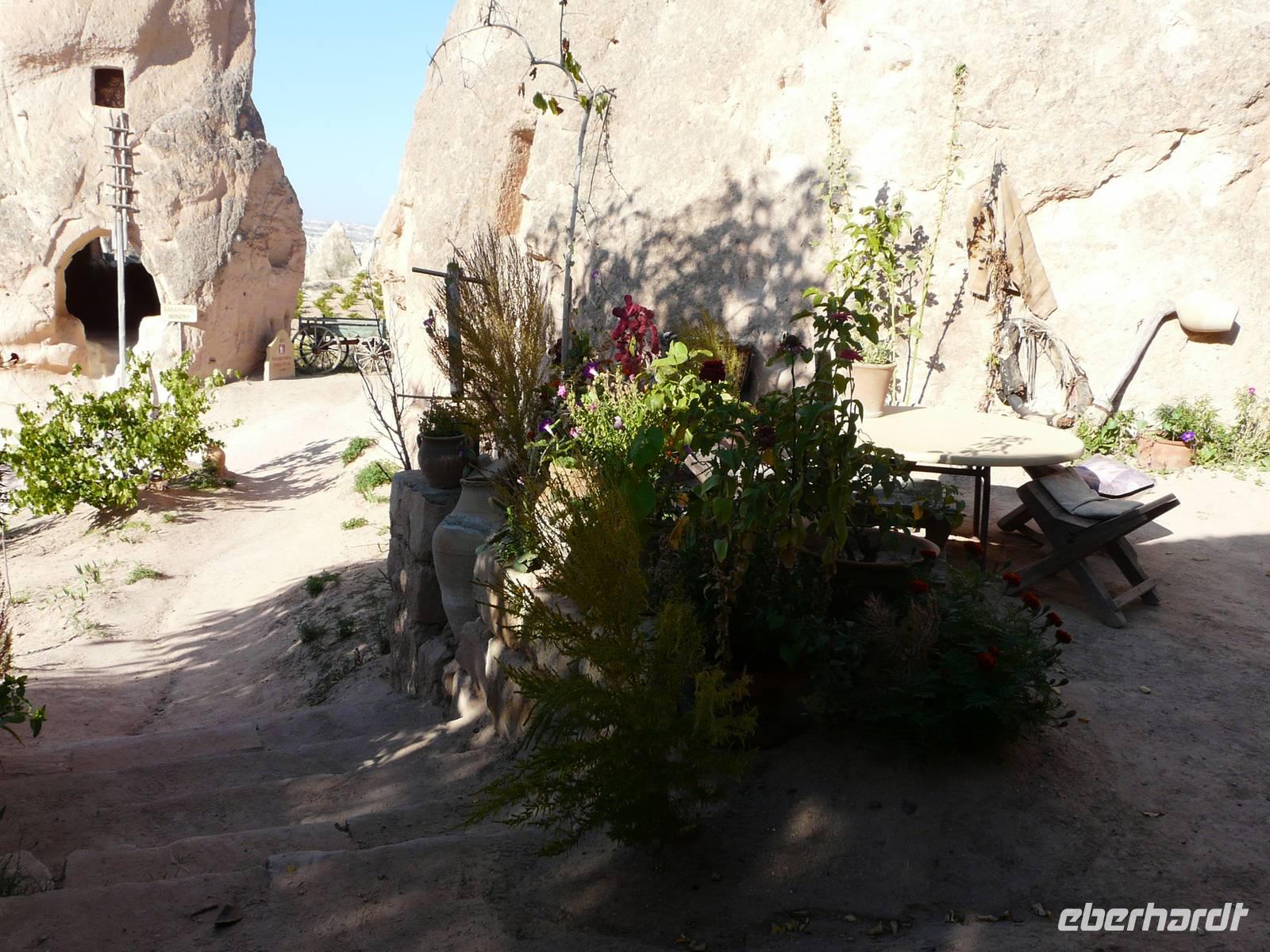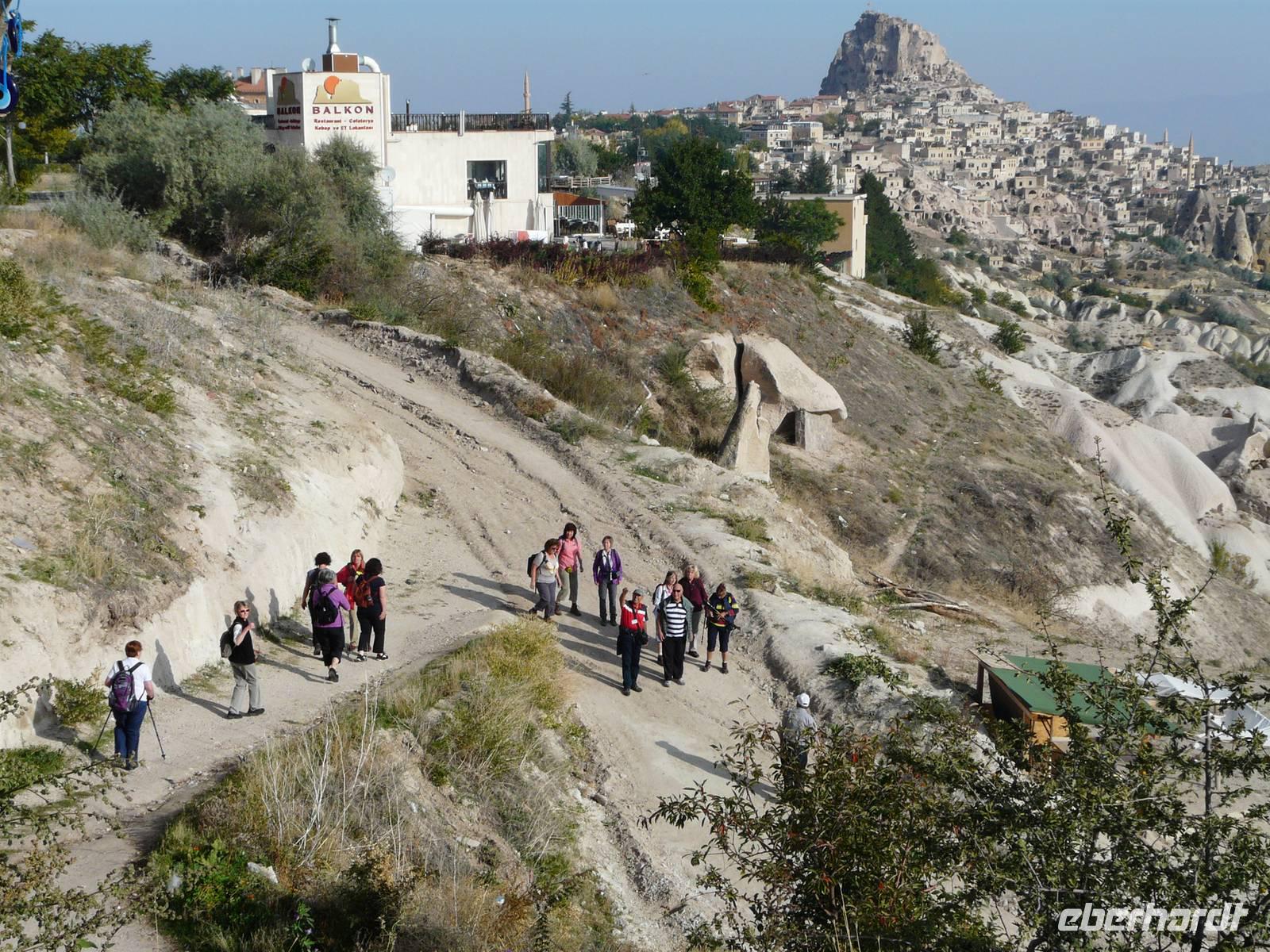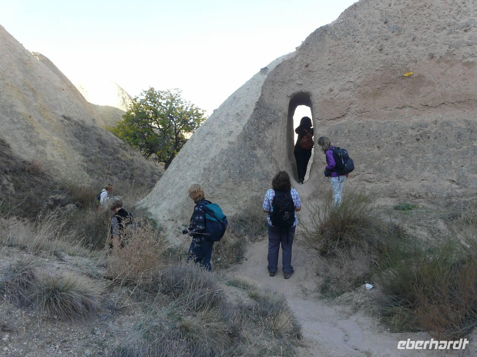 Nach einem reichhaltigen Frühstück wartet heute der erste „richtige" Wandertag auf uns. Bei strahlendem Sonnenschein fahren wir ein kurzes Stück mit dem Bus, ehe wir am Eingang zum Tal der Tauben stoppen. Hier werden erstmal die Fotoapparate gezückt. Ein kleiner Baum, geschmückt mit hunderten „Augen der Fatimah" (blaue türkische Glücksbringer), bietet ein tolles Fotomotiv. Hasan stellt uns noch kurz Ismael vor, einen kleinen Kappadokier, der uns durch das Tallabyrinth führen soll. Wir steigen hinunter ins Tal und sind zuerst überrascht, wie grün es doch hier ist. Weinanbau gehört hier genauso dazu, wie die Aufzucht von Paprika und Kürbis - alles natürlich im Kleinformat. Unsere Wanderung führt ins vorbei an eigenartigen Gebilden aus Tuffstein, überall sieht man kleine Höhlen und wir lassen es uns nicht nehmen, die ein oder andere etwas genauer zu erforschen. Der Weg schlängelt sich auf und ab, von einem Plateau aus haben wir einen atemberaubenden Blick über das canyonartige Tal, welches wir noch weiter durchwandern werden. Nach etwa einer Stunde Gehzeit kehren wir ein - nicht etwa in ein typisches Café sondern auf eine kleine Terrasse. Auf Steinen und Holzlatten liegen hier Kissen, in der Mitte ein provisorischer flacher Tisch und wir werden bestens versorgt und unterhalten. Jeder von bekommt einen türkischen Tee, dazu stehen Nüsse zum Knabbern bereit. Der Betreiber dieser kleinen Oase ist dann auch ein Original für sich! Hasan (also nicht unser Reiseleiter, sondern der Herr der uns bedient) macht mit uns ein kleines Quiz, wo wir schon zeigen können, was wir über Kappadokien und die Türkei gelernt haben oder schon wissen. Für jede richtige Antwort gibt es ein kleines Präsent und somit ein schönes Andenken an diese kleine Urlaubsepisode. Nach einer herzlichen Verabschiedung geht es zunächst weiter bergab über doch sehr rutschigen Stein und Sand. So langsam wird es auch etwas grüner. Auch scheinen wir uns schon der nächsten Stadt zu nähern - Göreme. Wir kommen in einem ruhigen Teil der Stadt an, besichtigen hier unsere erste kleine Höhlenkirche. Dann haben die Herren um uns etwas Besonderes für uns im Programm. Wir fahren zu Ismael nach Hause, wo seine Frau und sein Sohn ein typisches Essen für uns zubereiten. Wir werden herzlich empfangen, Salat und sauer Eingelegtes steht schon zum Naschen auf dem Tisch, ehe Suppe, Bulgur und Fleisch sowie süße Nachspeisen folgen. Der obligatorische Çay wird natürlich auch gereicht. Ein tolles Mittagessen!