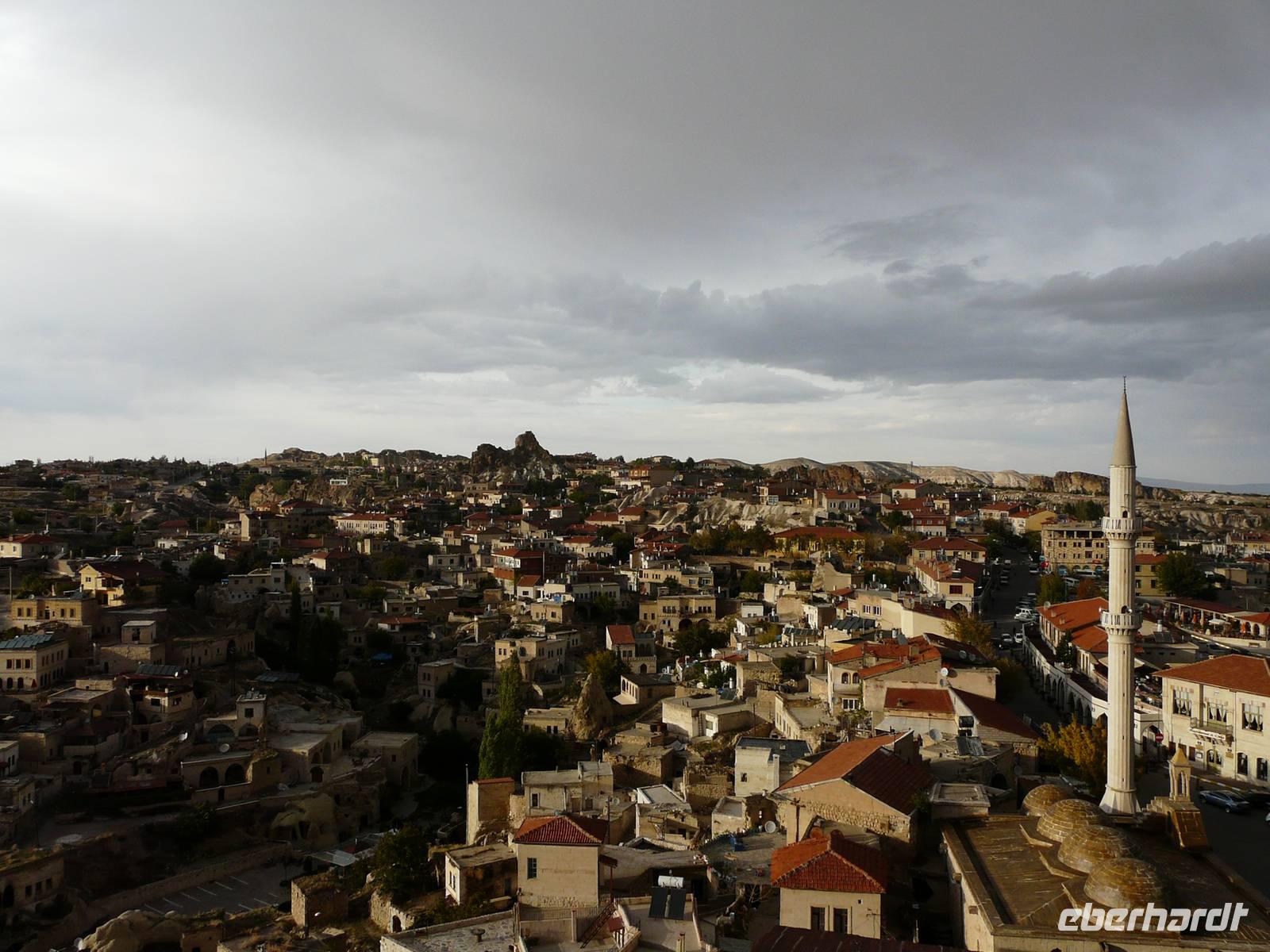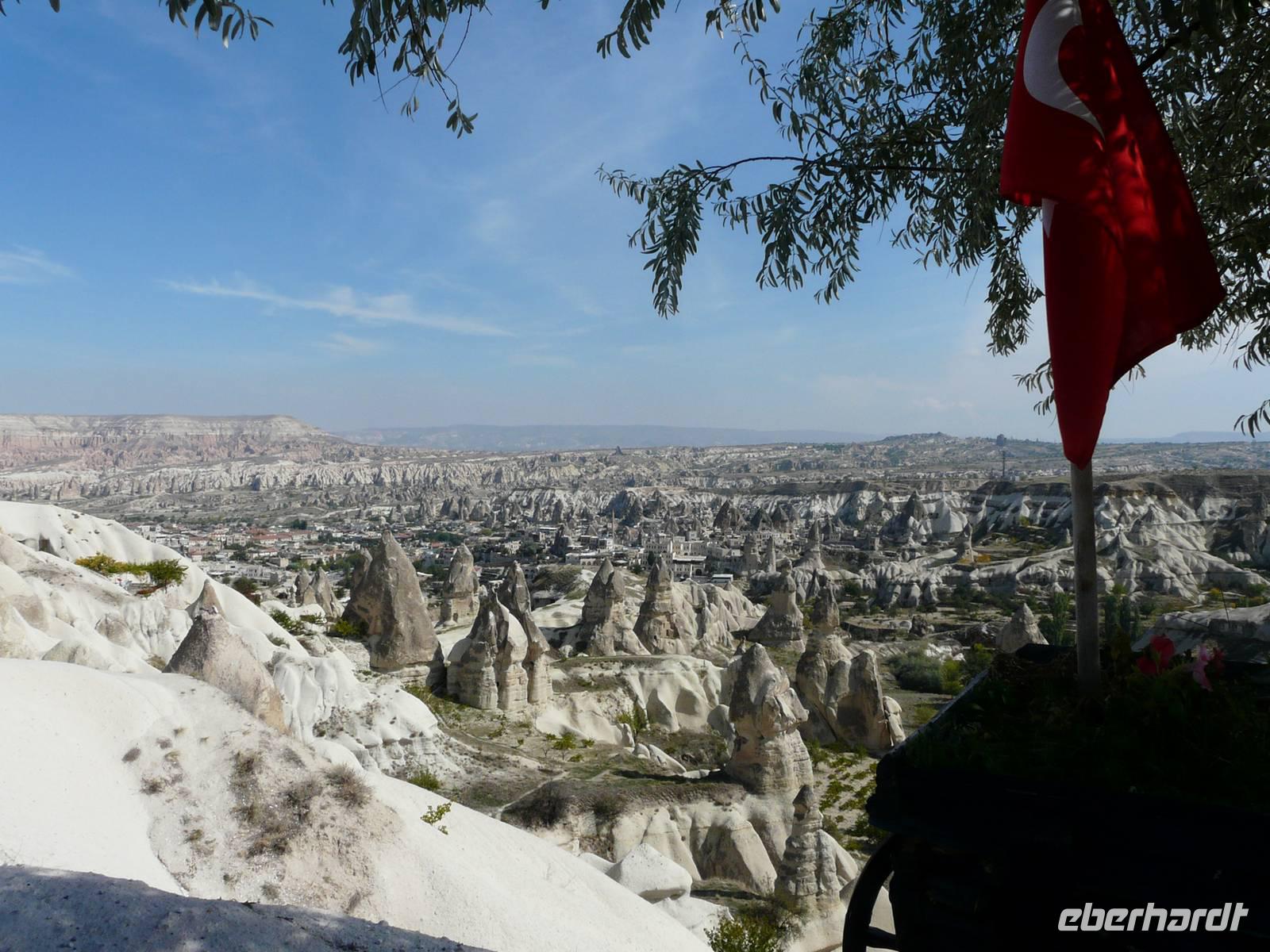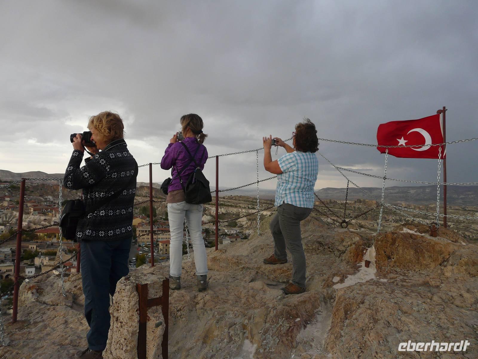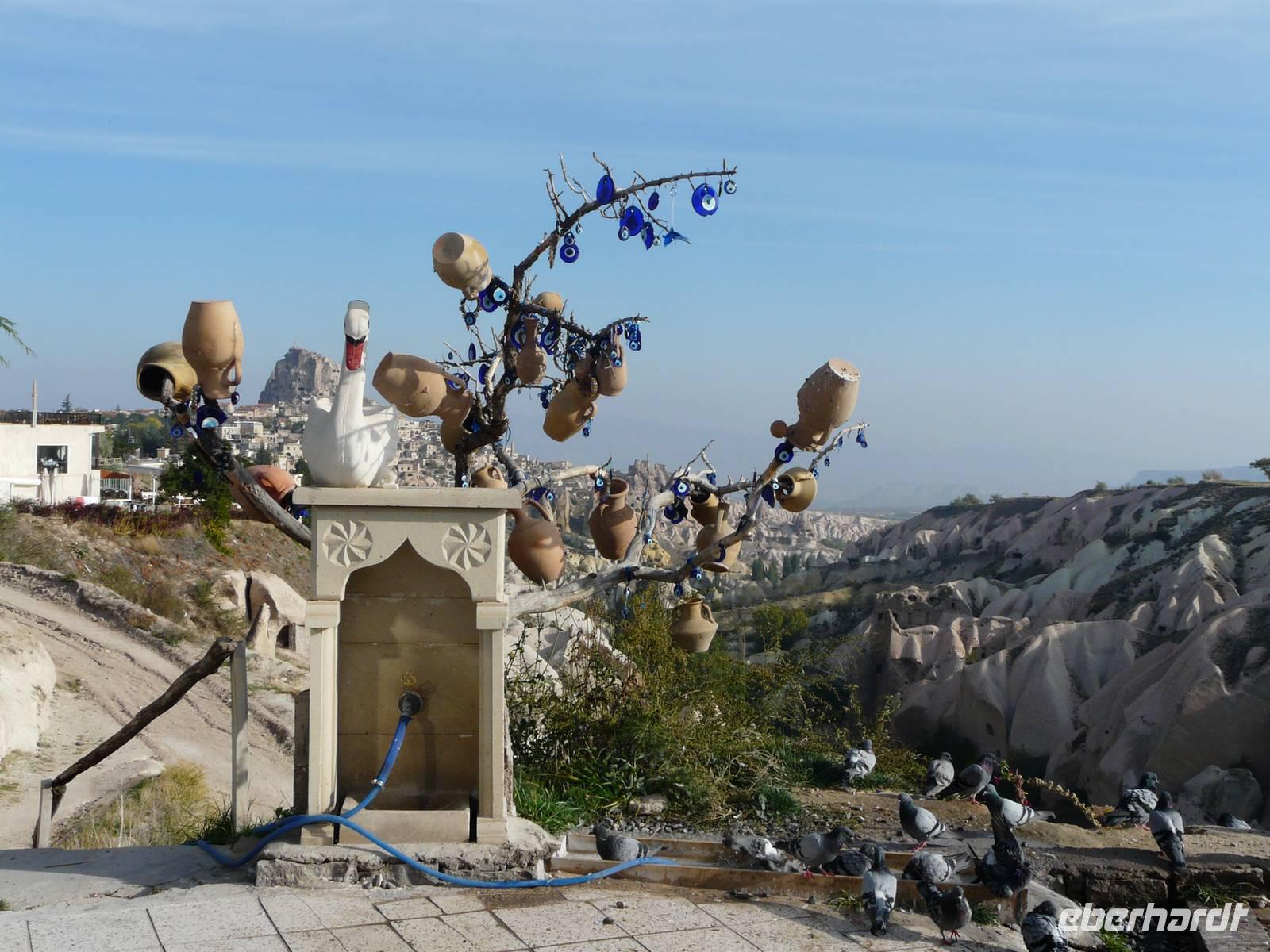 Nach einem reichhaltigen Frühstück wartet heute der erste „richtige" Wandertag auf uns. Bei strahlendem Sonnenschein fahren wir ein kurzes Stück mit dem Bus, ehe wir am Eingang zum Tal der Tauben stoppen. Hier werden erstmal die Fotoapparate gezückt. Ein kleiner Baum, geschmückt mit hunderten „Augen der Fatimah" (blaue türkische Glücksbringer), bietet ein tolles Fotomotiv. Hasan stellt uns noch kurz Ismael vor, einen kleinen Kappadokier, der uns durch das Tallabyrinth führen soll. Wir steigen hinunter ins Tal und sind zuerst überrascht, wie grün es doch hier ist. Weinanbau gehört hier genauso dazu, wie die Aufzucht von Paprika und Kürbis - alles natürlich im Kleinformat. Unsere Wanderung führt ins vorbei an eigenartigen Gebilden aus Tuffstein, überall sieht man kleine Höhlen und wir lassen es uns nicht nehmen, die ein oder andere etwas genauer zu erforschen. Der Weg schlängelt sich auf und ab, von einem Plateau aus haben wir einen atemberaubenden Blick über das canyonartige Tal, welches wir noch weiter durchwandern werden. Nach etwa einer Stunde Gehzeit kehren wir ein - nicht etwa in ein typisches Café sondern auf eine kleine Terrasse. Auf Steinen und Holzlatten liegen hier Kissen, in der Mitte ein provisorischer flacher Tisch und wir werden bestens versorgt und unterhalten. Jeder von bekommt einen türkischen Tee, dazu stehen Nüsse zum Knabbern bereit. Der Betreiber dieser kleinen Oase ist dann auch ein Original für sich! Hasan (also nicht unser Reiseleiter, sondern der Herr der uns bedient) macht mit uns ein kleines Quiz, wo wir schon zeigen können, was wir über Kappadokien und die Türkei gelernt haben oder schon wissen. Für jede richtige Antwort gibt es ein kleines Präsent und somit ein schönes Andenken an diese kleine Urlaubsepisode. Nach einer herzlichen Verabschiedung geht es zunächst weiter bergab über doch sehr rutschigen Stein und Sand. So langsam wird es auch etwas grüner. Auch scheinen wir uns schon der nächsten Stadt zu nähern - Göreme. Wir kommen in einem ruhigen Teil der Stadt an, besichtigen hier unsere erste kleine Höhlenkirche. Dann haben die Herren um uns etwas Besonderes für uns im Programm. Wir fahren zu Ismael nach Hause, wo seine Frau und sein Sohn ein typisches Essen für uns zubereiten. Wir werden herzlich empfangen, Salat und sauer Eingelegtes steht schon zum Naschen auf dem Tisch, ehe Suppe, Bulgur und Fleisch sowie süße Nachspeisen folgen. Der obligatorische Çay wird natürlich auch gereicht. Ein tolles Mittagessen!