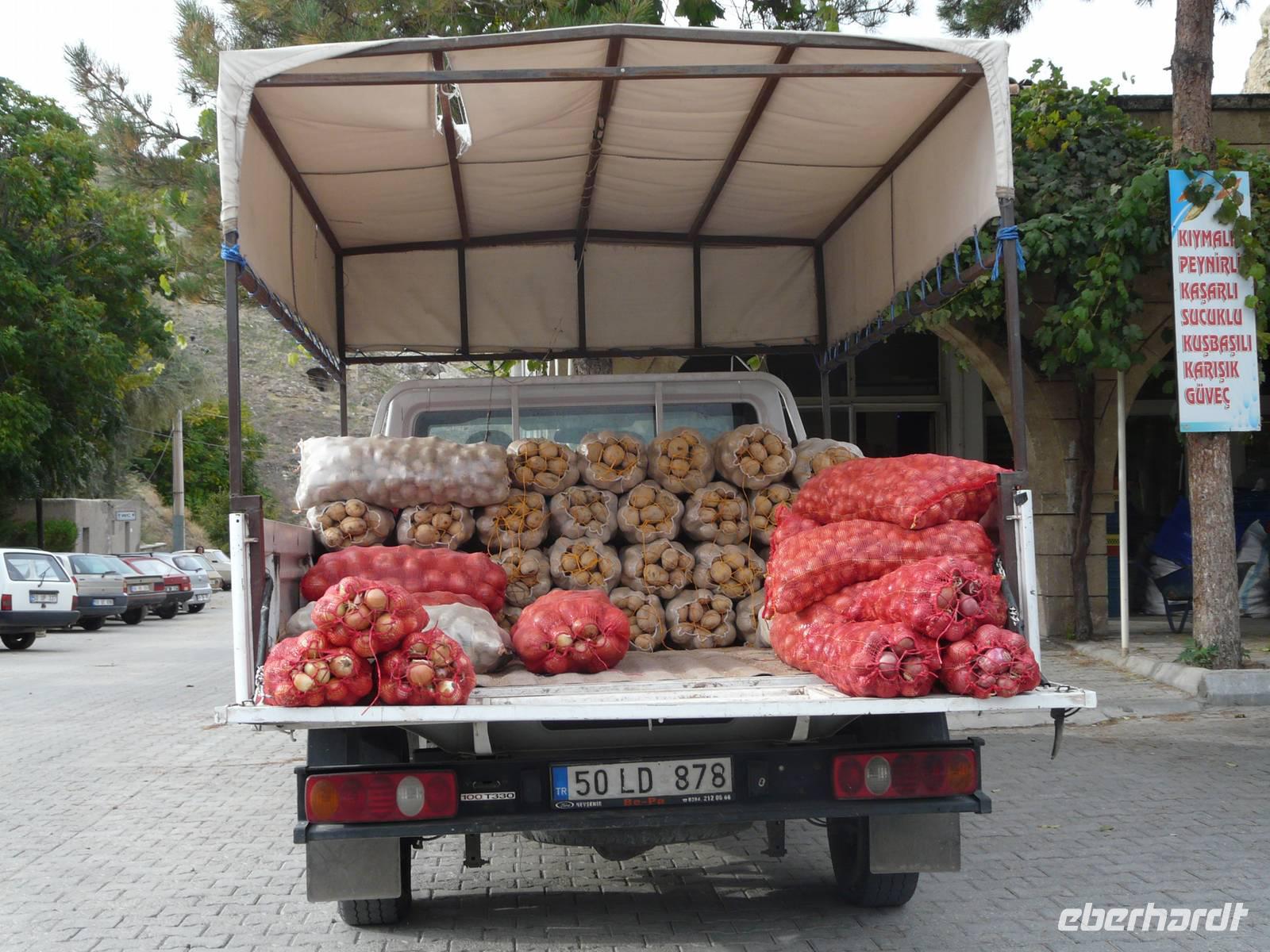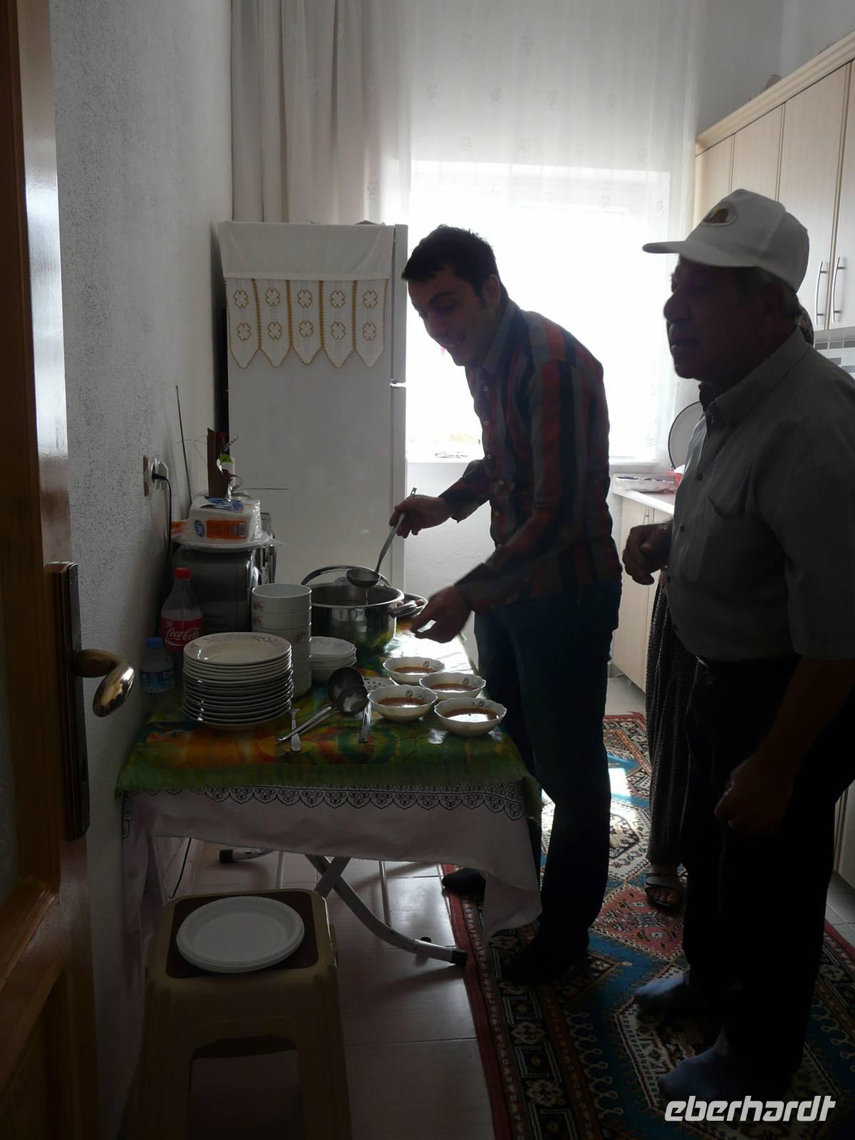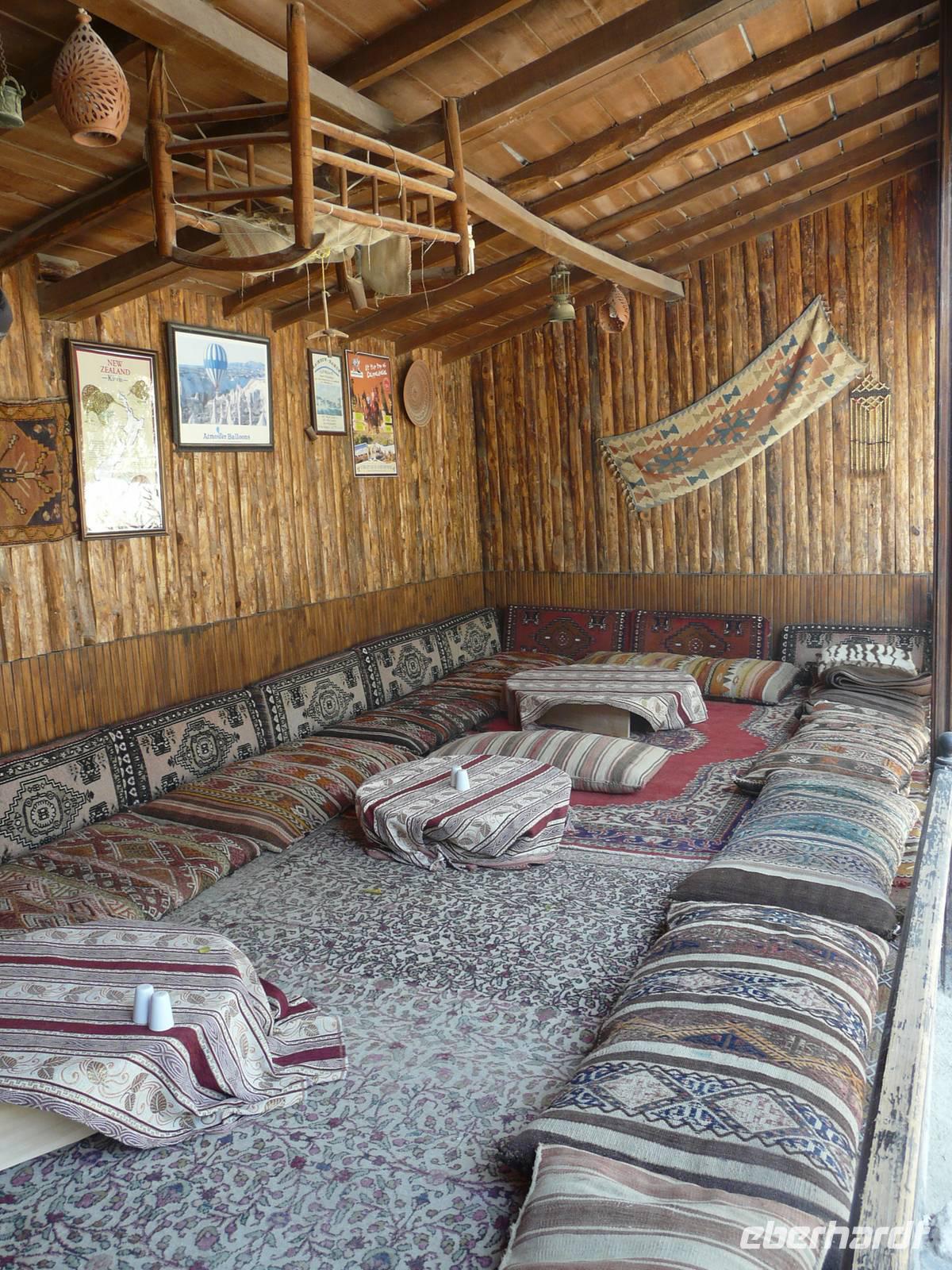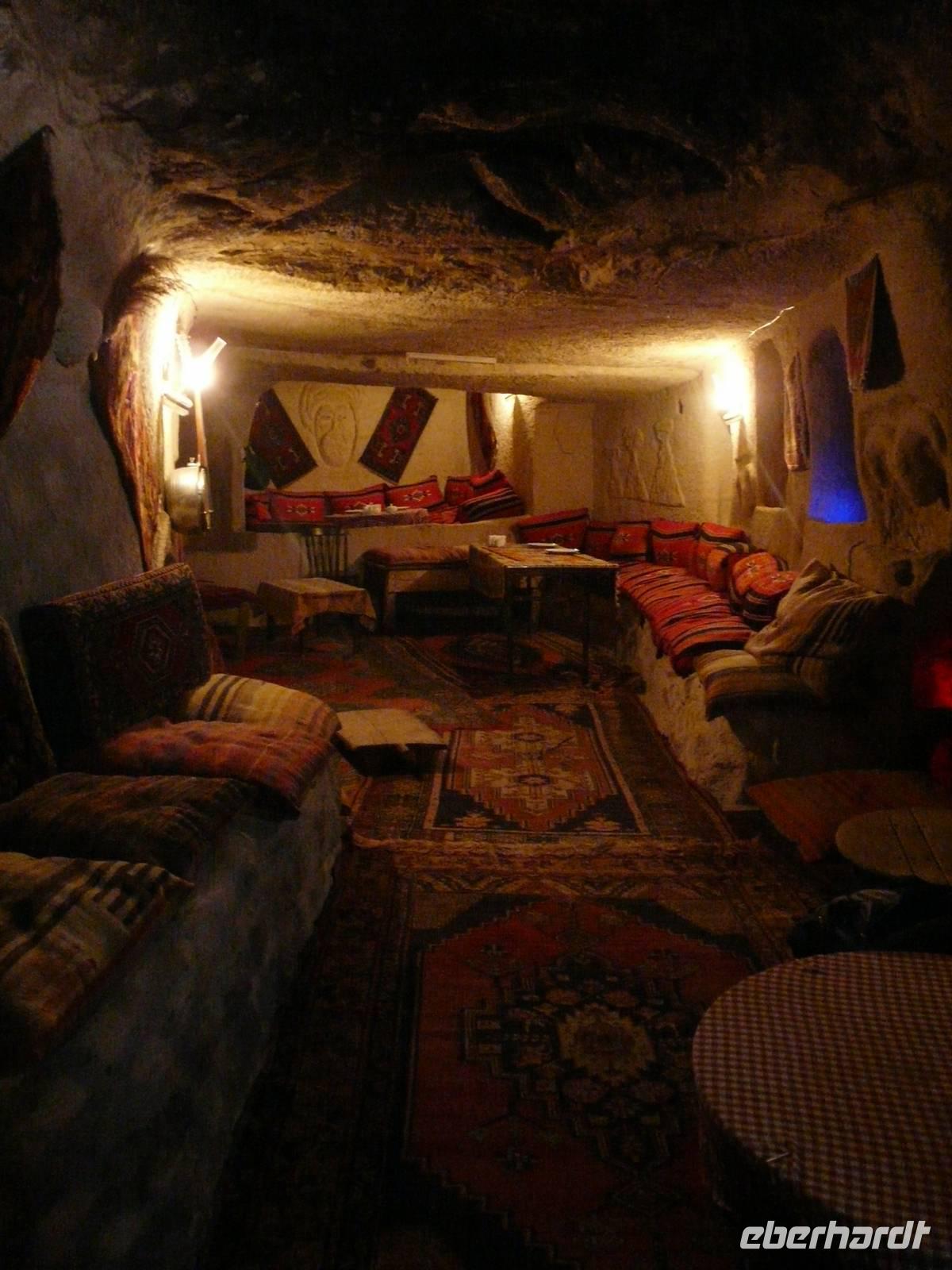 Nach einem reichhaltigen Frühstück wartet heute der erste „richtige" Wandertag auf uns. Bei strahlendem Sonnenschein fahren wir ein kurzes Stück mit dem Bus, ehe wir am Eingang zum Tal der Tauben stoppen. Hier werden erstmal die Fotoapparate gezückt. Ein kleiner Baum, geschmückt mit hunderten „Augen der Fatimah" (blaue türkische Glücksbringer), bietet ein tolles Fotomotiv. Hasan stellt uns noch kurz Ismael vor, einen kleinen Kappadokier, der uns durch das Tallabyrinth führen soll. Wir steigen hinunter ins Tal und sind zuerst überrascht, wie grün es doch hier ist. Weinanbau gehört hier genauso dazu, wie die Aufzucht von Paprika und Kürbis - alles natürlich im Kleinformat. Unsere Wanderung führt ins vorbei an eigenartigen Gebilden aus Tuffstein, überall sieht man kleine Höhlen und wir lassen es uns nicht nehmen, die ein oder andere etwas genauer zu erforschen. Der Weg schlängelt sich auf und ab, von einem Plateau aus haben wir einen atemberaubenden Blick über das canyonartige Tal, welches wir noch weiter durchwandern werden. Nach etwa einer Stunde Gehzeit kehren wir ein - nicht etwa in ein typisches Café sondern auf eine kleine Terrasse. Auf Steinen und Holzlatten liegen hier Kissen, in der Mitte ein provisorischer flacher Tisch und wir werden bestens versorgt und unterhalten. Jeder von bekommt einen türkischen Tee, dazu stehen Nüsse zum Knabbern bereit. Der Betreiber dieser kleinen Oase ist dann auch ein Original für sich! Hasan (also nicht unser Reiseleiter, sondern der Herr der uns bedient) macht mit uns ein kleines Quiz, wo wir schon zeigen können, was wir über Kappadokien und die Türkei gelernt haben oder schon wissen. Für jede richtige Antwort gibt es ein kleines Präsent und somit ein schönes Andenken an diese kleine Urlaubsepisode. Nach einer herzlichen Verabschiedung geht es zunächst weiter bergab über doch sehr rutschigen Stein und Sand. So langsam wird es auch etwas grüner. Auch scheinen wir uns schon der nächsten Stadt zu nähern - Göreme. Wir kommen in einem ruhigen Teil der Stadt an, besichtigen hier unsere erste kleine Höhlenkirche. Dann haben die Herren um uns etwas Besonderes für uns im Programm. Wir fahren zu Ismael nach Hause, wo seine Frau und sein Sohn ein typisches Essen für uns zubereiten. Wir werden herzlich empfangen, Salat und sauer Eingelegtes steht schon zum Naschen auf dem Tisch, ehe Suppe, Bulgur und Fleisch sowie süße Nachspeisen folgen. Der obligatorische Çay wird natürlich auch gereicht. Ein tolles Mittagessen!
