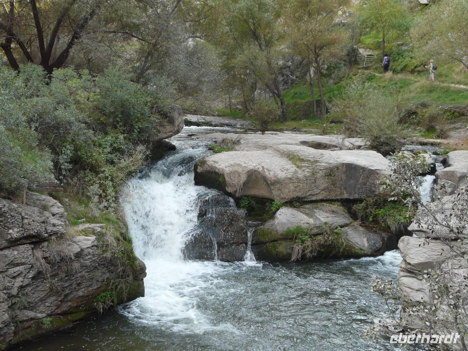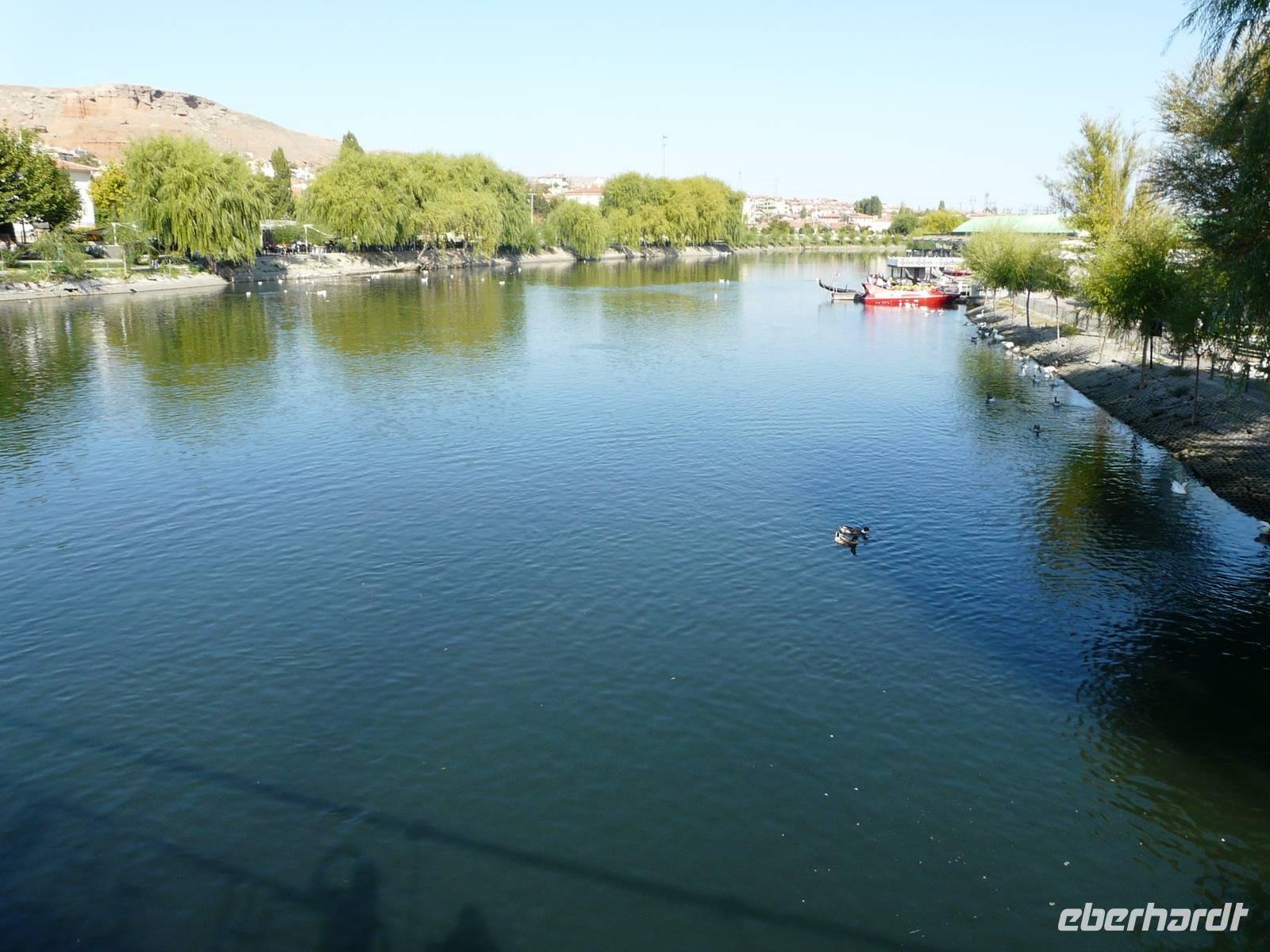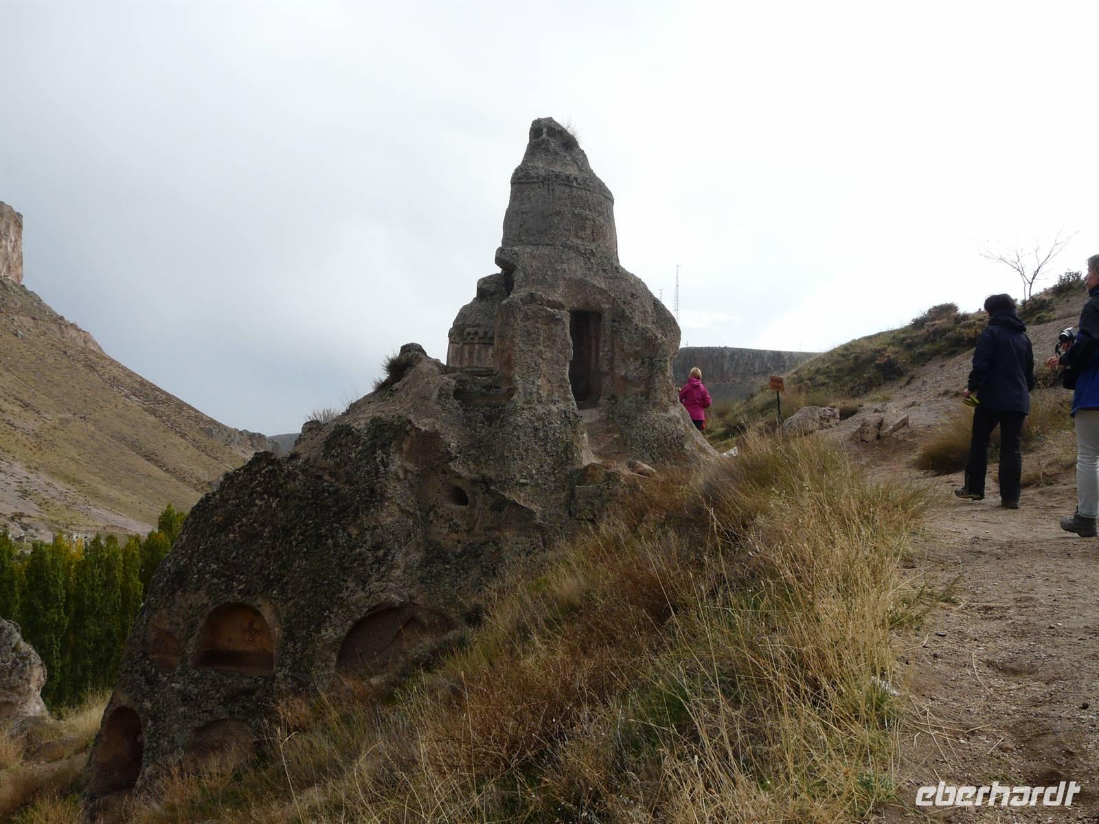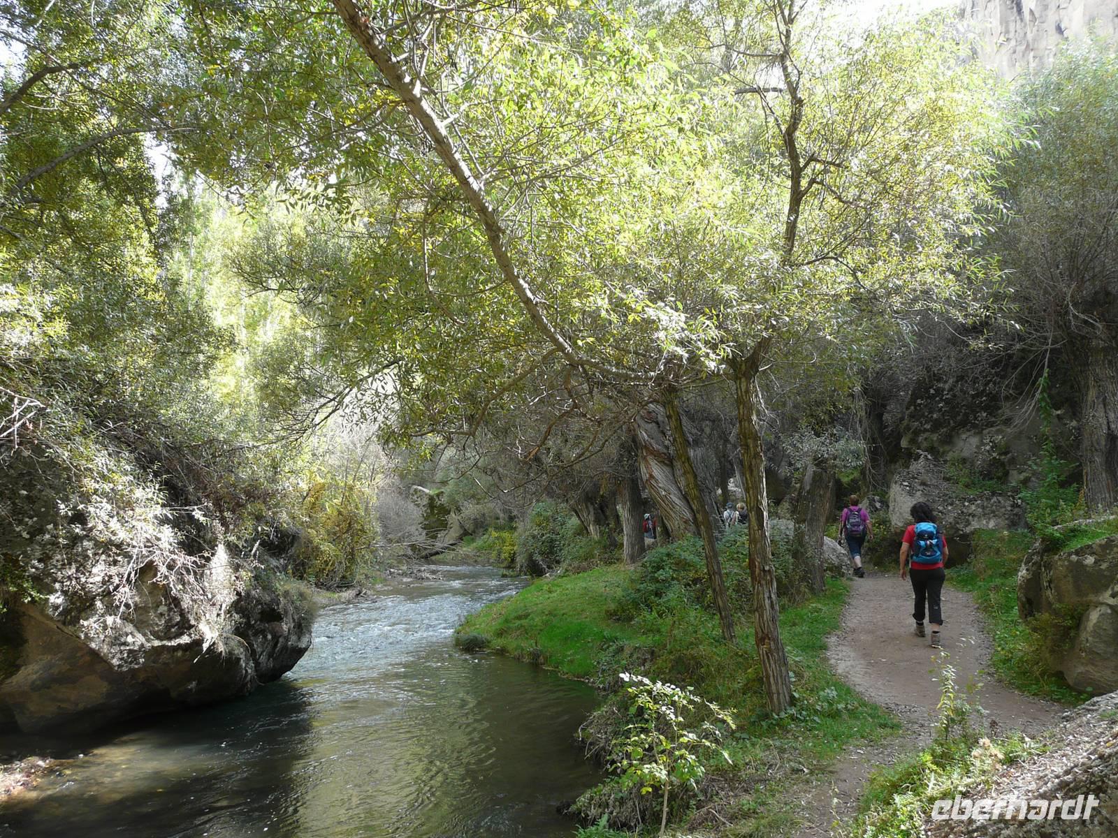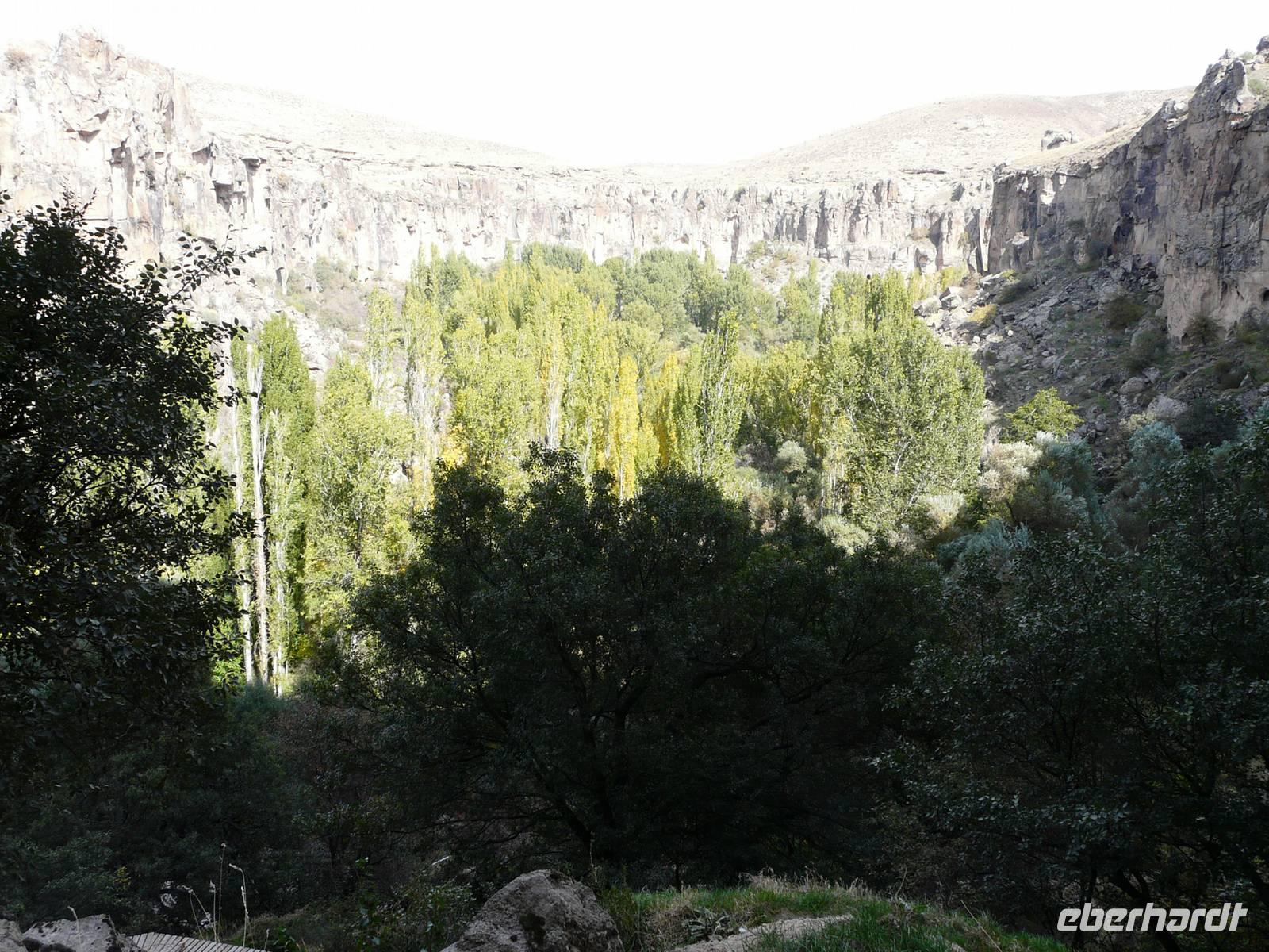 Da wir die Aufsteh- und Frühstückszeiten mittlerweile schon im Blut haben, benötigen wir alle eigentlich kaum noch einen Wecker. So geht es auch heute um halb neun wieder auf Entdeckungstour. Der erste Tagespunkt ist die Teppichknüpferei Matis gleich am Stadtrand von Ortahisar. Der Inhaber begrüßt uns freundlich und im Folgenden sehen wir wie Seide gewonnen und Teppiche nach Mustervorgaben hergestellt werden. Es ist ein unglaublich schwieriges Handwerk und wir können bald nachvollziehen, warum viele dieser Teppiche so einen stolzen Preis haben. Uns werden viele gezeigt, ob orientalisch oder modern oder sogar patchwork, für jeden Geschmack ist etwas dabei - nur nicht für jeden Geldbeutel. Und so vertrödeln wir leider eine Menge Zeit mit Teppichen, anstatt die fantastische Landschaft genießen zu können. Doch glücklicherweise haben wir ja noch andere Programmpunkte. Nach einer langen Fahrt mit einem erstmal kurzen Zwischenstopp in Derinkuyu erreichen wir die Ihlara-Schlucht. Da es nun schon langsam Mittag ist, entscheiden wir vor der Wanderung zu essen. Hasaen führt uns also erneut in ein tolles Lokal. Auf einer kleinen Terrasse essen wir heute über dem Wasser des Melendiz-Flusses, ein sehr ruhiger und entspannter Ort. Unsere Wanderung entlang des Flusses wird dann anfangs etwas unruhiger. Die bekannte Schlucht zieht natürlich auch viele Menschen an, die typische Strecke verläuft uns genau entgegen und so haben wir oftmals mit Gegenverkehr zu kämpfen. Doch je länger wir laufen, desto ruhiger wird es und irgendwann scheint es, als wären wir fast allein in der Schlucht. Wir genießen das fast schon herbstlich anmutende Wetter und so fällt auch der letzte Anstieg weniger anstrengend als gedacht aus.