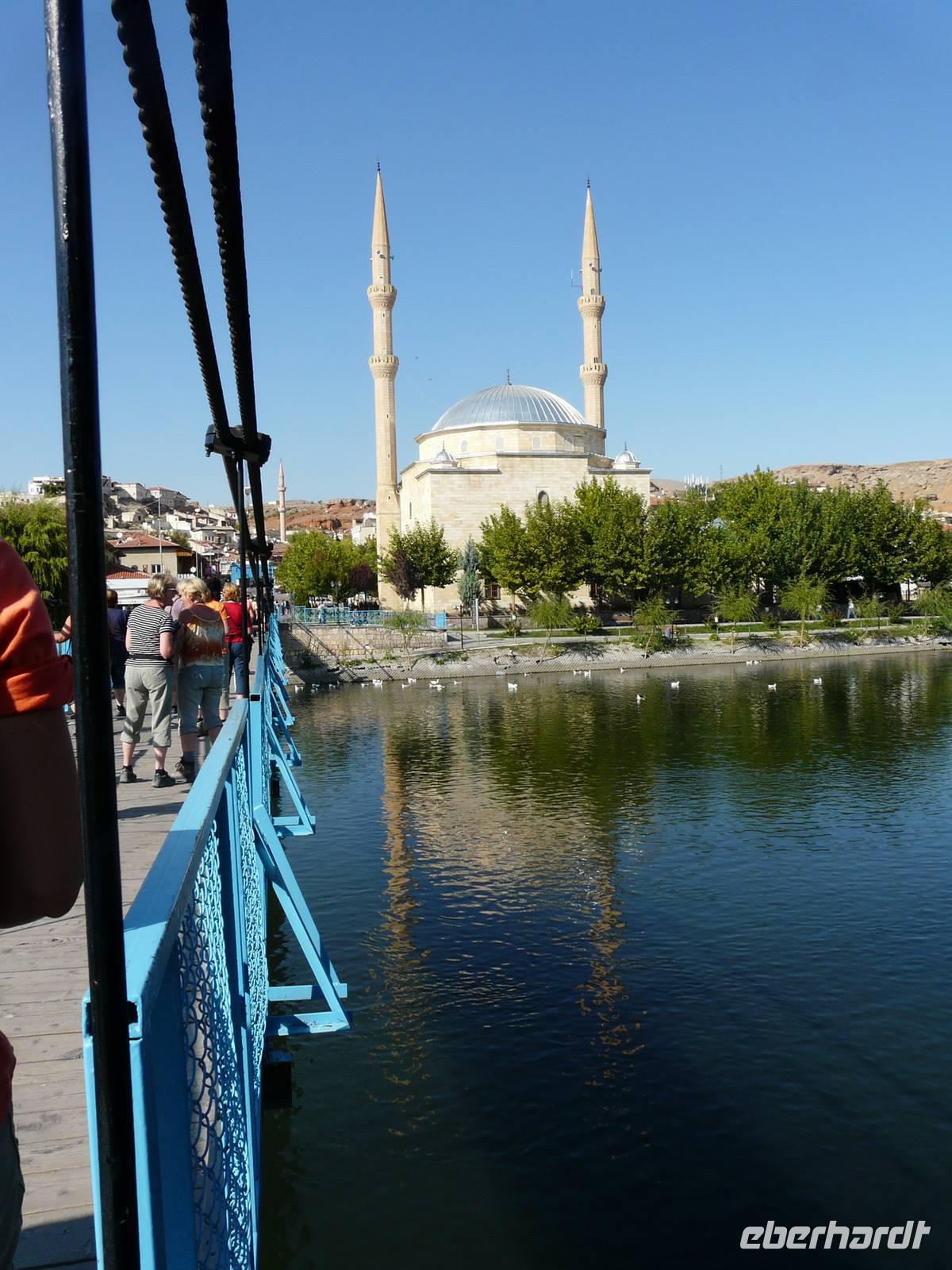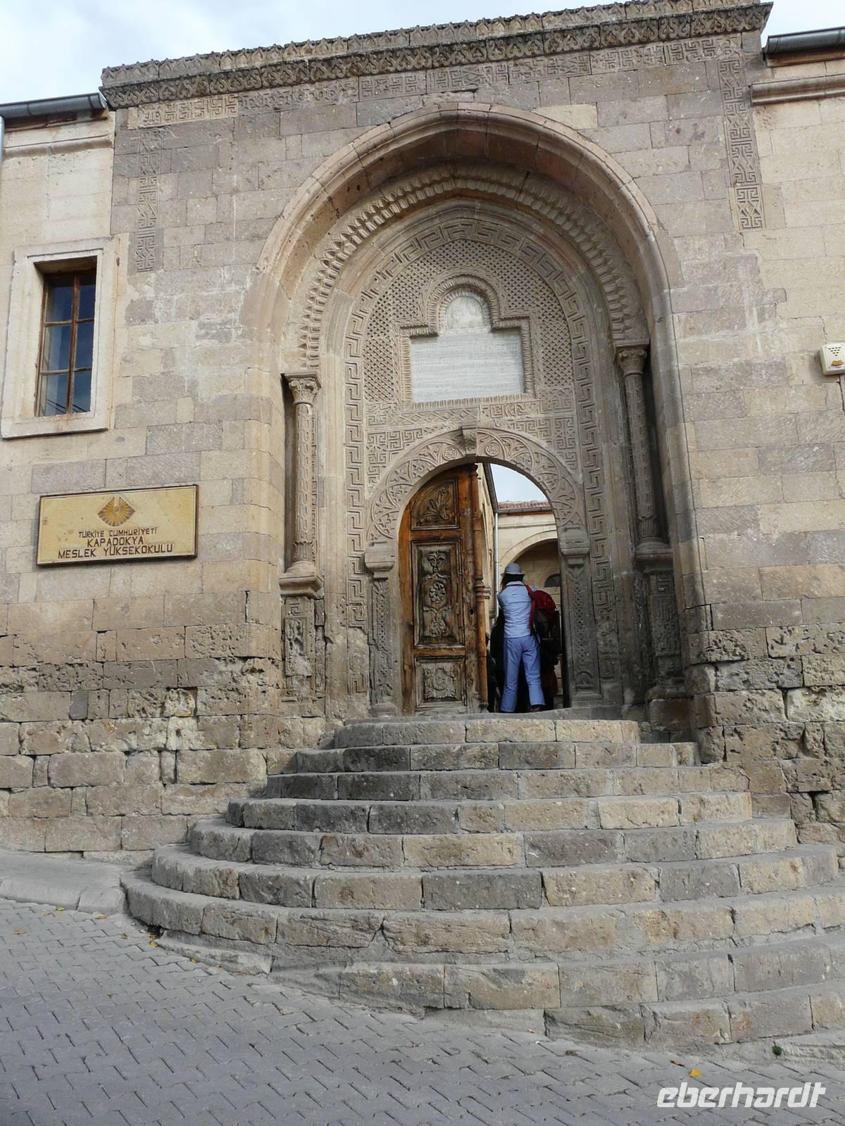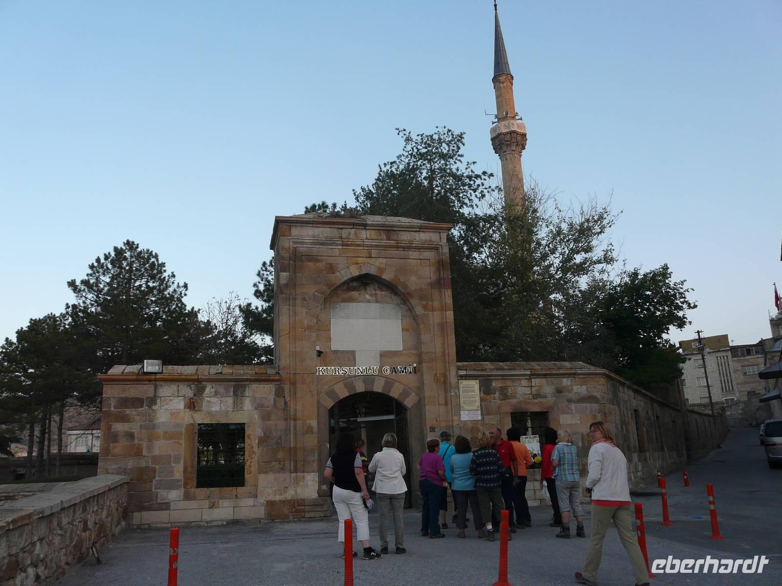 Nach der Wanderung geht es langsam zurück durch die trockene und karge Landschaft, schließlich wollen wir uns noch die unterirdische Stadt anschauen. Angekommen in Derinkuyu sind die Menschenmassen weg und in das kleine Städtchen ist Ruhe eingekehrt. So können wir ohne Anstehen hinunter, steigen hinab über schmale Treppen und enge Gänge, ehe wir in einem großeren Raum ankommen. In dieser unterirdischen Kirche erklärt uns Hasan einiges über Entstehung und Nutzung dieser Räume und wir haben noch etwas Zeit, um in den kleinen Ecken zu luken und unsere Neugier zu stillen. Mit kleinen Zwischenstopps begeben wir uns langsam wieder nach oben, vorbei an Vorratsräumen und sogar Ställen! Nichtsdestotrotz sind wir irgendwie dann doch alle froh, wieder das Tageslicht sehen zu können. Wir bummeln noch etwas an den Verkaufsständen entlang ehe wir die letzte Tagesetappe in Angriff nehmen. Hasan hat etwas am Programm hin und her geschoben und so machen wir heute schon auf dem Rückweg Halt in Nevsehir. Nach einem kurzen Spaziergang besichtigen wir eine der größten Moscheen der Stadt, schließlich ist der Islam und die morgendlichen Rufe des Muezzin Teil der türkischen Kultur.