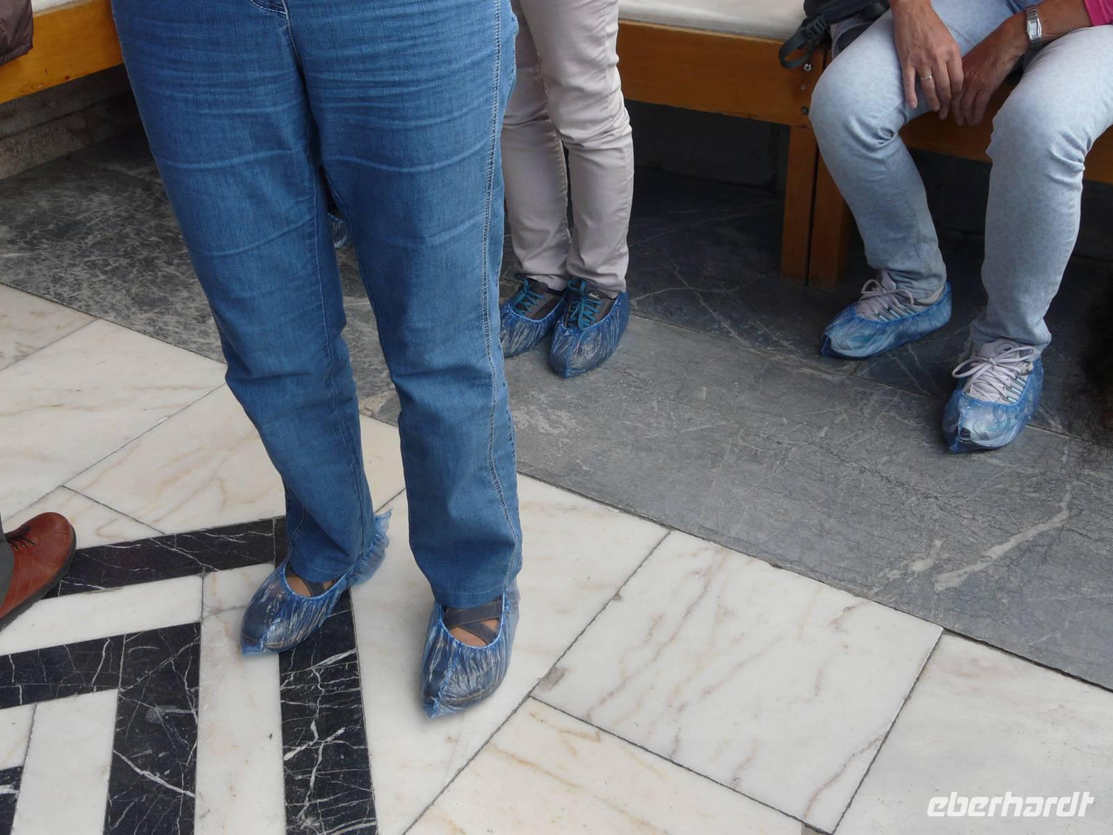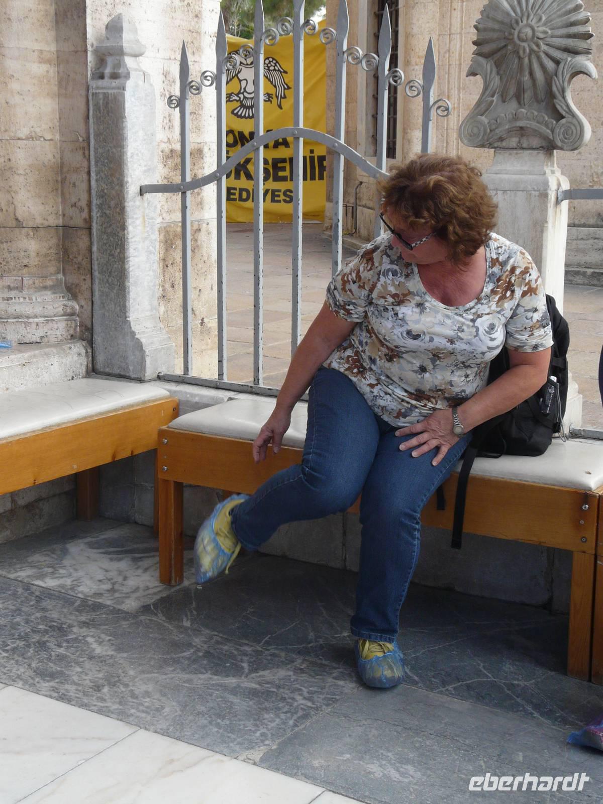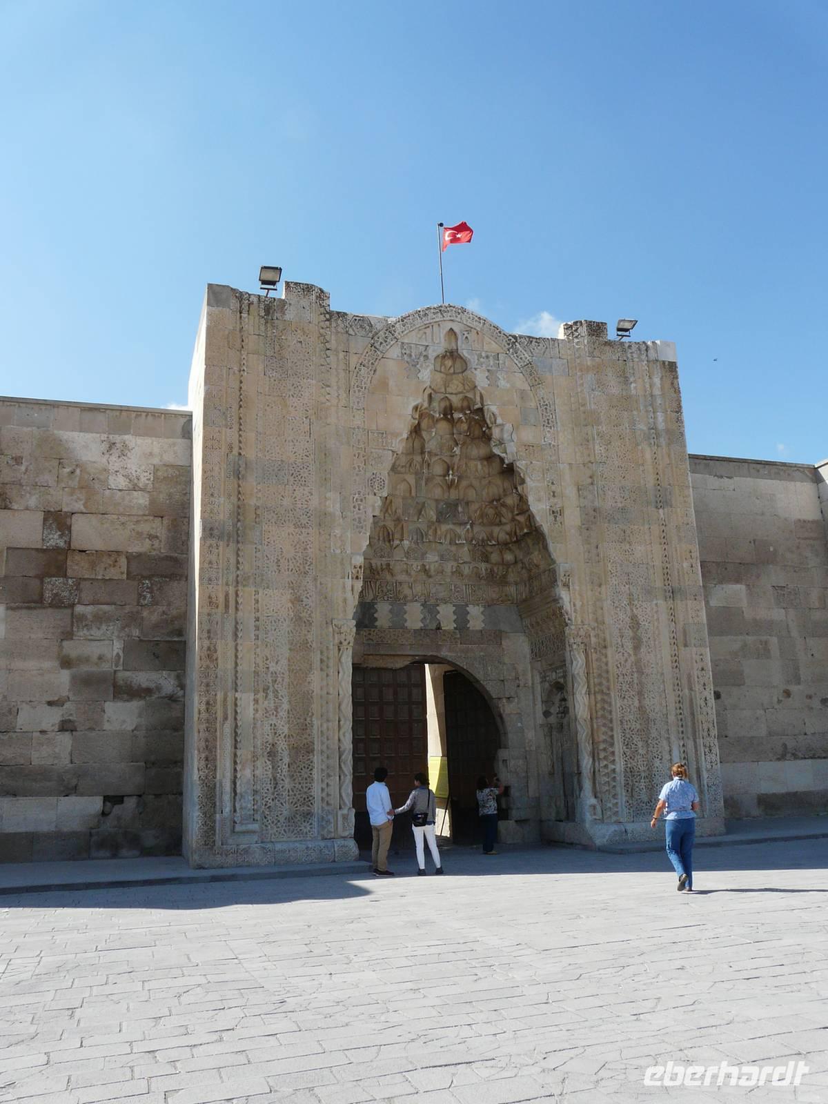 Nach der Wanderung geht es langsam zurück durch die trockene und karge Landschaft, schließlich wollen wir uns noch die unterirdische Stadt anschauen. Angekommen in Derinkuyu sind die Menschenmassen weg und in das kleine Städtchen ist Ruhe eingekehrt. So können wir ohne Anstehen hinunter, steigen hinab über schmale Treppen und enge Gänge, ehe wir in einem großeren Raum ankommen. In dieser unterirdischen Kirche erklärt uns Hasan einiges über Entstehung und Nutzung dieser Räume und wir haben noch etwas Zeit, um in den kleinen Ecken zu luken und unsere Neugier zu stillen. Mit kleinen Zwischenstopps begeben wir uns langsam wieder nach oben, vorbei an Vorratsräumen und sogar Ställen! Nichtsdestotrotz sind wir irgendwie dann doch alle froh, wieder das Tageslicht sehen zu können. Wir bummeln noch etwas an den Verkaufsständen entlang ehe wir die letzte Tagesetappe in Angriff nehmen. Hasan hat etwas am Programm hin und her geschoben und so machen wir heute schon auf dem Rückweg Halt in Nevsehir. Nach einem kurzen Spaziergang besichtigen wir eine der größten Moscheen der Stadt, schließlich ist der Islam und die morgendlichen Rufe des Muezzin Teil der türkischen Kultur.